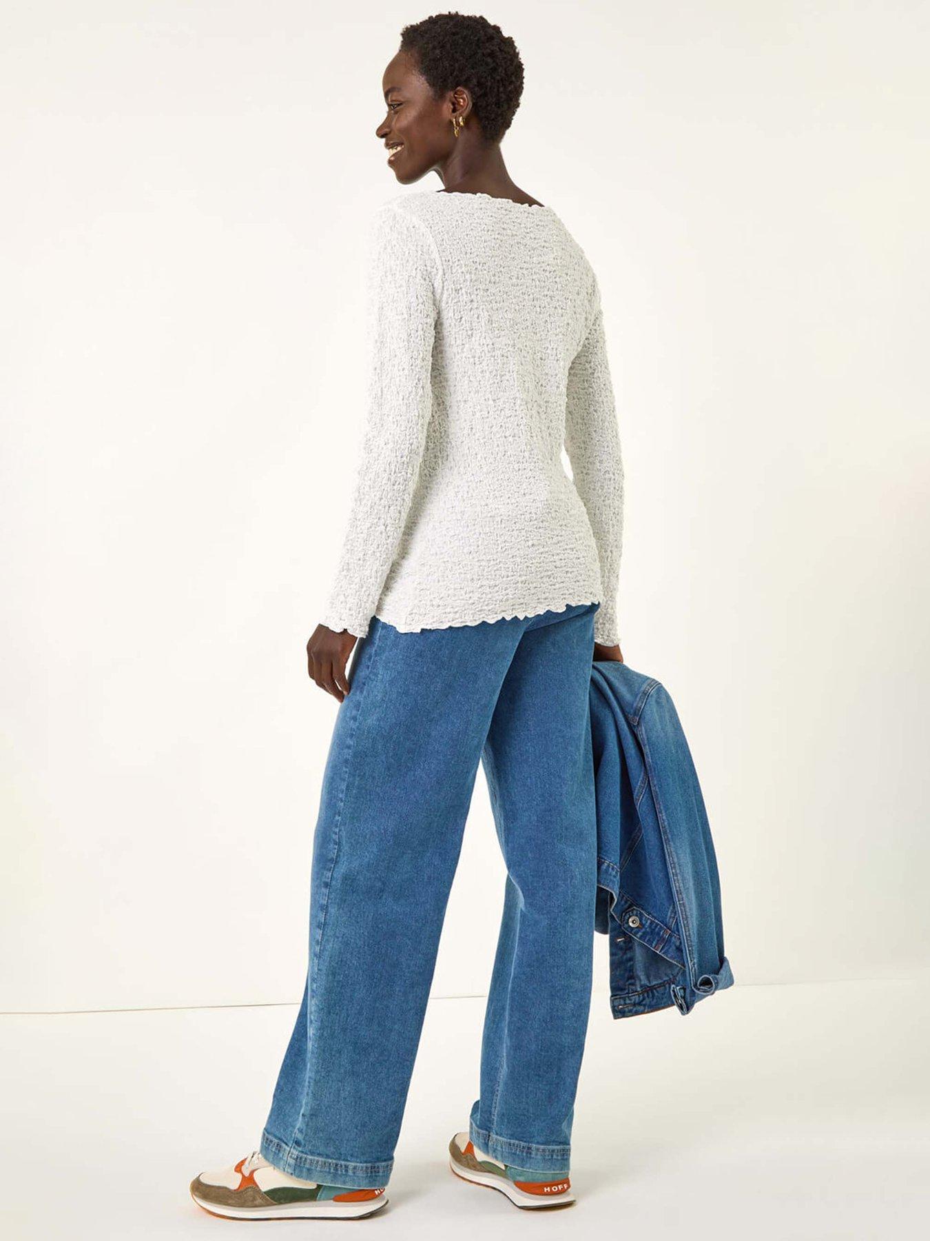 Roman Textured Bubble Crepe Lettuce Edge Top - WhiteUpdate your Autumn/Winter wardrobe with this chic textured long sleeve top. Crafted from a stretchy bubble crepe fabric this top features a unique lettuce edge detail that adds a fun touch to your look. The long sleeves provide warmth and style making it a versatile piece. Pair this top with jeans and ankle boots for a casual yet stylish outfit that's perfect for the colder seasons!