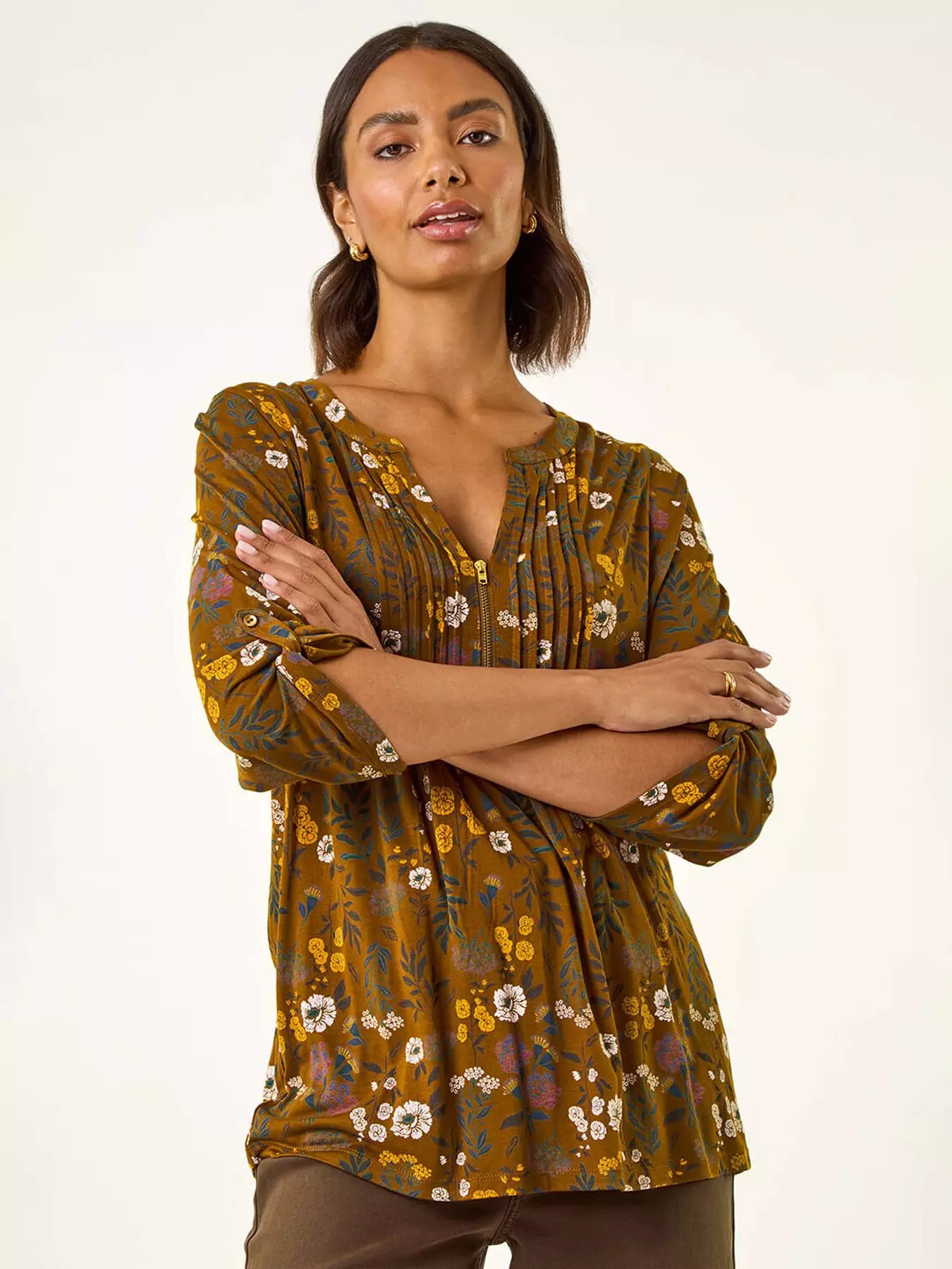 Add a touch of texture to your Autumn/Winter wardrobe with this chic printed top. Featuring a stylish notch neckline and elegant 3/4 sleeves this top is elevated with a subtle zip detail for added flair. The pintuck front adds a sophisticated touch to this versatile piece. Pair with tailored trousers and trainers for a stylish and comfortable casual look that's perfect for the season.- Material Content: 100% Viscose