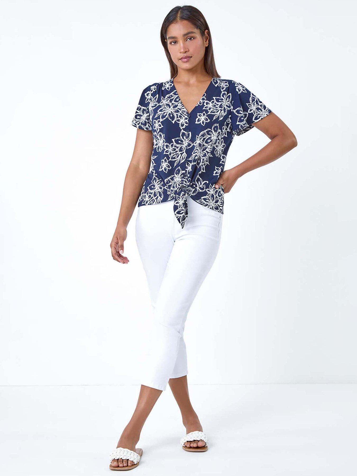 Roman Textured Floral Print Tie Front Top - NavyAdd some feminine florals to your new season collection with this floral print tie front top. Cut from a textured stretch jersey fabric this piece features a flattering v-neckline and sweet short sleeves. Button details adorn the front of this puff print piece as well as a flattering tie at the waist to cinch in your figure. Pair with jeans or shorts with sandals for a Summer ready outfit in a flash!