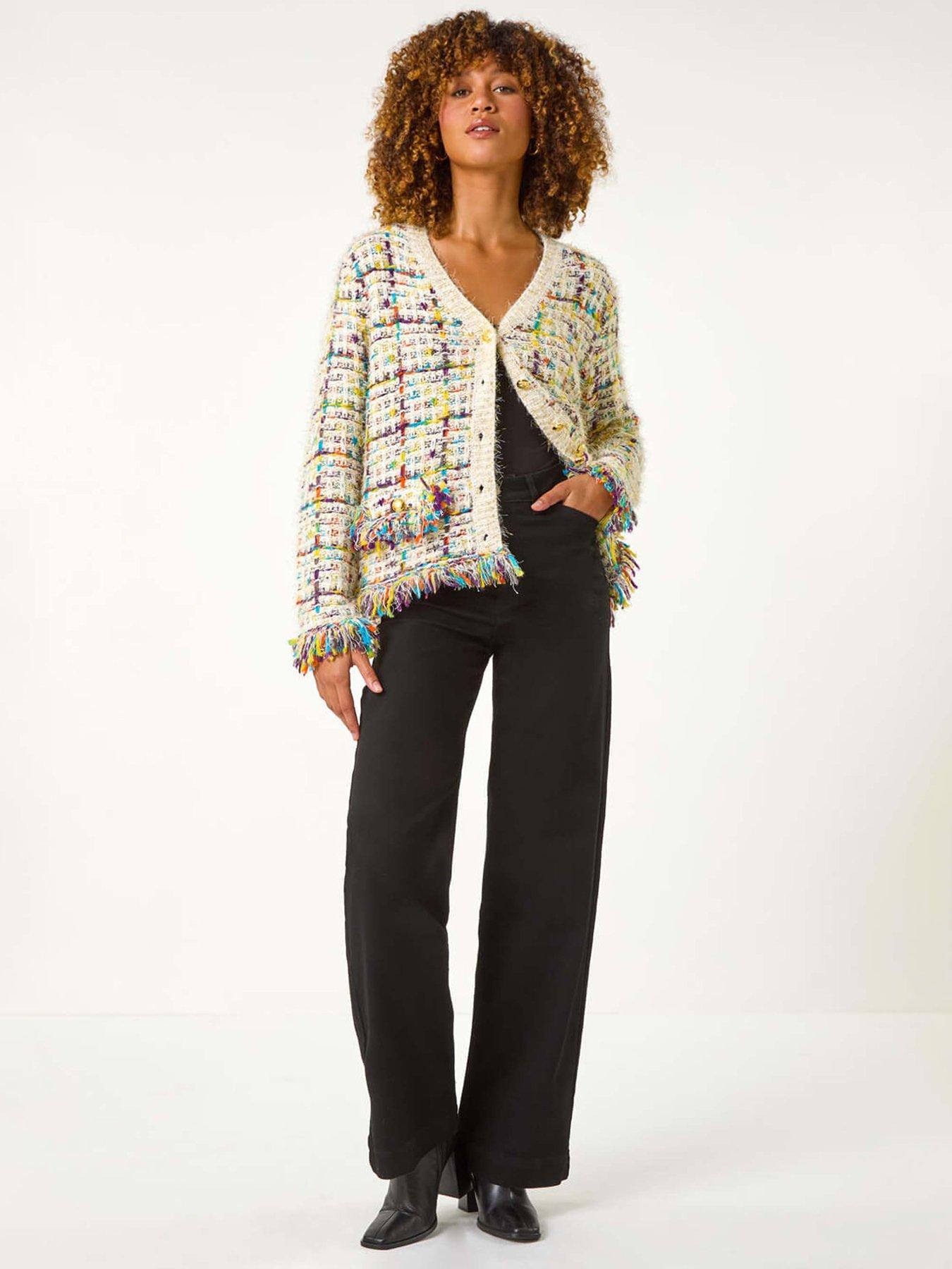 Roman Textured Fringe Knit Cardigan - IvoryWrap yourself in cosy style with this textured fringe cardigan the perfect layering piece for the Autumn and Winter season. Designed with a flattering V-Neck and featuring trendy fringe detailing this piece adds a touch of boho chic to any outfit. Practical front pockets elevate the functional aspect of this piece. Pair it with a simple t-shirt and your favourite jeans for an effortlessly stylish look that will keep you warm and fashionable all season long!