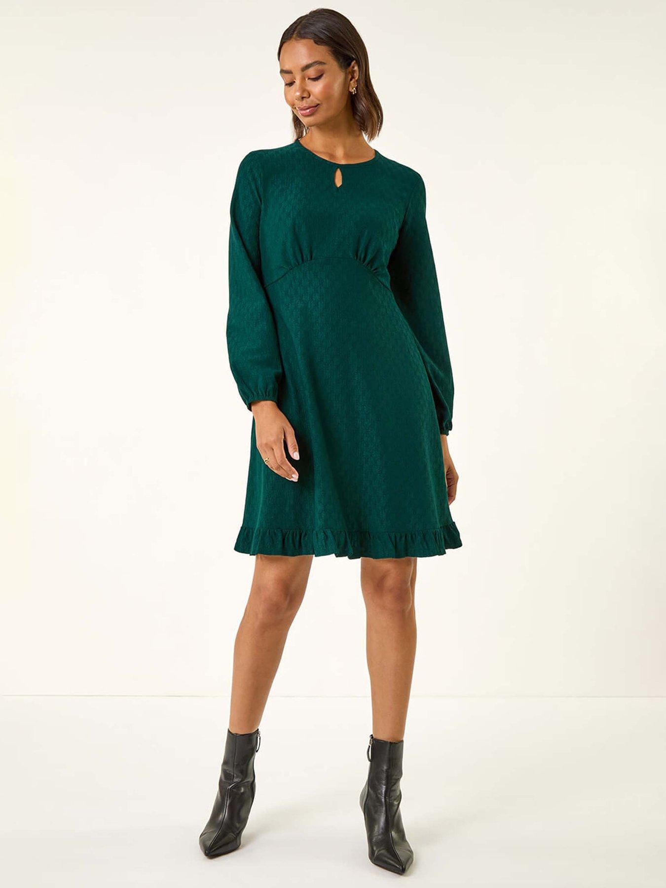 Roman Textured Spot Keyhole Dress - BlueMake a stylish statement this Autumn/Winter season in this spot print keyhole detail dress. Featuring a flattering empire waist and a fit and flare shape this knee-length dress is designed with a charming frill hem. The dress has elegant details such as a round neck and long sleeves with elasticated cuffs for a comfortable fit. Complete this chic look by pairing it with tights and ankle boots for a fashionable ensemble that's perfect for any occasion!