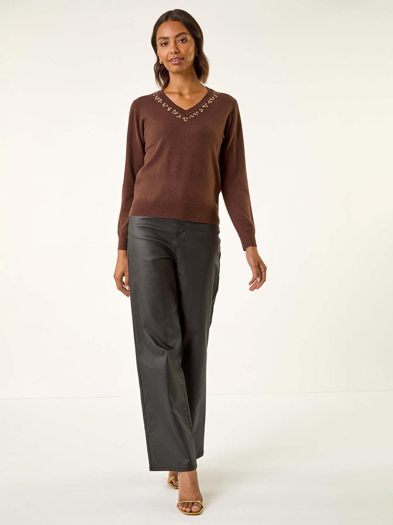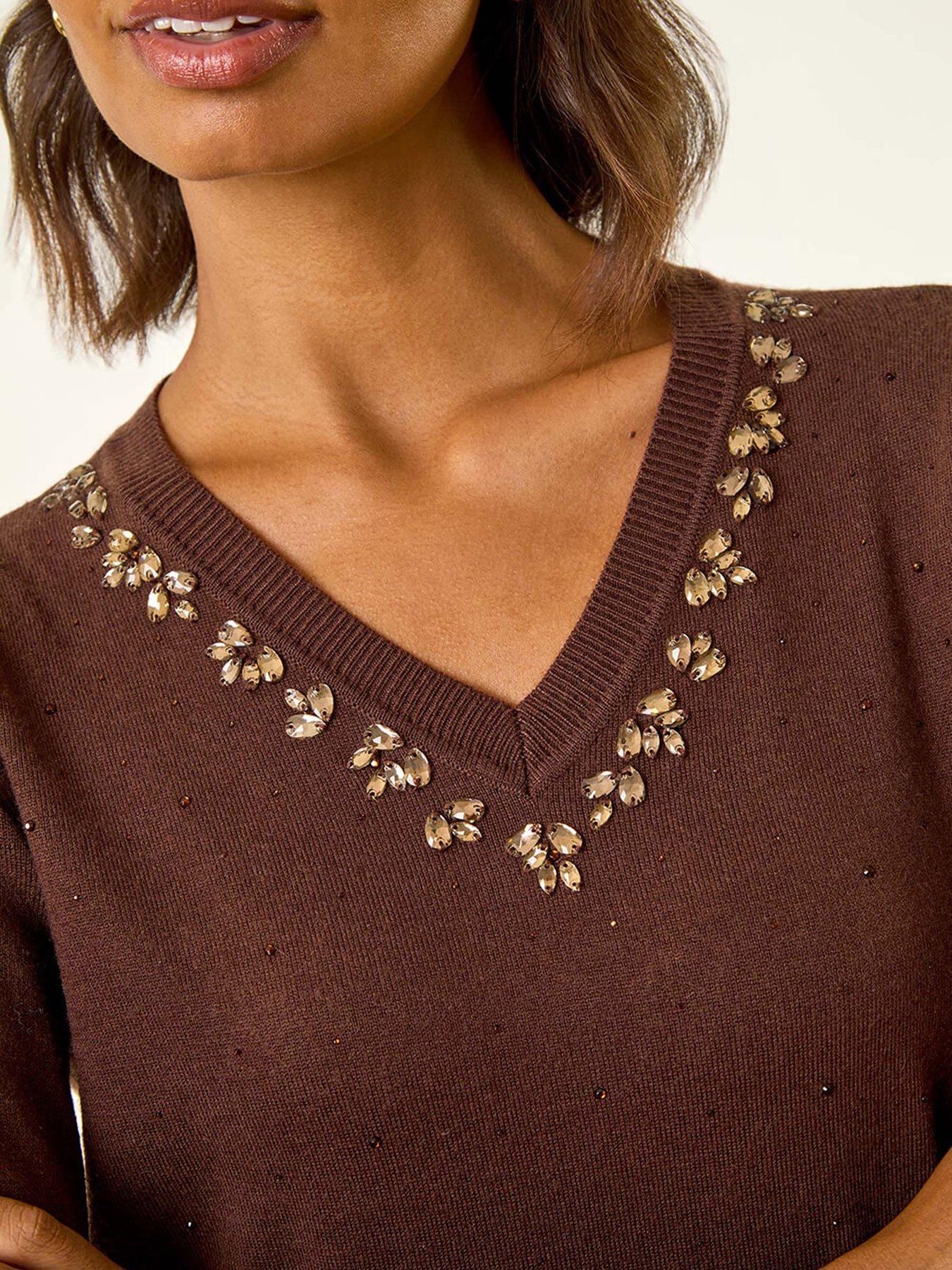 Roman V-neck Heart Hotfix Jumper - BrownAdd a touch of charm to your Autumn Winter wardrobe with this V neck Heart Hotfix jumper. Delicately detailed with heart-shaped embellishments at the neckline this cosy jumper exudes sweetness. The ribbed cuff long sleeves and soft handfeel ensure comfort and style go hand in hand. Pair with jeans and ankle boots for a casual yet adorable look that will keep you warm in style.