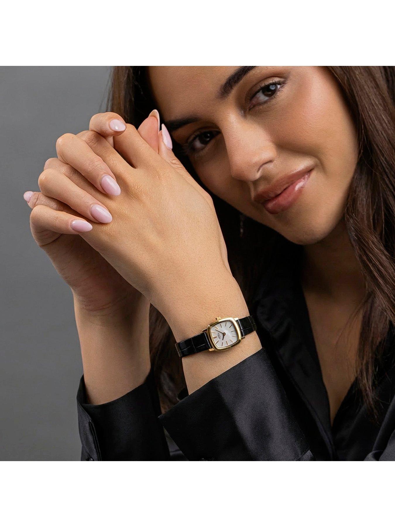 Rotary Rotary Ladies GP Black Strap MOP Dial 50mThis Heritage Astoria offers a refined, modern take on a compact dress silhouette. Crafted in gold PVD stainless steel, the watch features a softly squared case that pairs clean geometry with a jewellery-like feel. Its mother-of-pearl dial adds natural depth, complemented by applied baton indices and slim hands for a crisp, minimal presentation.Sapphire glass provides lasting clarity, while the precise two-hand quartz movement ensures dependable daily timekeeping. The black leather strap completes the design with a smooth, elegant fit. A sleek, understated dress watch - compact, refined, and elevated with subtle details.