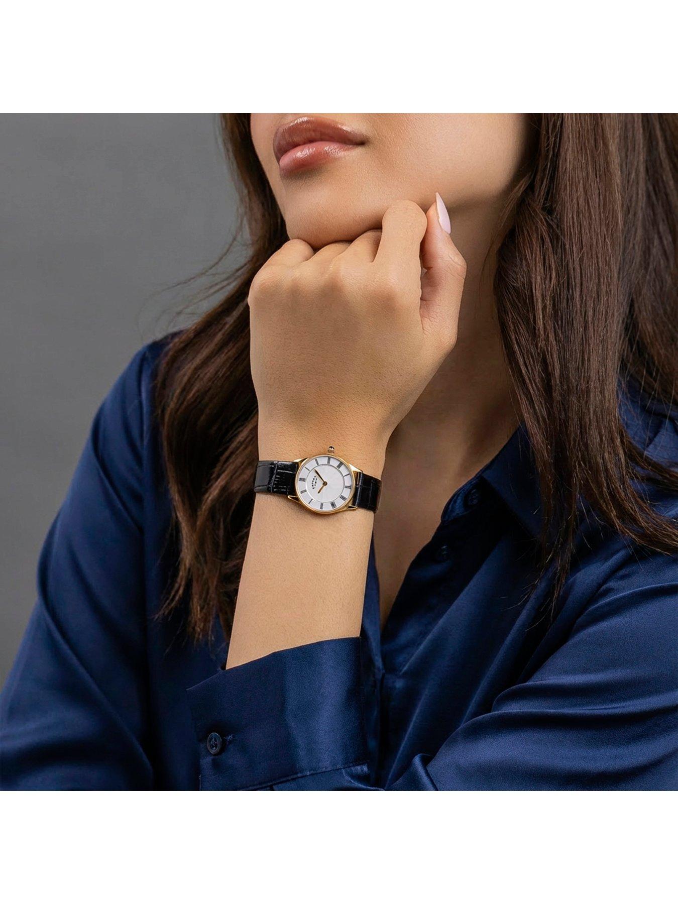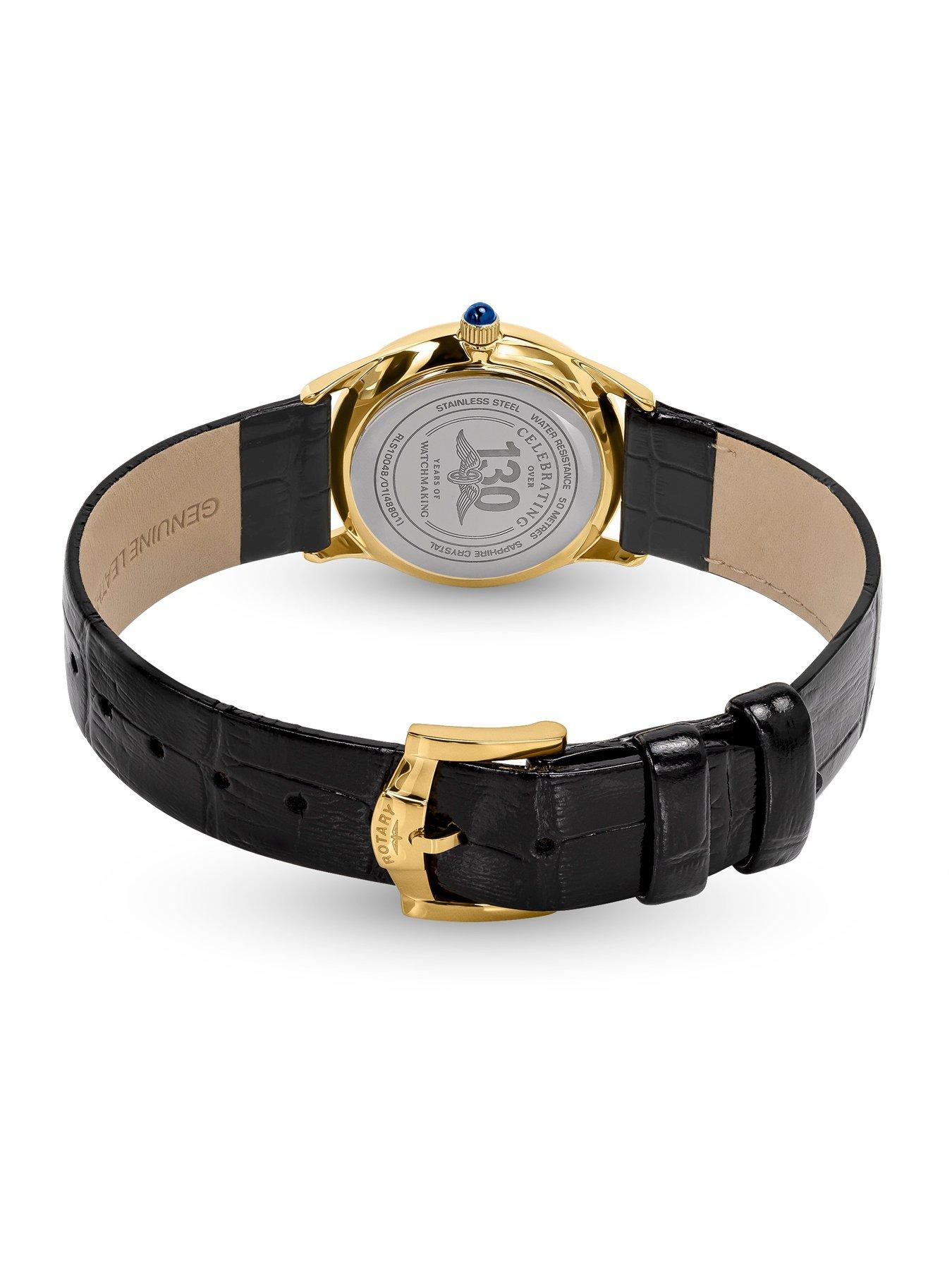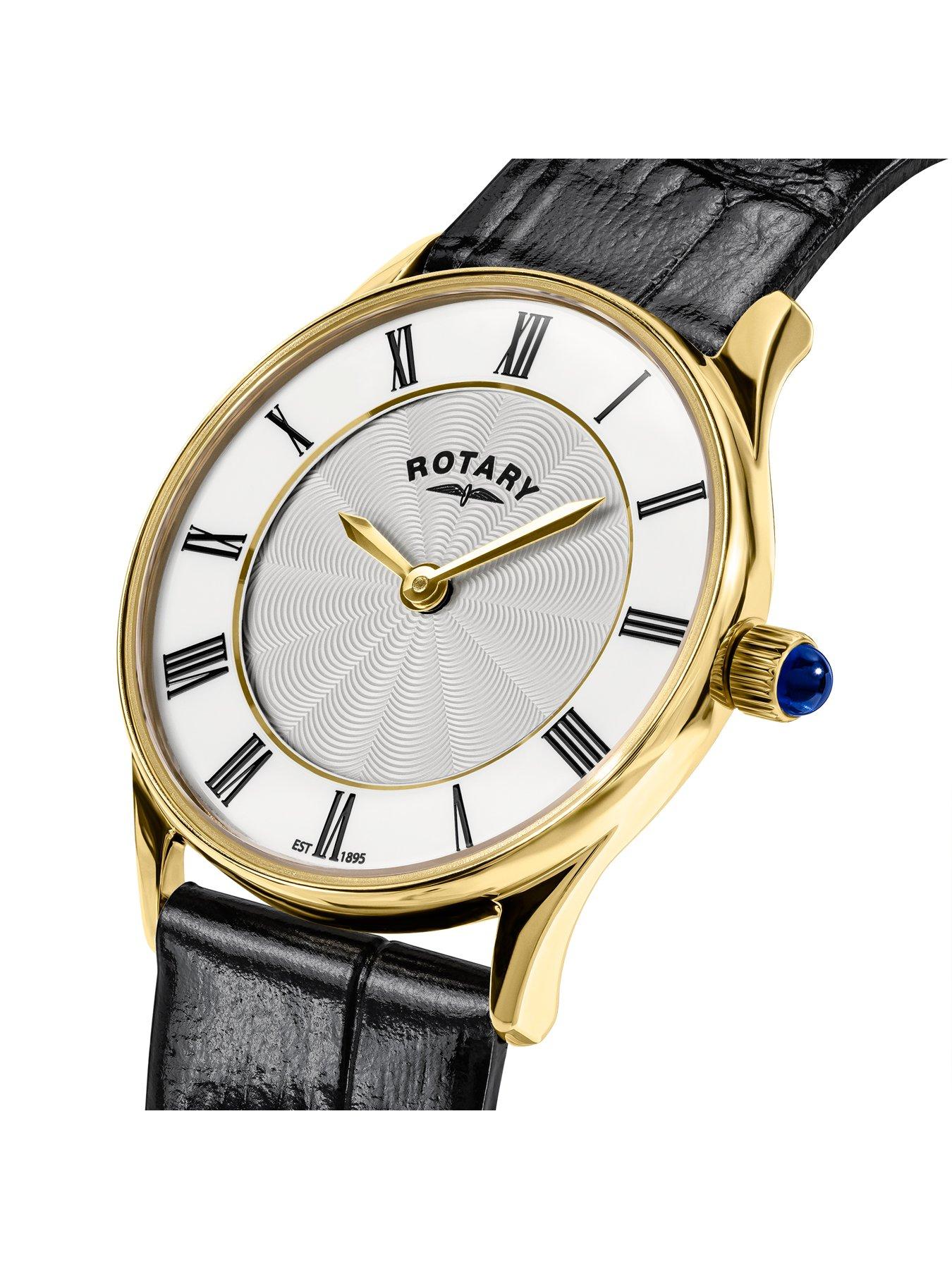 Rotary Rotary Ladies GP Black Strap White Dial 50mThis Rotary Heritage brings a slim, classic silhouette with a gold PVD 27mm case, a compact 31mm lug-to-lug, and a refined 5.3mm profile. Its two-layer white dial offers clean contrast and depth, framed by traditional Roman numerals and slim hands for a timeless, dress-focused look. A blue cabochon crown adds a subtle, elegant accent.Protected by flat sapphire glass and rated to 50m water resistance, the watch pairs vintage styling with dependable everyday durability. Light on the wrist yet rich in detail, it's built for understated, refined wear. A crisp, elegant classic - slender, polished, and grounded in traditional design.