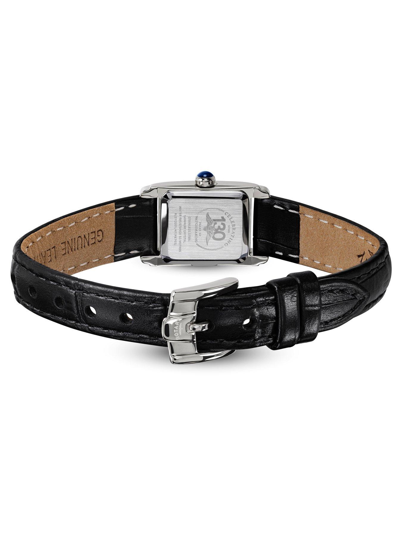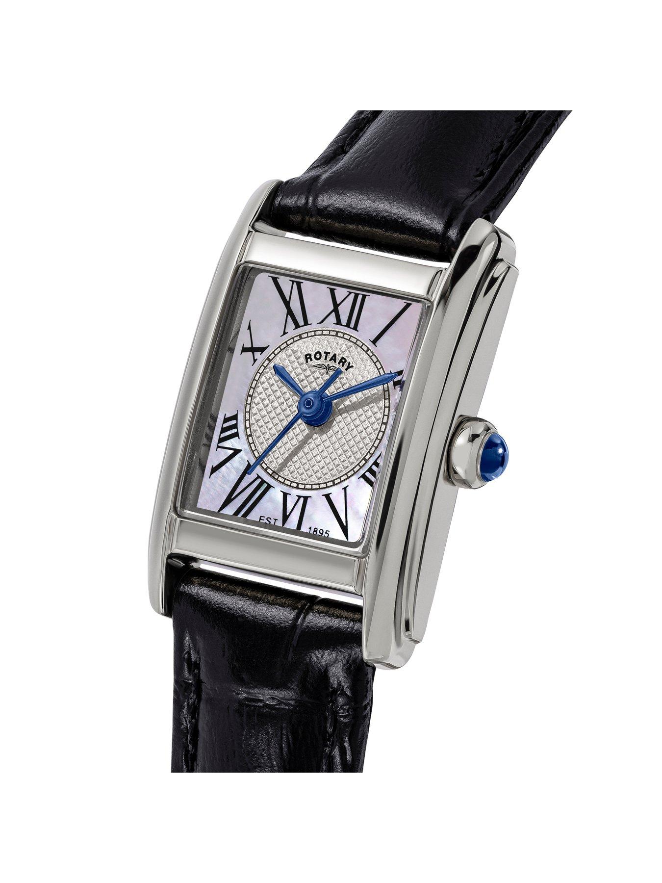Rotary Rotary Ladies SS Black Strap MOP Dial 50mThis Heritage Astoria delivers a refined rectangular design with a 24mm stainless steel case and a clean, classic profile. Its dial pairs a guilloche inner section with a mother-of-pearl outer ring, creating depth and contrast while keeping the layout elegant and traditional. Roman numerals and slim hands complete the vintage-inspired aesthetic, accented by a blue cabochon crown.Flat sapphire glass provides lasting clarity, and 50m water resistance ensures dependable everyday wear. The black leather strap reinforces the watch's timeless character with a polished, dress-ready finish. A sophisticated rectangular classic - elegant in detail, restrained in form, and built with a nod to traditional watchmaking.