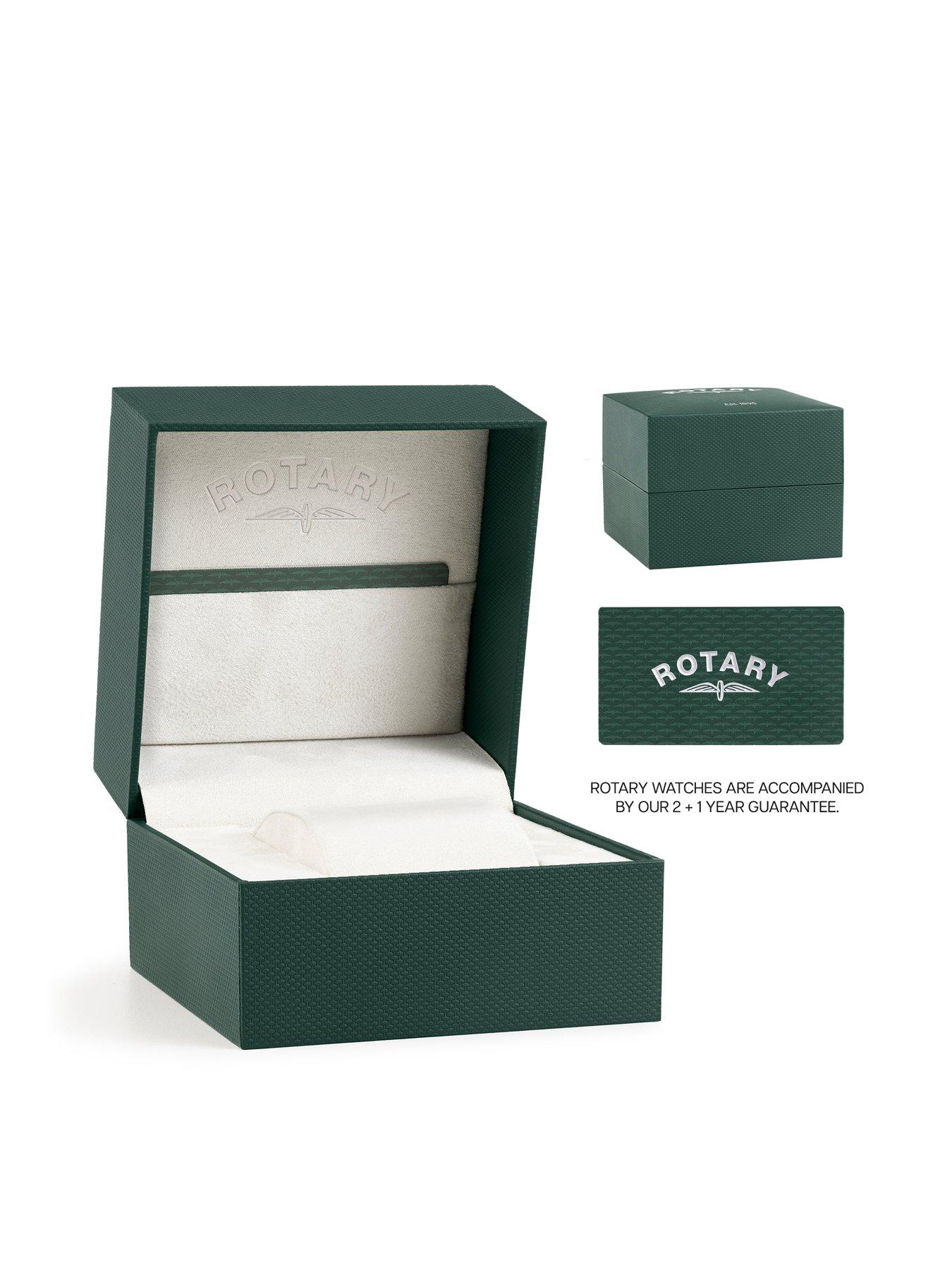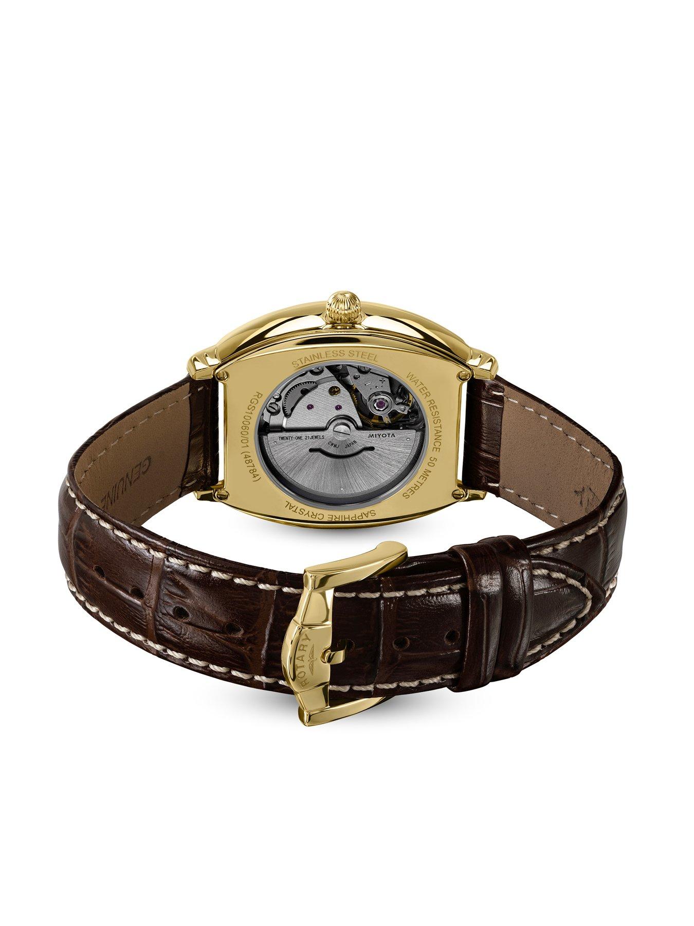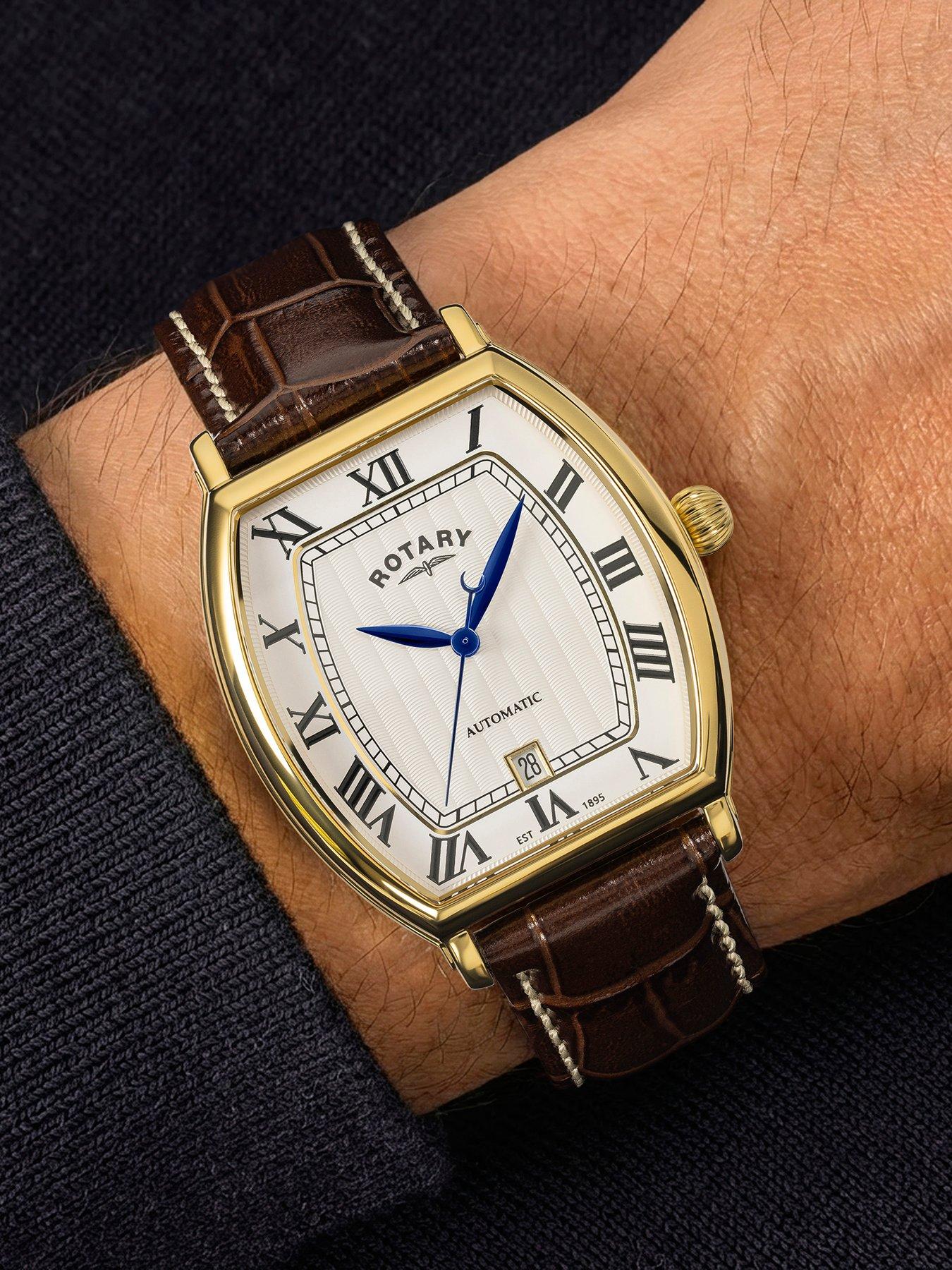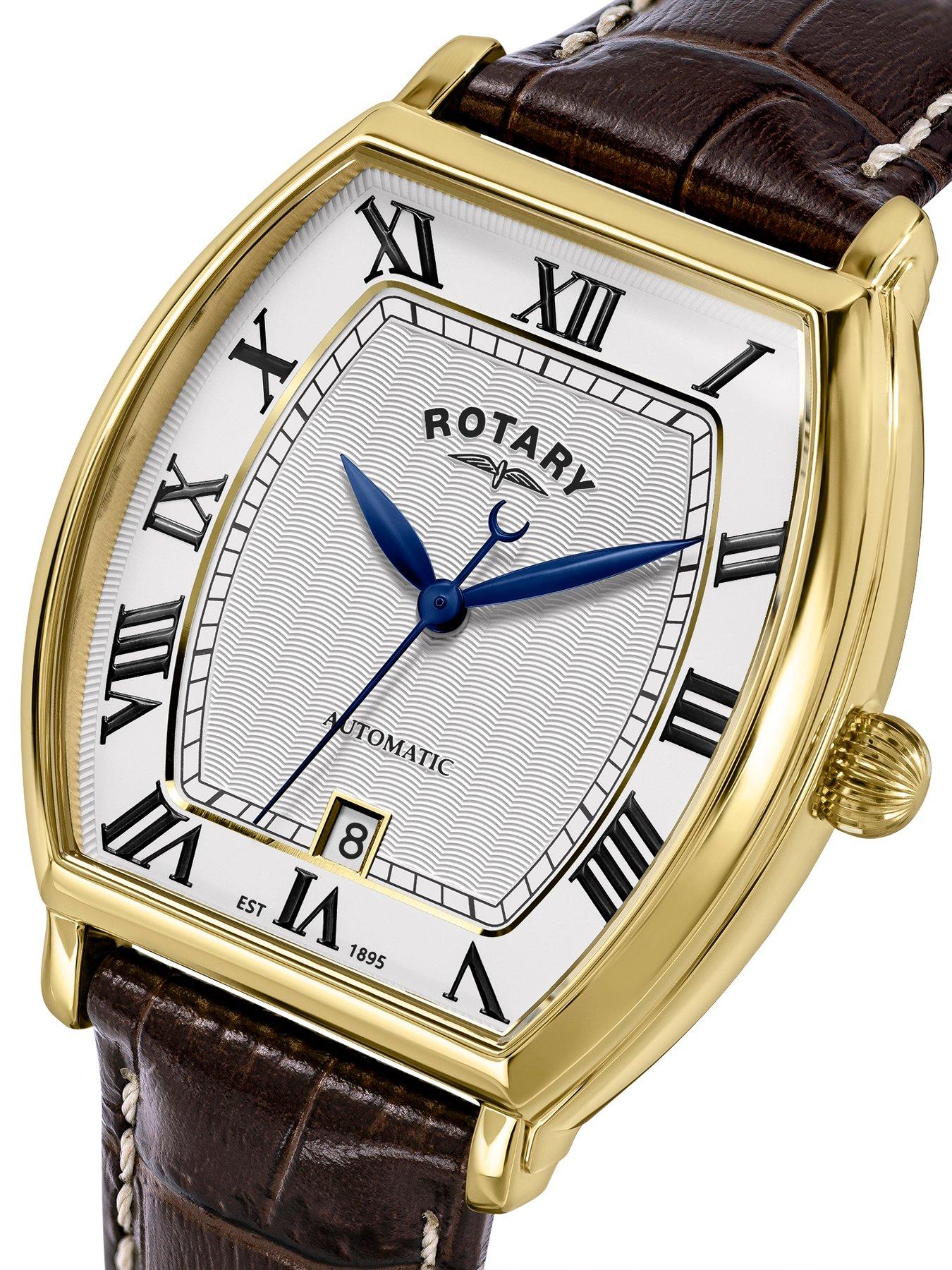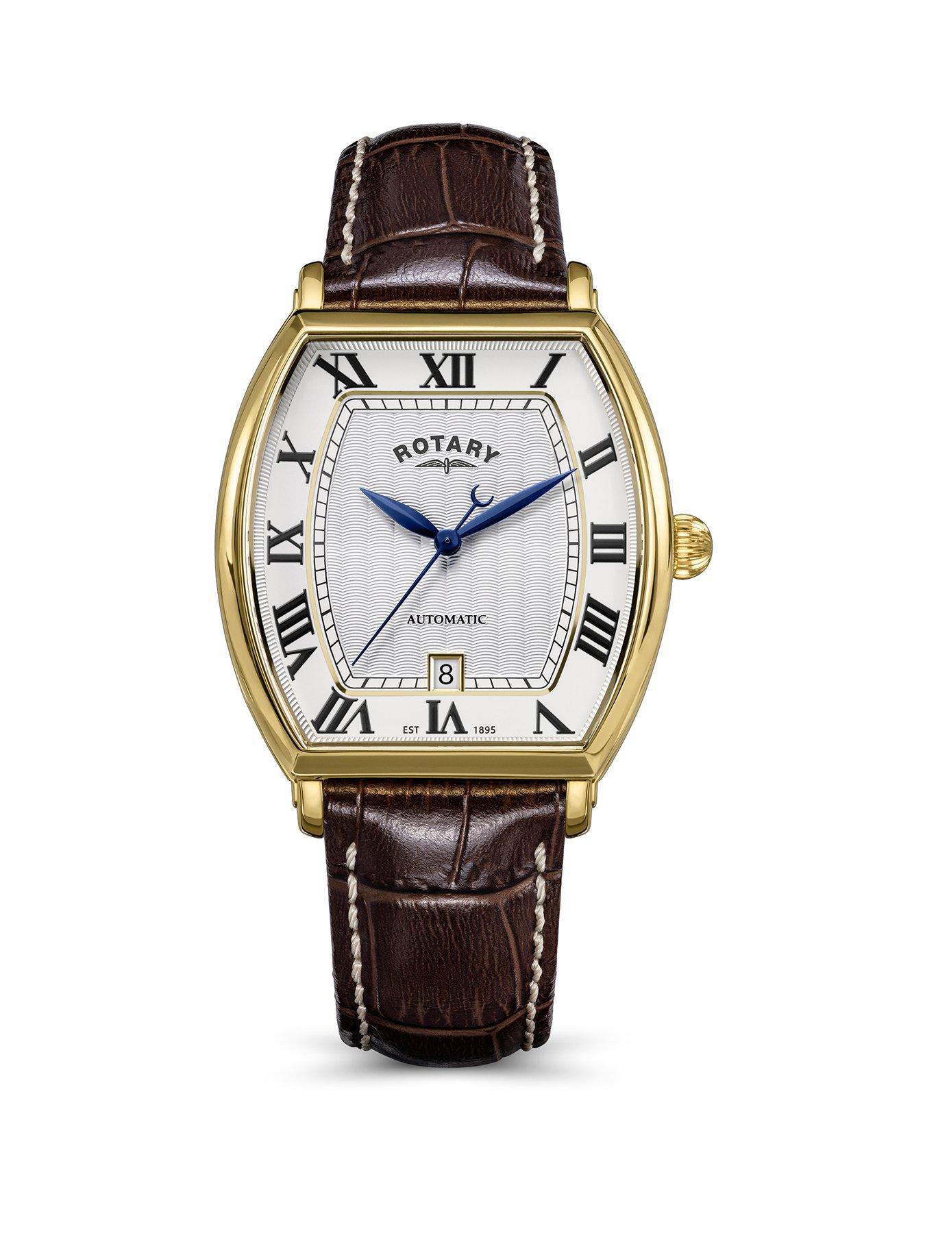 Rotary Rotary Men's Automatic GP Brown Strap White Dial 50mThis Rotary 1895 offers a refined interpretation of classic watchmaking, built around a 36mm 304L gold PVD stainless steel tonneau case with a 46mm lug-to-lug for a comfortable, traditional fit on the wrist. Its guilloche white dial delivers crisp elegance, framed by bold Roman numerals and protected by curved sapphire glass that adds depth and clarity from every angle.Powered by the reliable Miyota 8215 automatic movement, this Rotary 1895 blends mechanical assurance with understated style. The exhibition caseback reveals the movement in motion, reinforcing the watch's focus on heritage craftsmanship. A brown leather strap completes the design, giving it a smooth, refined presence on the wrist. With 50m water resistance, it's built to handle everyday wear with ease. A timeless automatic with classical detailing.