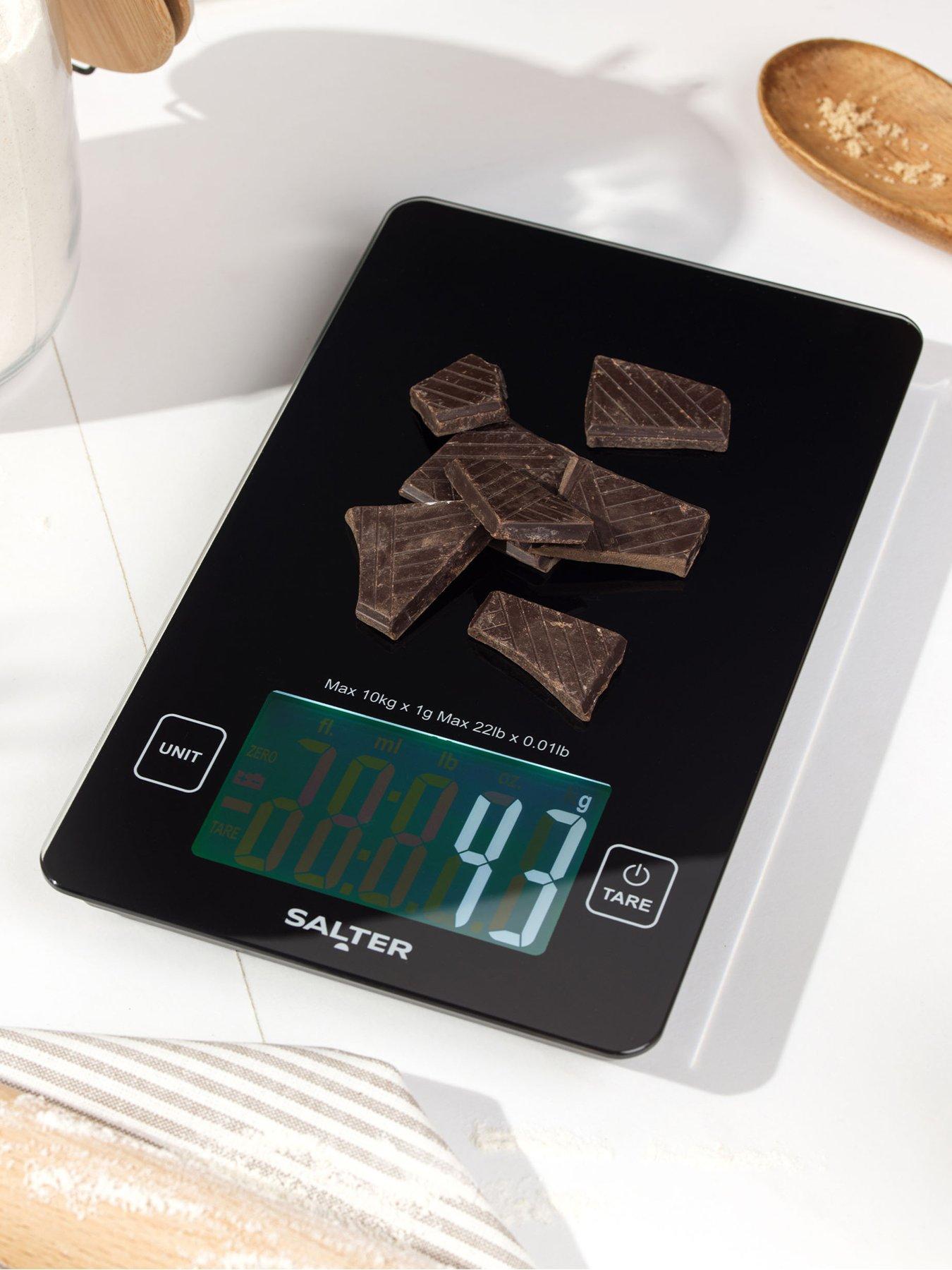 Salter Large Display Kitchen ScalePerfect for everyday cooking or batch baking, this Salter High-Capacity Kitchen Scale boasts up to an impressive 10kg capacity. The large digital display ensures easy reading, while the add & weigh zero function lets you seamlessly measure multiple ingredients in a single bowl. Remove the need for a measuring jug thanks to the Aquatronic function allowing you to measure liquids. Boasting a slim glass platform, this scale combines practicality and style and is easy to store away after use.