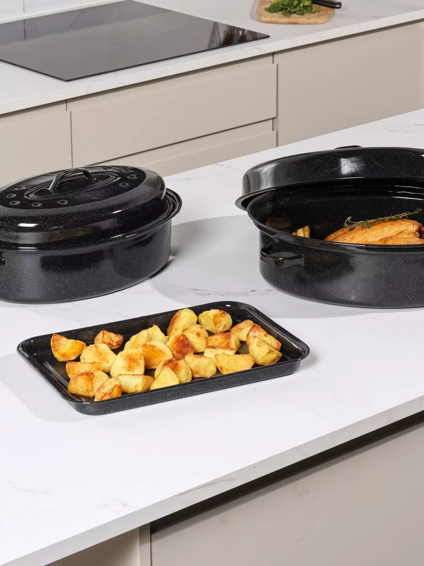This brilliant Salter 36 cm Baking Tray is made of strong and durable vitreous enamel coated steel and features a black finish, making it perfect for all of your baking needs, from crisp biscuits to perfectly roasted vegetables. Take your baking to the next level - it is safe to use in the oven up to 230°C. Thanks to the easy-to-clean enamel surface, you won't have any trouble hand washing to get it looking as good as new again, or you can simply pop it in the dishwasher for a quick cleanup.- Depth: 360 MM