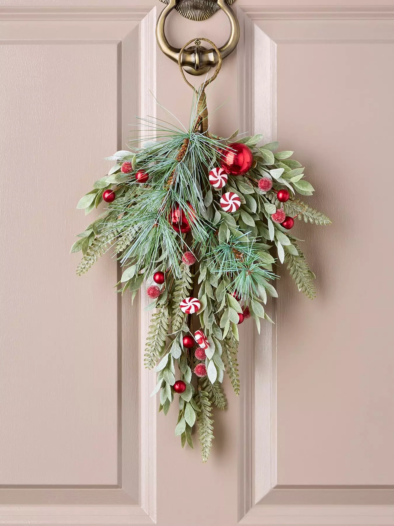 Add a festive touch to your home decor with this 48cm candy cane & bauble swag, featuring stripey candy canes, red baubles, berries, and evergreen foliage. This hanging Christmas decoration is perfect for adding a pop of colour and holiday cheer to your space. Mix and match with coordinating pieces to create a cohesive and stylish look throughout your home. Get ready to spread the holiday spirit with this beautiful and festive swag!Sheltered outdoor use only, bring indoors in extreme weather.