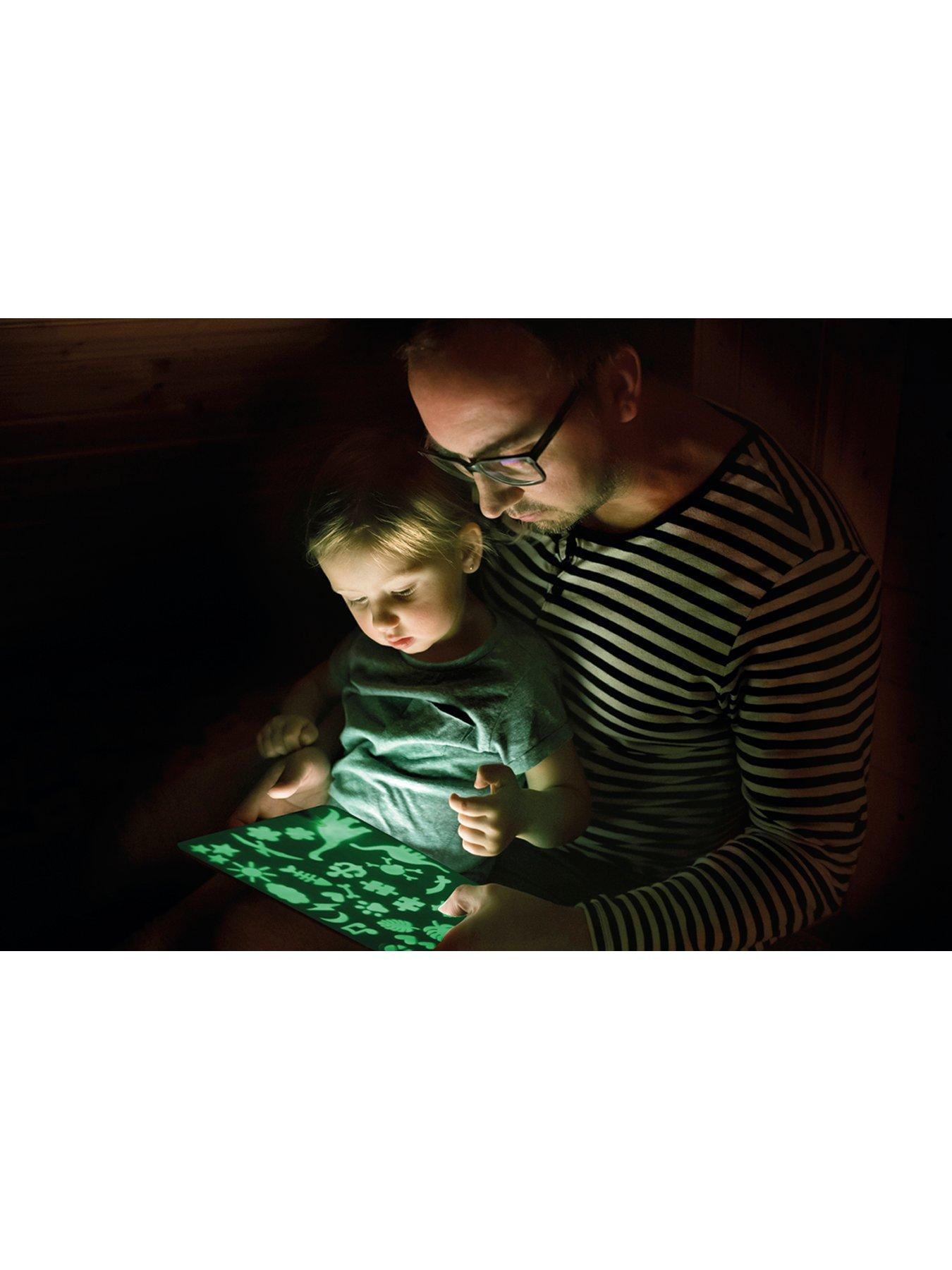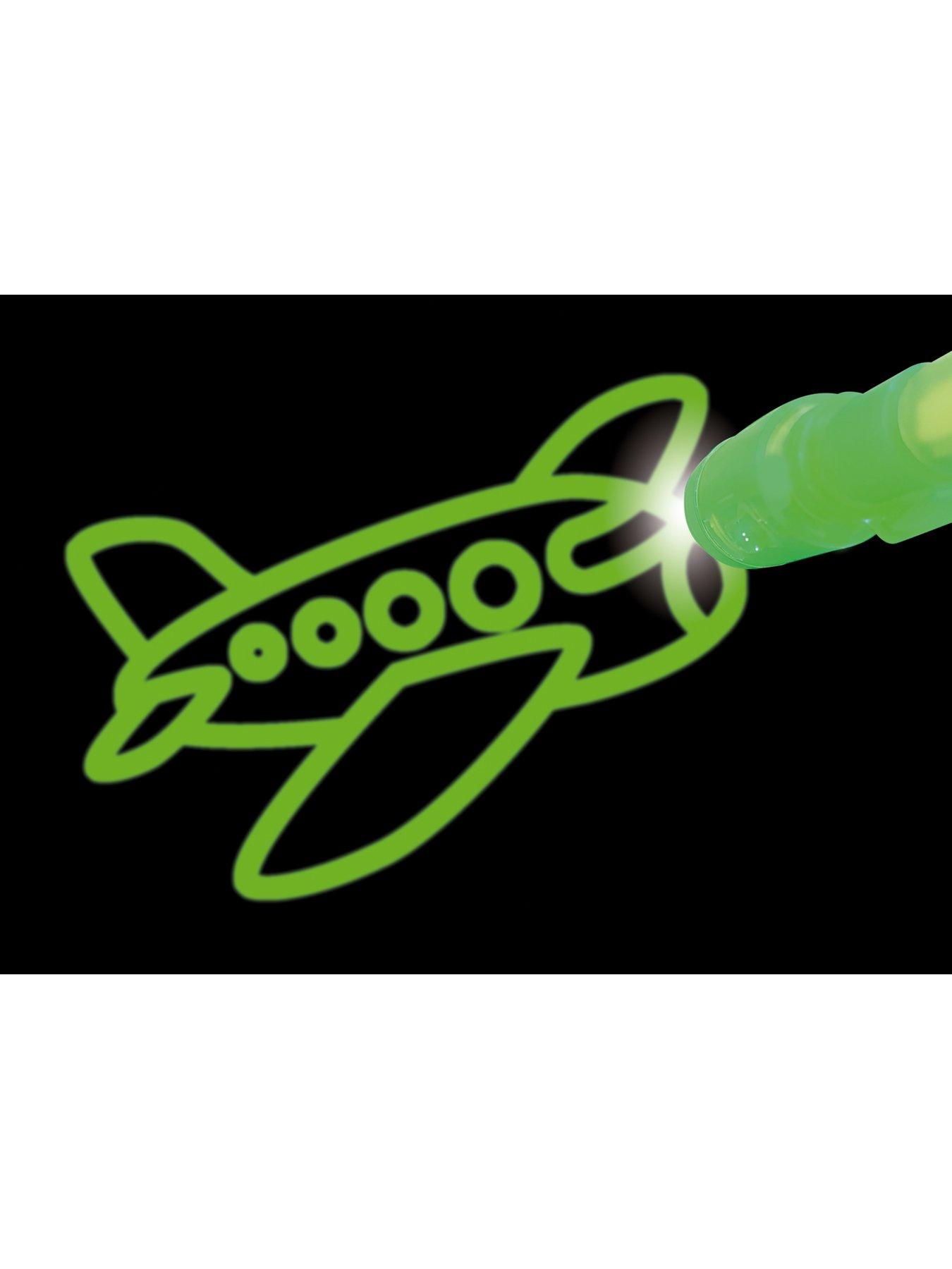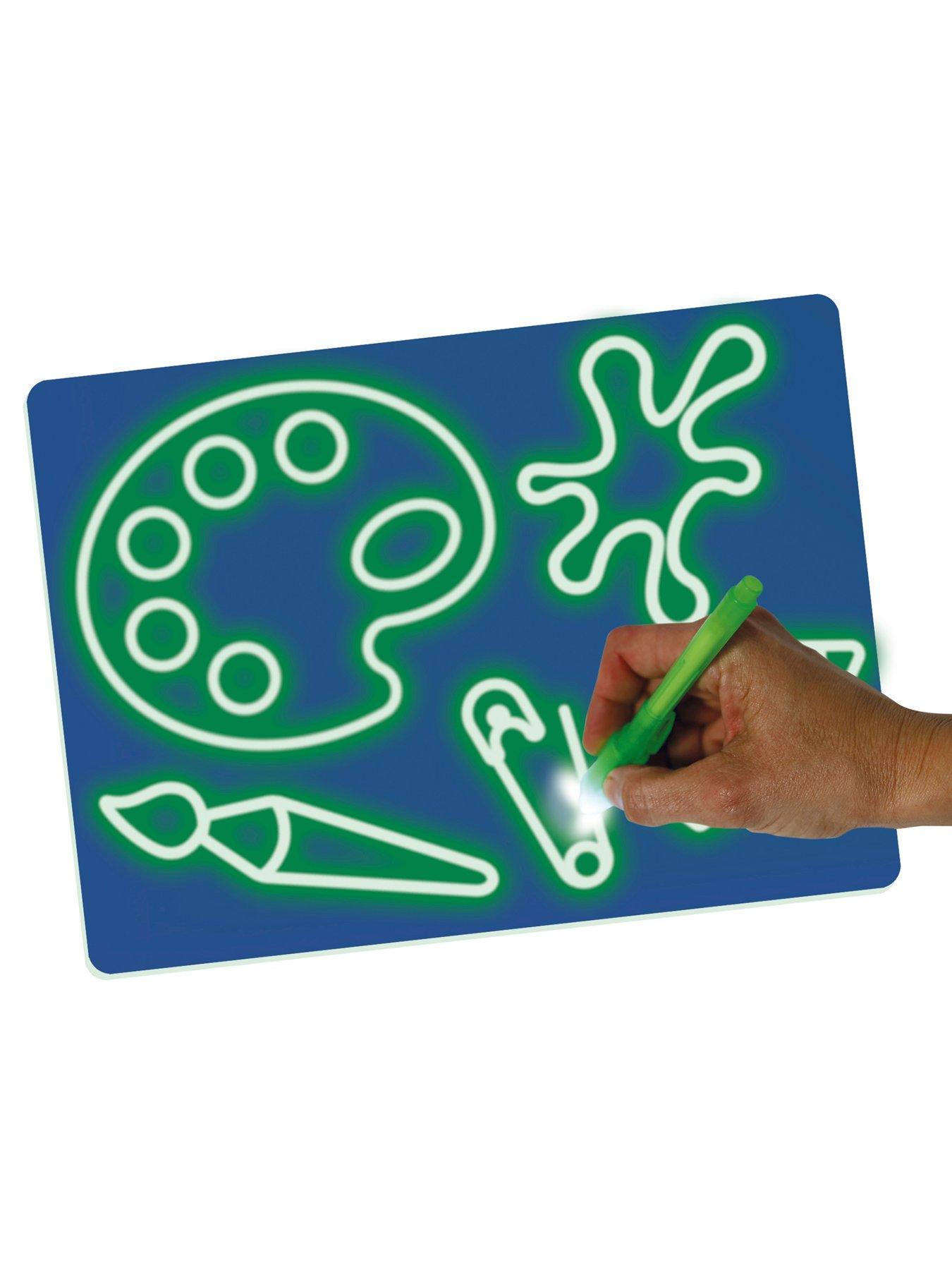 The Large Secret Board is safe and clean, it measures 29 x 41 x 1 cm and it is a large magic light drawing board where drawings will glow in the dark, thanks to its photoluminescent surface that absorbs light and then glows in the dark. It will leave no stains or marks and leave you hand clean. It comes with a special LED flashlight marker pen and 2 stencils (1 x A4 size and 1 x A3 size), one with the alphabet and numbers 0 - 9 and the other with some amazing cool designs on them or use your own imagination to draw or white what you like. It even comes with ink, for secret messages. Suits ages 3 years +.