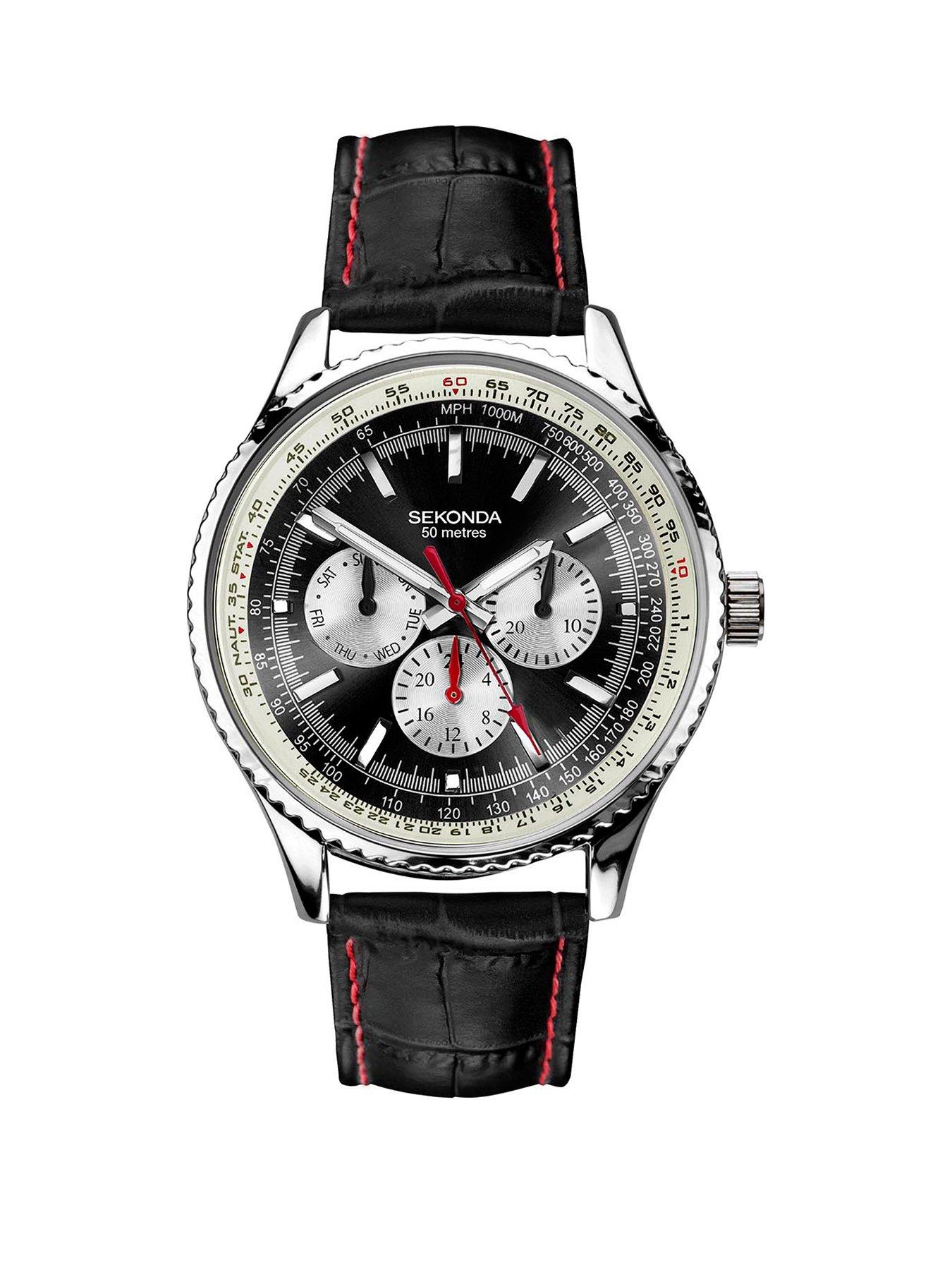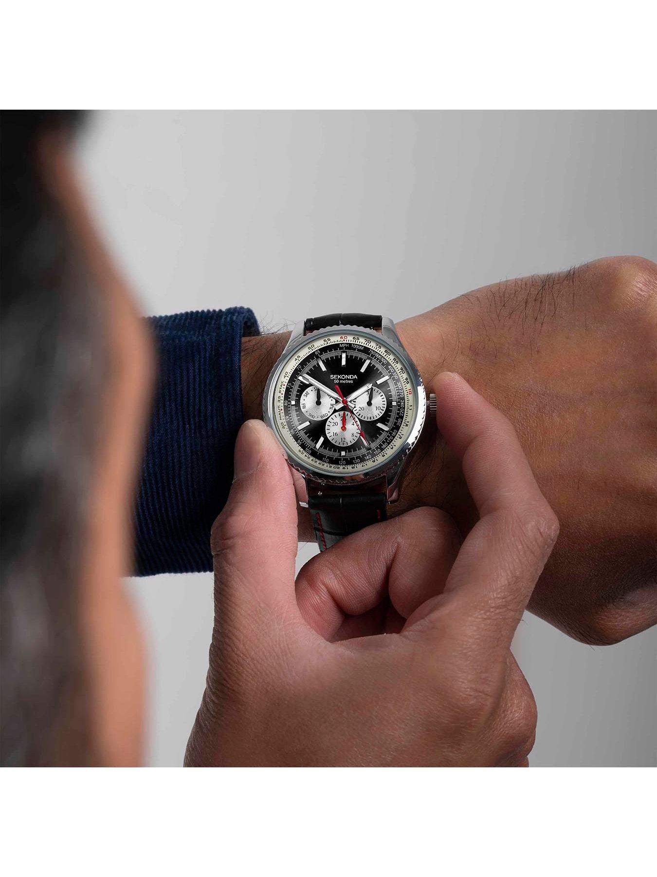 sekonda Chronograph Leather Mens WatchThis men's watch fastens with a black leather strap. The watch has a round silver plated alloy case with a black dial, a white chapter ring, a day/date display, 24 hour read out and up to 50 metres water resistance.