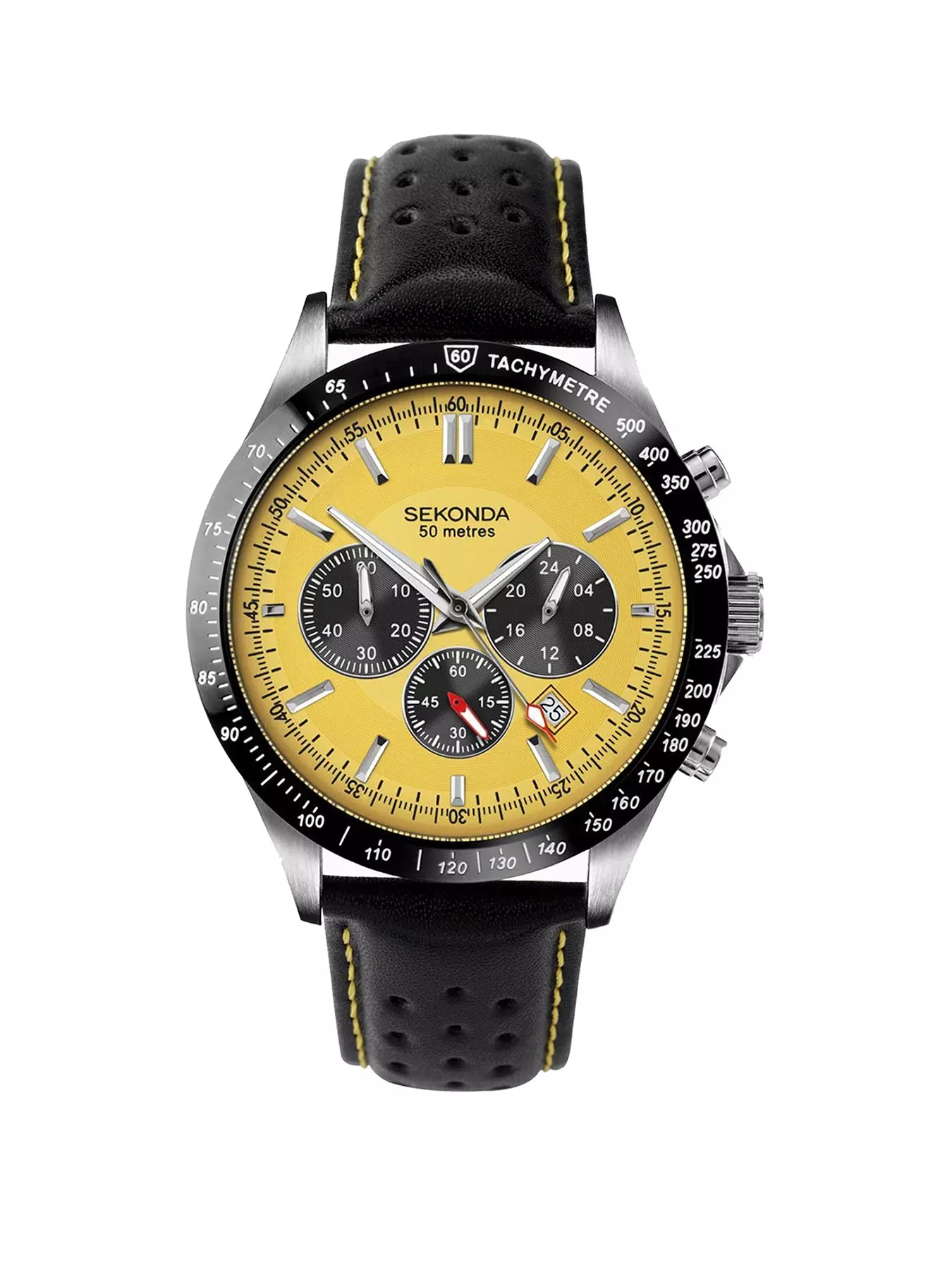 This men's watch fastens with a black leather strap with yellow stitching. The watch has a round stainless steel case housing a yellow dial. Features include a date display, 24-hour read-out, a tachymeter and water resistance to 50 metres.- 24Hr Display: N