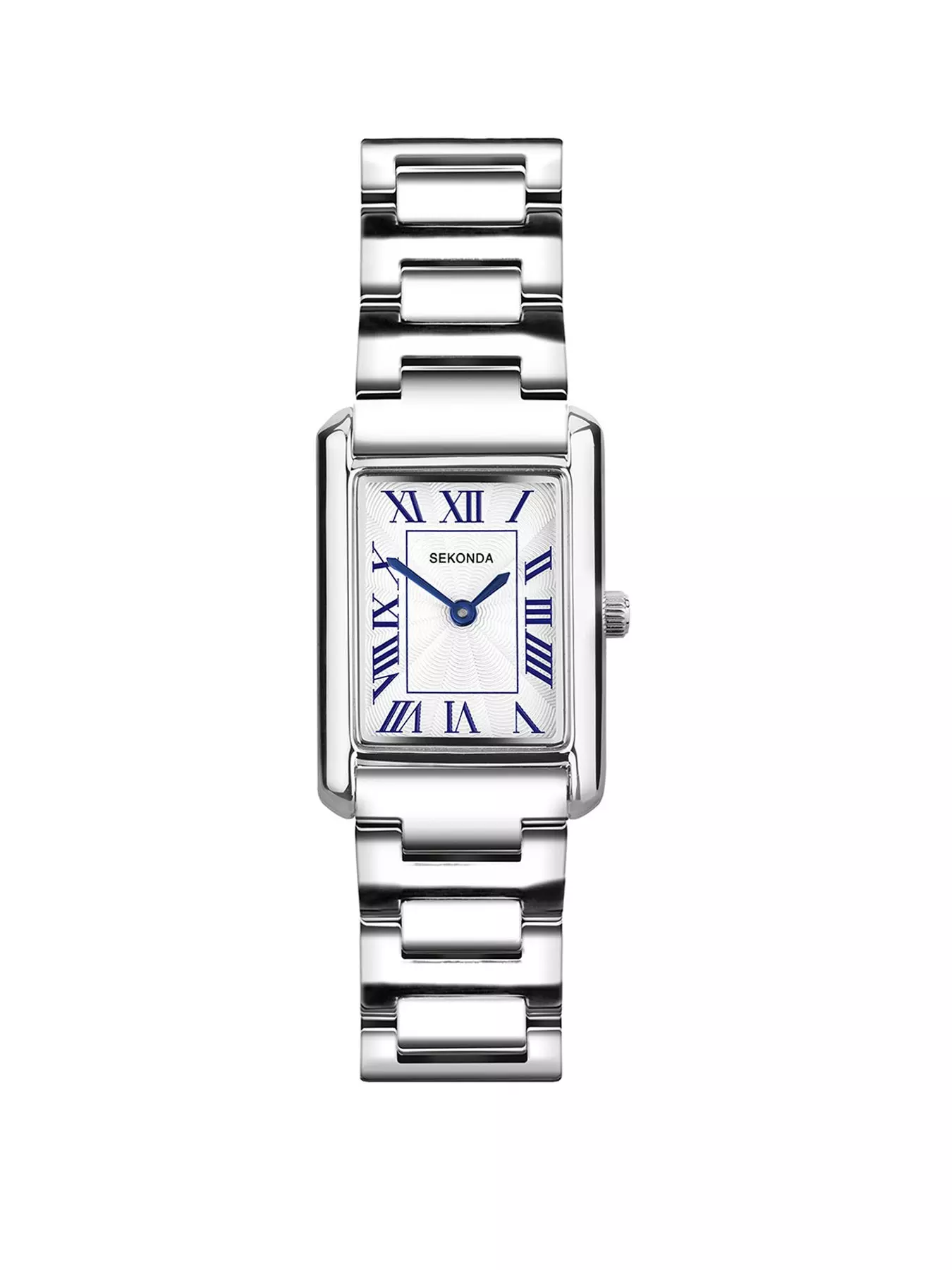 This watch has a silver rectangular 22mm alloy case, housing a white guilloche dial featuring blue roman numerals and blue hands. The watch is fastened with a sleek, ion-plated silver alloy bracelet with a jewellery clasp. Water resistance up to 30m. Comes with a 2 year guarantee. This watch uses 1 x SR626SW for it's replacement battery.- Depth: 7 MM