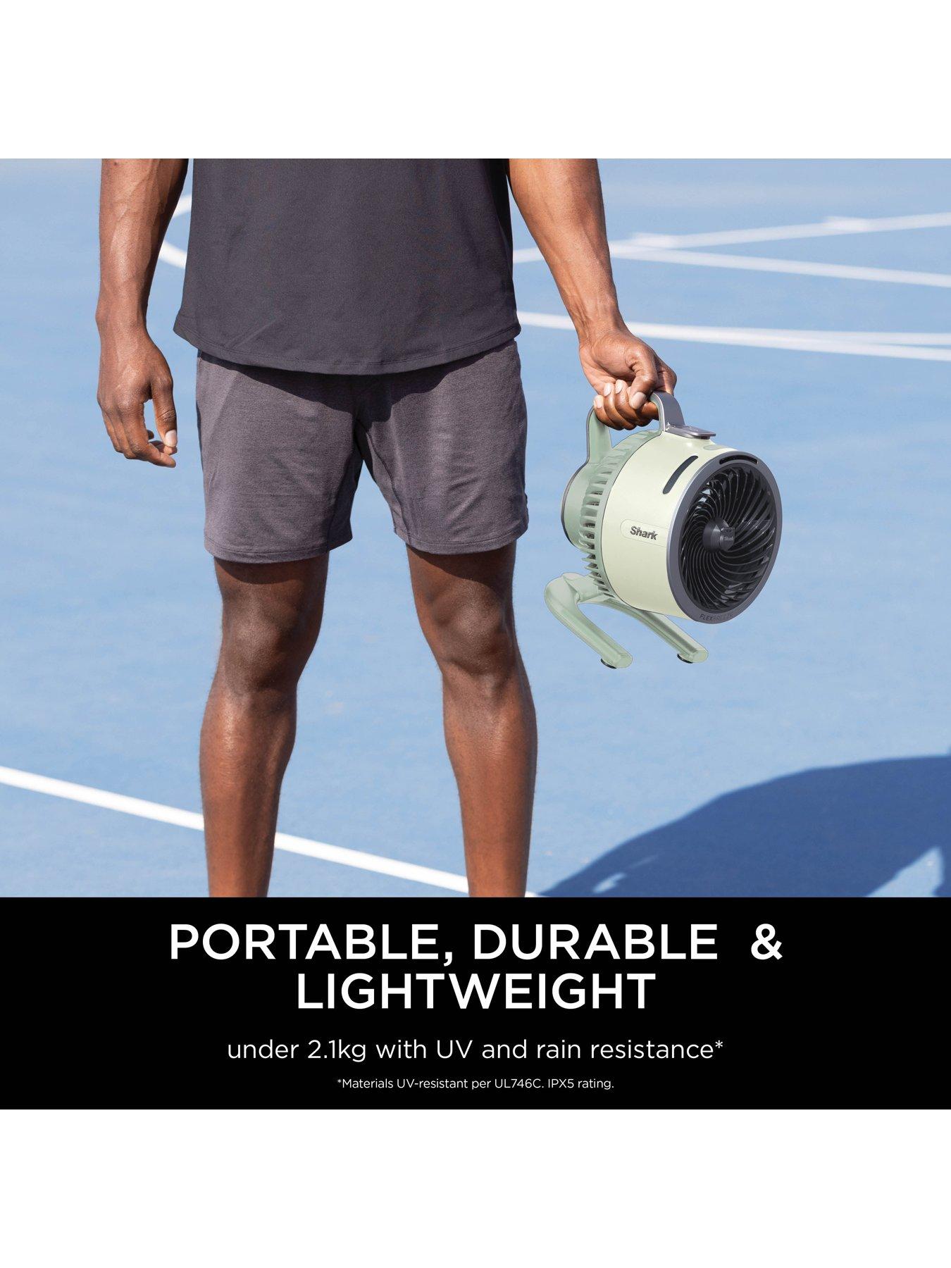 Shark FlexBreeze HydroGo Misting Fan FA050UKGN - GreenIntroducing the Shark FlexBreeze HydroGo, the powerful, portable, go-anywhere fan that mists both indoors and outdoors. Whether you're cooling off at home, enjoying a picnic in the park, camping under the stars, or at the school sports day, the Shark FlexBreeze HydroGo lets you bring the breeze and create a cooling mist anywhere.Refreshing mist without wet surfaces: Shark's HydroGo Evaporative Cooling Technology produces ultra-fine droplets, which means you can enjoy a cooling mist indoors and outdoors without creating any wet surfaces. With its integrated 150ml water tank, misting has never been easier. Lightweight portability: Compact and weighing less than 2.1 kg, the Shark FlexBreeze HydroGo is the perfect grab-and-go cooling companion. With up to 12 hours of cordless runtime on speed 1, without misting, you can stay refreshed for longer without the need to recharge. Customise your cool: Choose from five fan speeds, two smart breeze modes, continuous mist, or interval mist. At maximum fan speed, airflow can reach up to 20m. With a 45° vertical tilt, your cooling needs are well covered. Plus, a range of accessories (sold separately) - including a power bank, car charger, telescoping pedestal, and carry bag- lets you customize your cooling kit for any occasion. Durable outside, less disturbance inside: With a rain resistance IPX5 rating and resistant to UV *, the Shark FlexBreeze HydroGo is tough enough to take-on the outdoors. While indoors, its quiet operation ensures minimal disturbance---perfect for sleeping or working from home. Included in the Box: Shark Fan, Charger *Materials UV-resistant per UL746C. 1-year guarantee with an additional 1-year upon registration with Shark