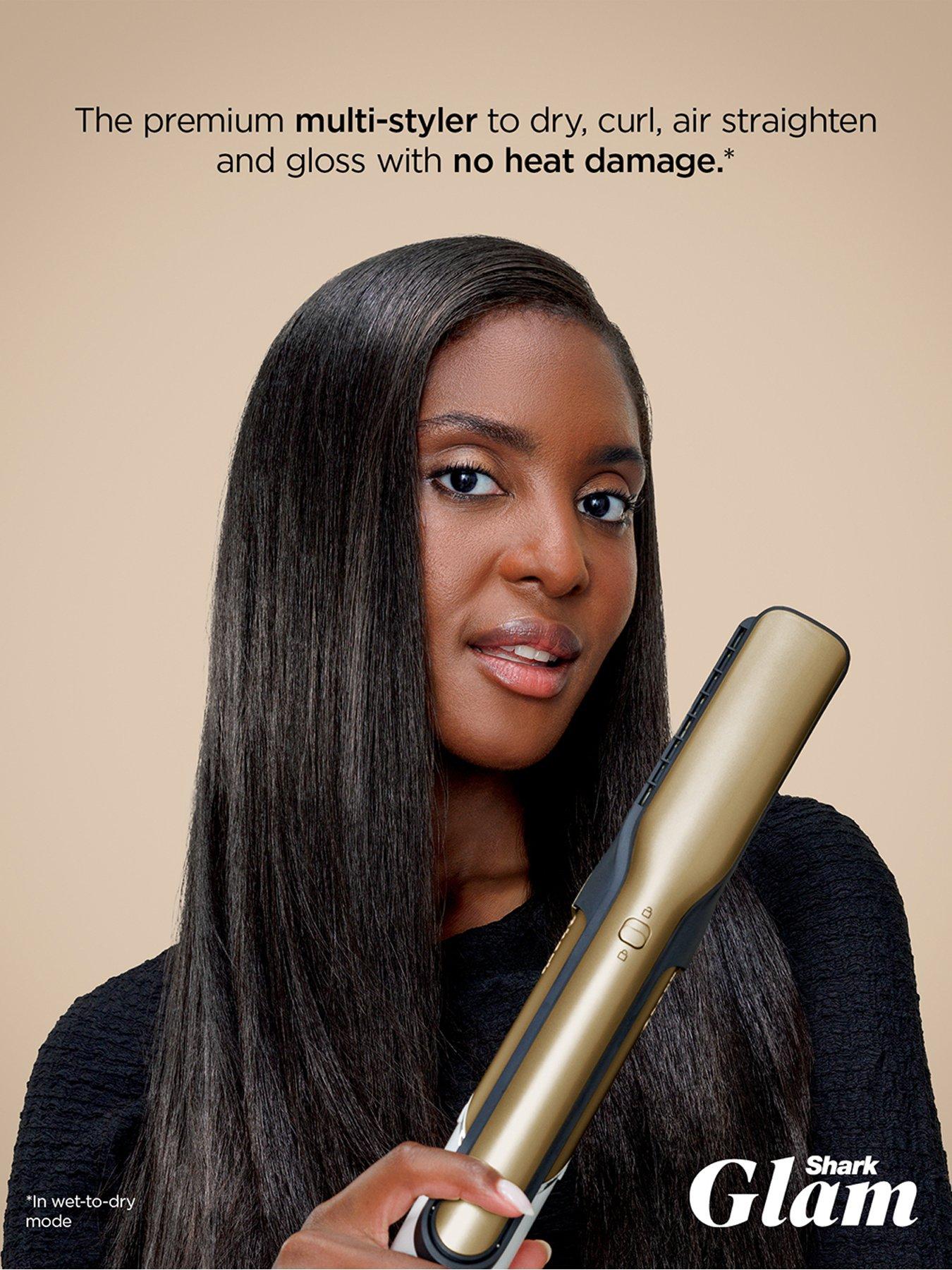 Shark Glam Straight & Waves Multi-styler - HD6041SUKIntroducing the Shark Glam Multi-Styler, designed to deliver ultra-fast drying with no heat damage*. It offers a combination of heat controlled ceramic and powerful air to achieve glossy blow dries, silky straight styles, and voluminous curls. With four versatile styling tools included, it's your all-in-one solution for salon-inspired results at home. Comes with a 2-year guarantee upon registration with Shark, offering added peace of mind.At the heart of the Shark Glam Multi-Styler is Gloss Lock Technology, which seals in shine on dry hair for a smooth, radiant finish that lasts all day**. The Silki tool acts as both a hot tool and air straightener, delivering a silky, frizz-free look without heat damage*-perfect for wet-to-dry styling, touch ups and dry restyling. For wet or dry blow dries, the Glossi Tool & Air Glosser ensures high-gloss results without the frizz***, making it ideal for transforming all hair types. The Styling Concentrator Tool gives you precision control over airflow, allowing you to create sleek finishes or volume with ease. And for curls, the Auto-Wrap Curlers automatically wrap, set, and curl your hair in minutes. This styling system is suitable for all hair types, making it a versatile addition to any beauty routine. Finished in a luxurious gold colour, the Shark Glam Multi-Styler is as stylish as it is functional. It includes everything you need: Hair Dryer, Styling Concentrator, Auto-Wrap Curlers, Silki Tool, and Glossi Tool. Whether you're aiming for straight, wavy, or curly looks, this multi-styler delivers high-shine results with minimal effort and maximum care. Experience the future of styling-fast, glossy, and without heat damage*. *In wet-to-dry mode. **71% of 156 users agree in consumer study *** Shine/frizz vs air drying.