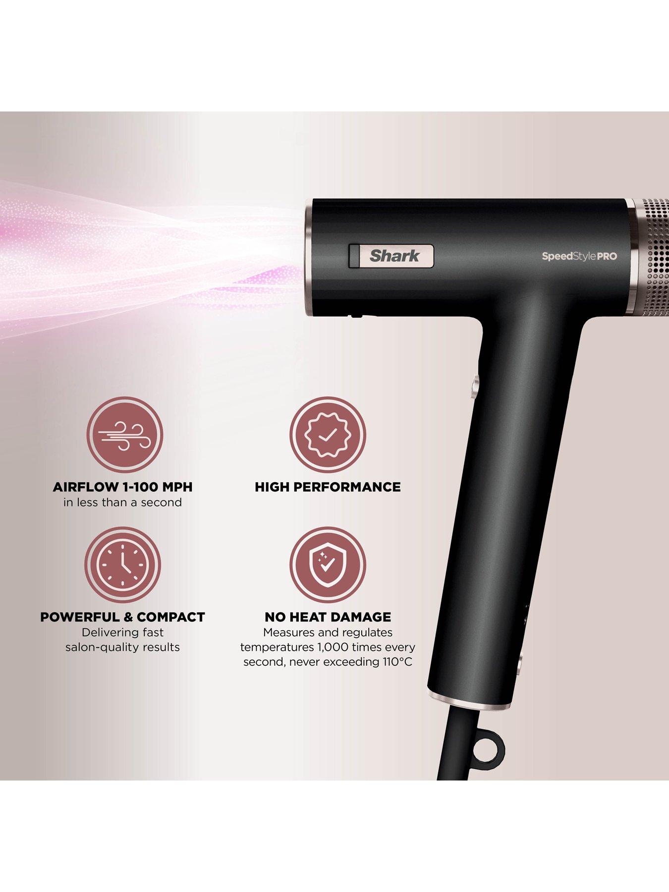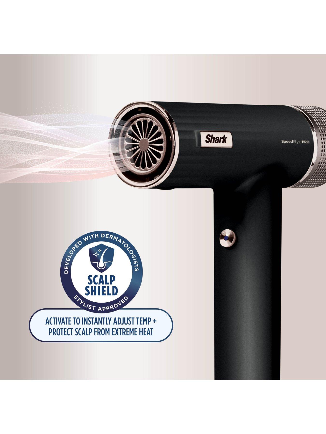 Shark SpeedStyle Pro High-Velocity Hair Dryer System HD701UKMeet the Shark SpeedStyle Pro Hair Dryer System. Designed for high performance and no heat damage, on all hair types. Includes Scalp Shield - designed to protect new hair growth from extreme heat.High performance: High-velocity airflow goes from 0-100 mph, delivering wet-to-dry styling with no heat damage. Achieve flawless salon-quality blow-dries and a high-gloss shine at home. Scalp Shield Mode: Activate to instantly reduce air temperatures to the optimum safe level for scalp comfort and root drying. Designed to protect new hair growth from extreme heat. Developed with dermatologists. Approved by stylists. No Heat Damage: SpeedStyle Pro measures and regulates temperature 1,000 times a second, never exceeding 110°C. Designed For Less Frizz*: Built-in ionising technology for smooth, healthy-looking hair. Create smooth, sleek styles with the Turbo Concentrator: This essential accessory precisely targets and smooths every strand, straightening and polishing even deeply textured hair. Rotate for easy blow-drying at any angle. IQ Speed Styling & Drying: The hairdryer will intelligently adjust the heat and airflow settings when you attach the concentrator for smooth styling with no guesswork, however you can also manually switch between 4 heat and 3 airflow settings to suit your preference or experiment with different styles. Use Cool Shot to seal the hair cuticle and lock in your styles. *vs air drying.