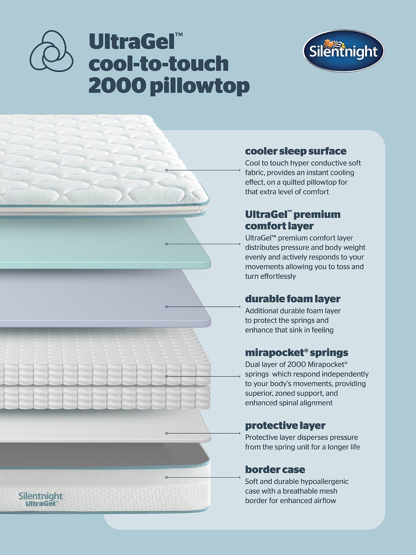 Silentnight Ultragel 3000 Box Top Cool Mattress Medium / Soft - Express Delivery AvailableSilentnight's UltraGel 3000 Cool to touch mattress has a hyper conductive soft knit sleep surface, providing an instant cooling effect allowing you to fall asleep faster and more comfortably. The gel infused UltraGel comfort layer is Silentnight's most breathable foam yet, 5 x more breathable than standard memory foam, it offers supreme comfort and unparalleled pressure relief, it actively responds to your movements, allowing you to toss and turn effortlessly without any partner disturbance. Proven by science to relax your body for a deeper more energising sleep. A dual layer of 2000 Mirapocket springs and 1000 mini springs are held within individual pockets and work independently to each other, they spread weight and pressure evenly, whilst adjusting to your movements through the night, resulting in great comfort and enhanced support that's personal to you. With a sumptuous boxtop micro quilted lid with a breathable mesh border for enhanced airflow you can rest easy on this premium mattress.