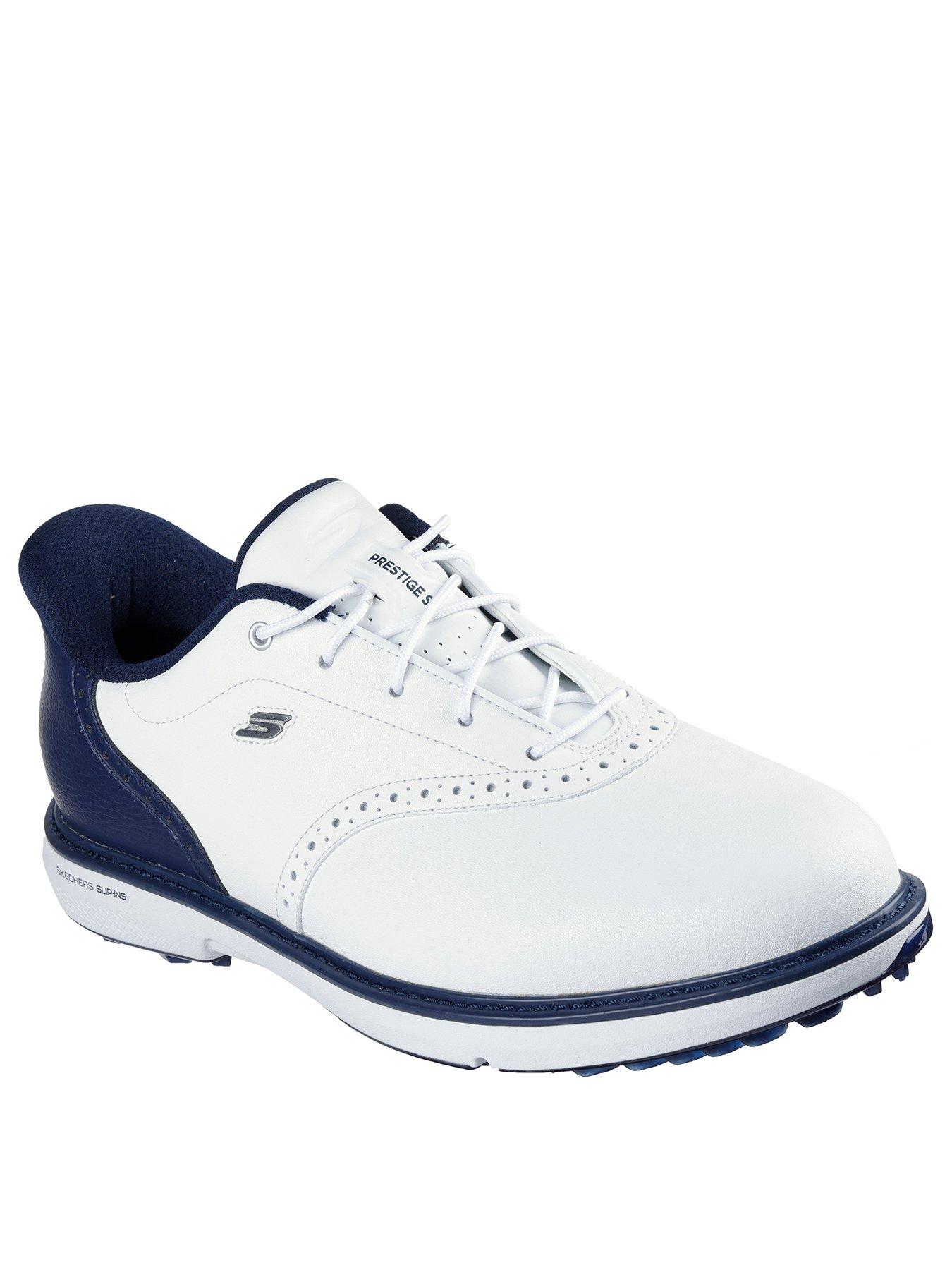 Skechers Mens Golf Prestige Shoes - WhiteHandle the course with the best in comfort technologies wearing Skechers Hands Free Slip-ins: GO GOLF Prestige SL. Designed with our exclusive Heel Pillow, this waterproof golf design features a lace-up leather upper with a removable Arch Fit insole, lightweight cushioning, and a spikeless outsole.