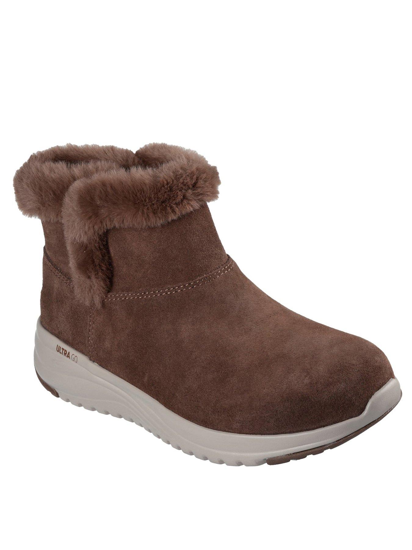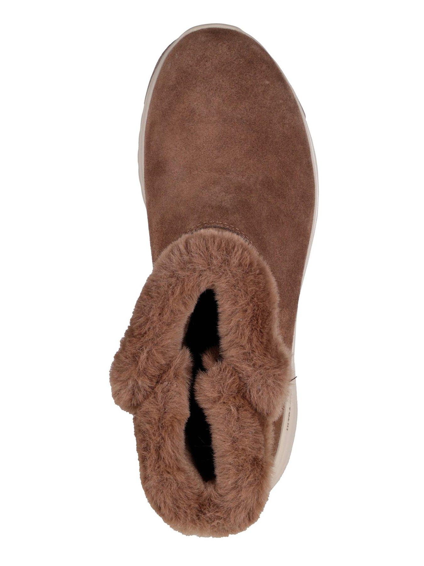 Skechers On-The-Go Stellar Cozy Step Waterproof Boot - BrownEnjoy the classic coziness of a classic shearling style bootie with premium Skechers comfort wearing Skechers On-the-GO Stellar - Cozy Step. This pull-on waterproof boot features a mid-top suede upper with faux fur trim and lining