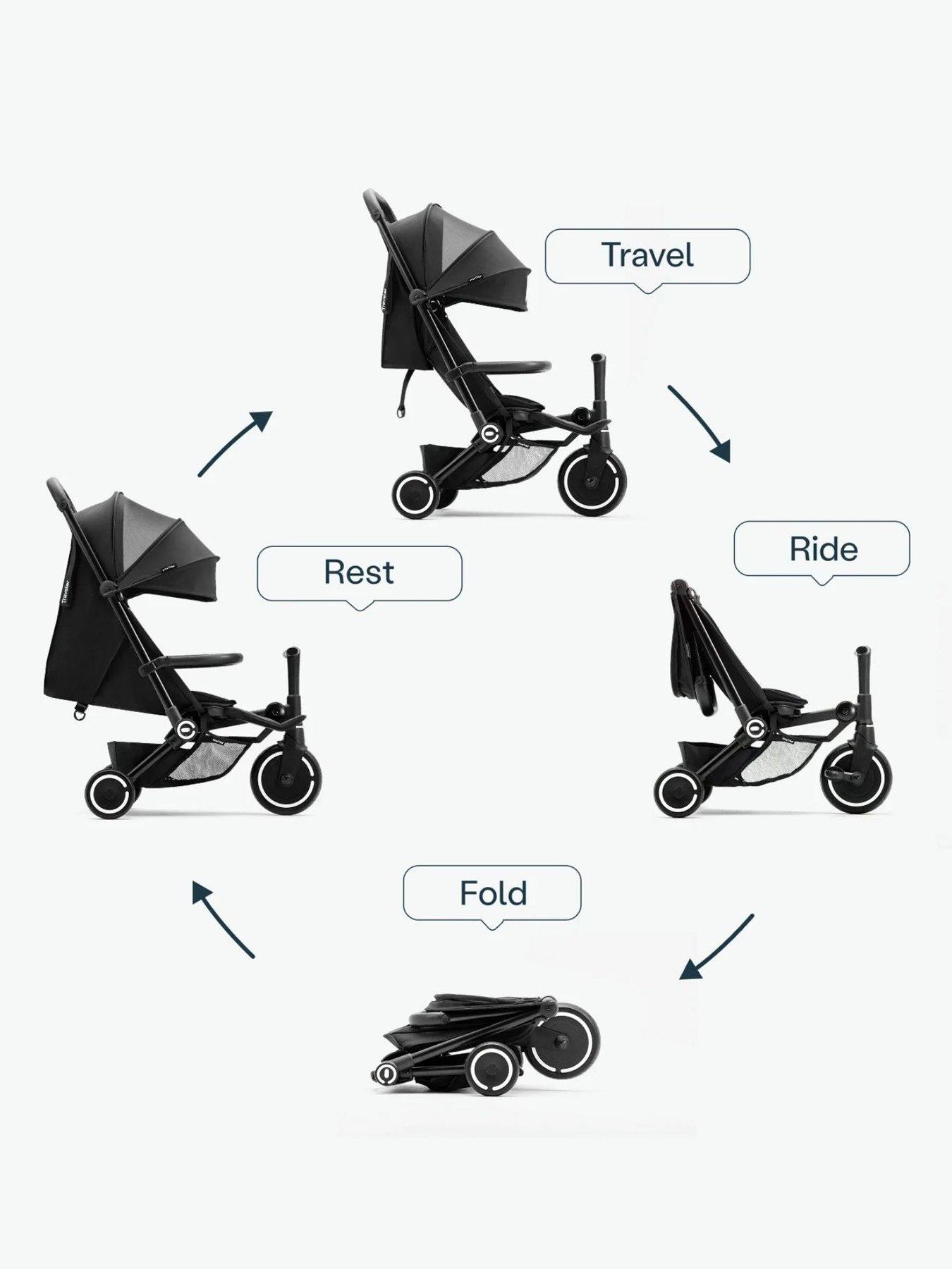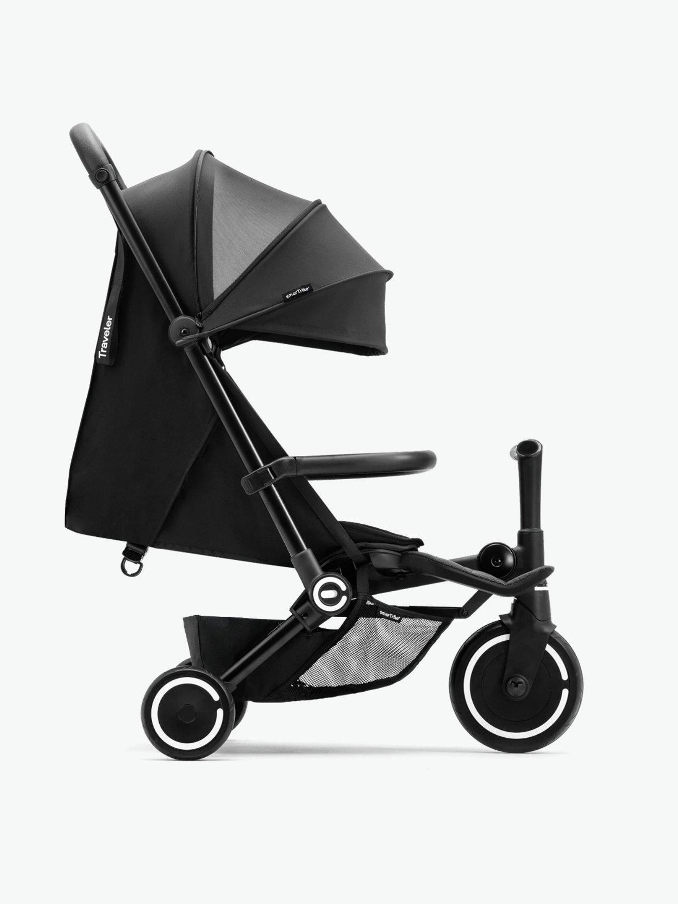 • Easily converts from stroller to trike at the push of a button for effortless transitions