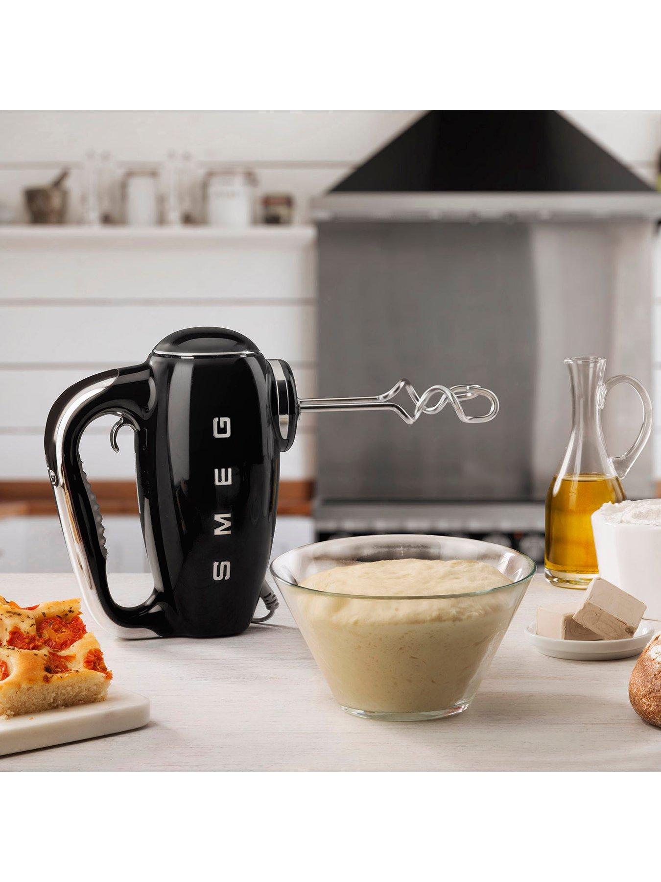 Smeg HMF01BLUK 50's Retro Style Hand Mixer with Turbo Function, 3 Attachments, LED Display, 250W, BlackThis retro hand mixer offers comfortable and easy use, with powerful results. There are up to nine speed levels to choose from including a turbo function, great for heavier mixtures where extra power is needed. There is also a smooth start action which will stop dry ingredients escaping from the bowl.BACKLIT LED DISPLAY The control panel features a Backlit LED display which indicates the speed and time of use. The User-friendly display disappears when the product is turned off, leaving the chrome of the handle in all its glory. MULTIPLE SPEEDS The HMF01 electric hand mixer is suitable for numerous sweet and savoury preparations. With the two function keys allowing you to select from 9 different speed levels for mixing, whipping and, when extra power is needed, activating the Turbo function. MULTIPLE ACCESSORIES INCLUDED This Hand Mixer is equipped with three different types of stainless steel whisks to guarantee the best results. Included are two wire whisks, for the airier textures such as whipped cream, sauces or egg whites; two optimus whisks, ideal for semi-hard dough such as biscuits and cake bases; two dough hooks for leavened products such as pizza or bread and one Smeg personalised fabric case for storing all of your accessories. EASY TO USE At just 1.15kg this Hand Mixer is lightweight and easy to use. With the ergonomic handle it ensures easy handling and a comfortable use. Other features include a rapid release trigger for simple removal of the accessories and a self-balancing design with non-slip feet for secure placement. Compact in size and lightweight, the Smeg hand mixer is a great space saving alternative to a stand mixer is kitchen worktop space is limited.