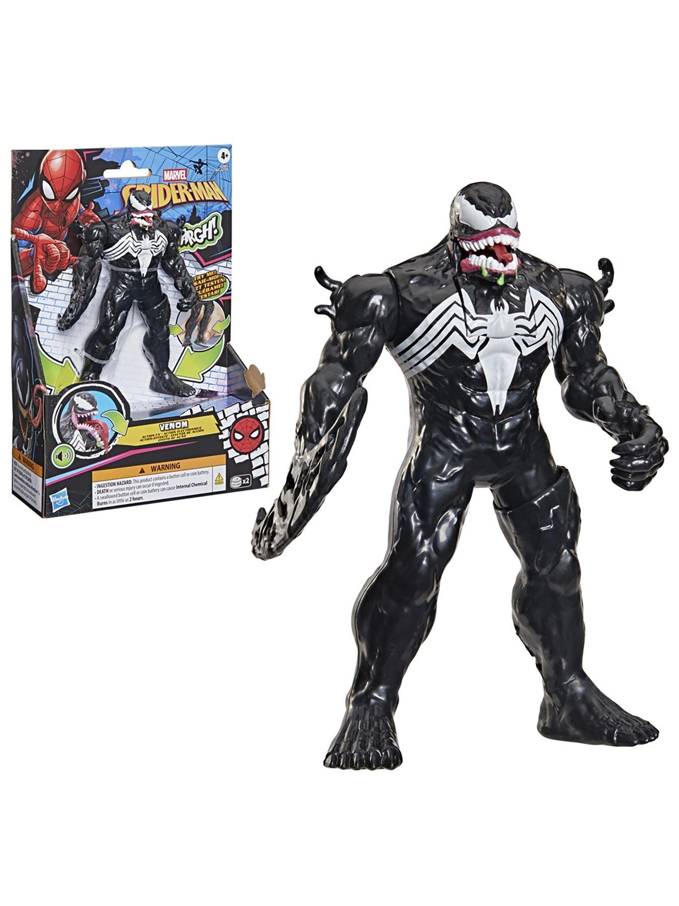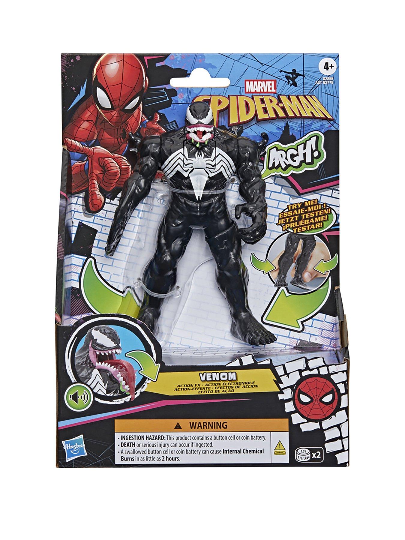 Spiderman SPD ACTION FX 6IN VENOM FIGUREImagine snarling symbiote action with this Marvel Spider-Man Venom Action FX figure from Hasbro! This 6 inch toy features classic black-and-white symbiote suit design, inspired by the Marvel comics, and features 6 unique sound effects. To activate the Action FX feature, simply squeeze the figure's legs together, opening Venom's mouth to reveal a long red tongue and extra fangs, accompanied by snarling, growling sounds. Marvel Action FX toys feature iconic, fan-favorite characters, including Venom and Miles Morales. Kids ages 4 and up will love imagining their own evil alien adventures with this collectible action figure. Marvel toys from Hasbro make great gifts for birthdays, holidays, and other special occasions. Look for more Spidey toys for boys & girls to collect, including figures, playsets, vehicle toys, and role play gear! (Each sold separately. Subject to availability.)Copyright MARVEL. All trademarks and registered trademarks are the property of their respective owners. HASBRO and all related trademarks and logos are trademarks of Hasbro, Inc.
