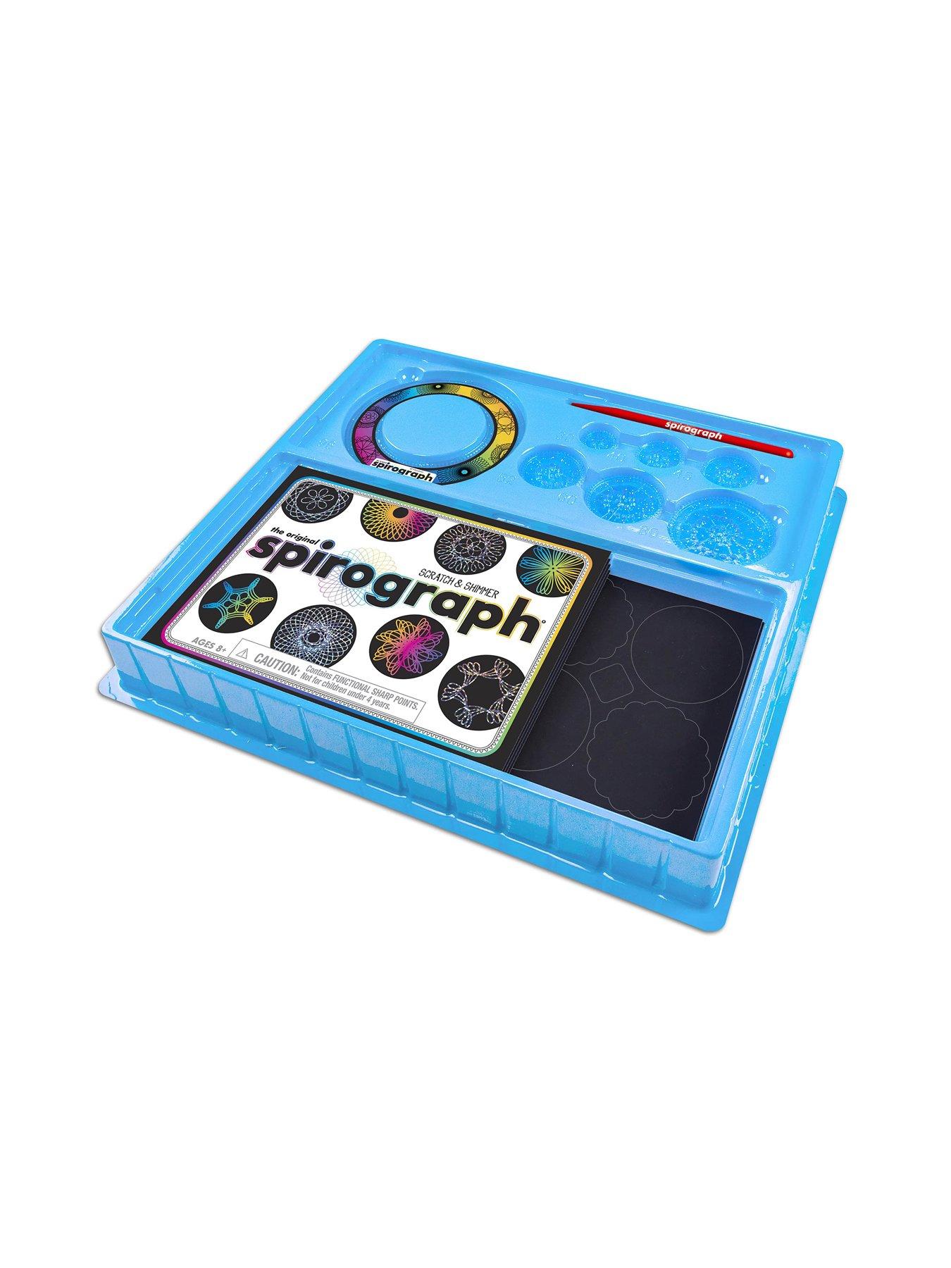 Spirograph Scratch And ShimmerThe Origional Spirograph with a twist. Add a touch of colour and sparkle with to your designs with the Scratch and Shimmer Spirograph Set!Etch out the most colourful Spirograph creations yet with new rainbow and sparkly waxed scratch sheets, sticker sheets and glitter precision wheels. Simply set the wheels up, insert the drawing tool and let the creativity flow! Round and round you go until you have an intricate spiral-design!AGE 8 AND OVER . INCLUDES Drawing Stylus Deluxe Non-Slip Ring 6 x Glitter Precision Wheels 8 x Sparkly Scratch Sheets 8 x Rainbow Scratch Sheets 1 x Sparkly Sticker Sheet & 1 x Rainbow Sticker Sheet 10-Page Design Guide Snap In Storage Tray |