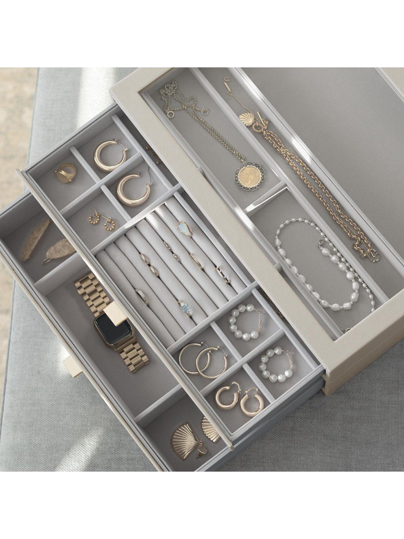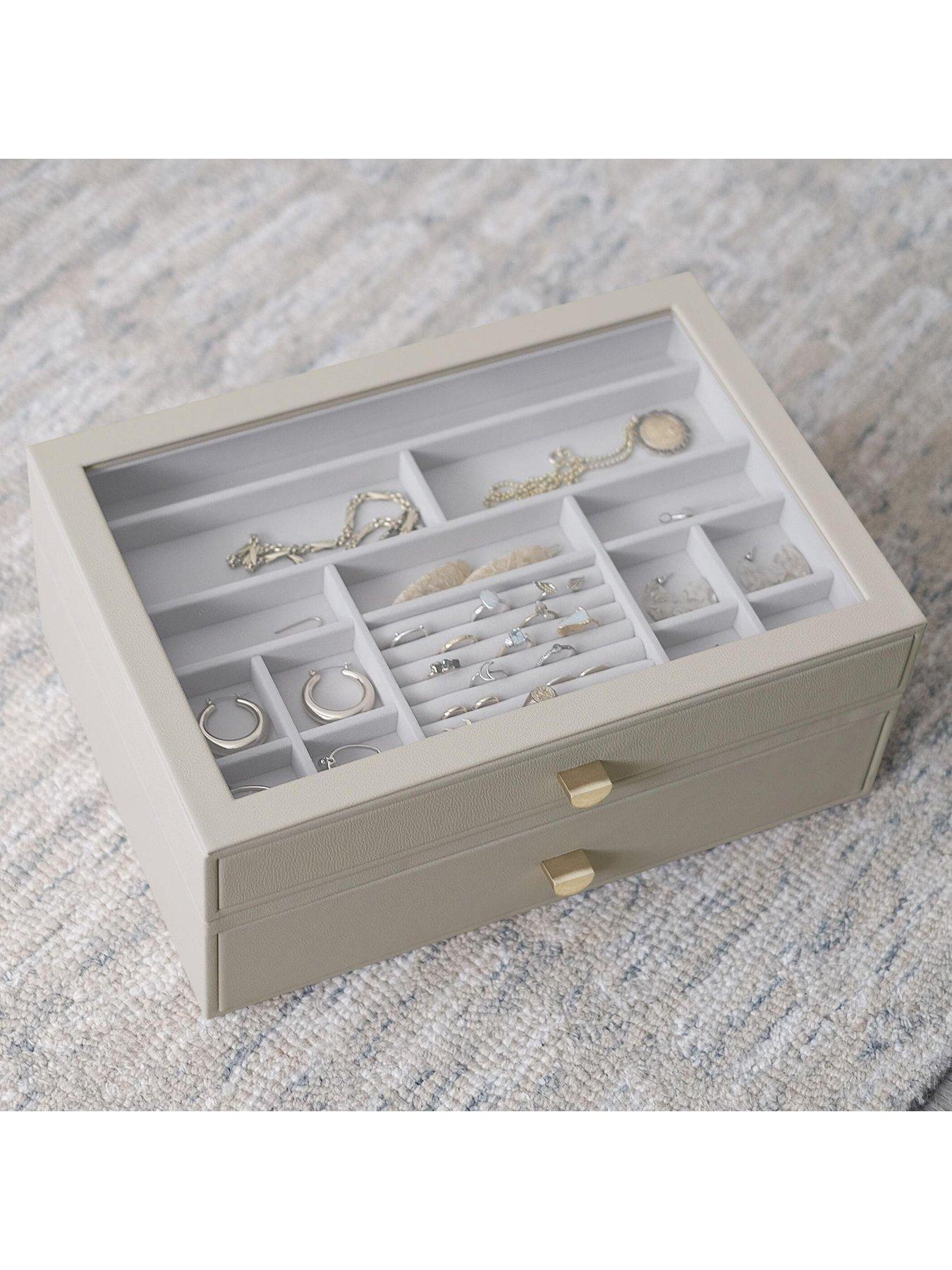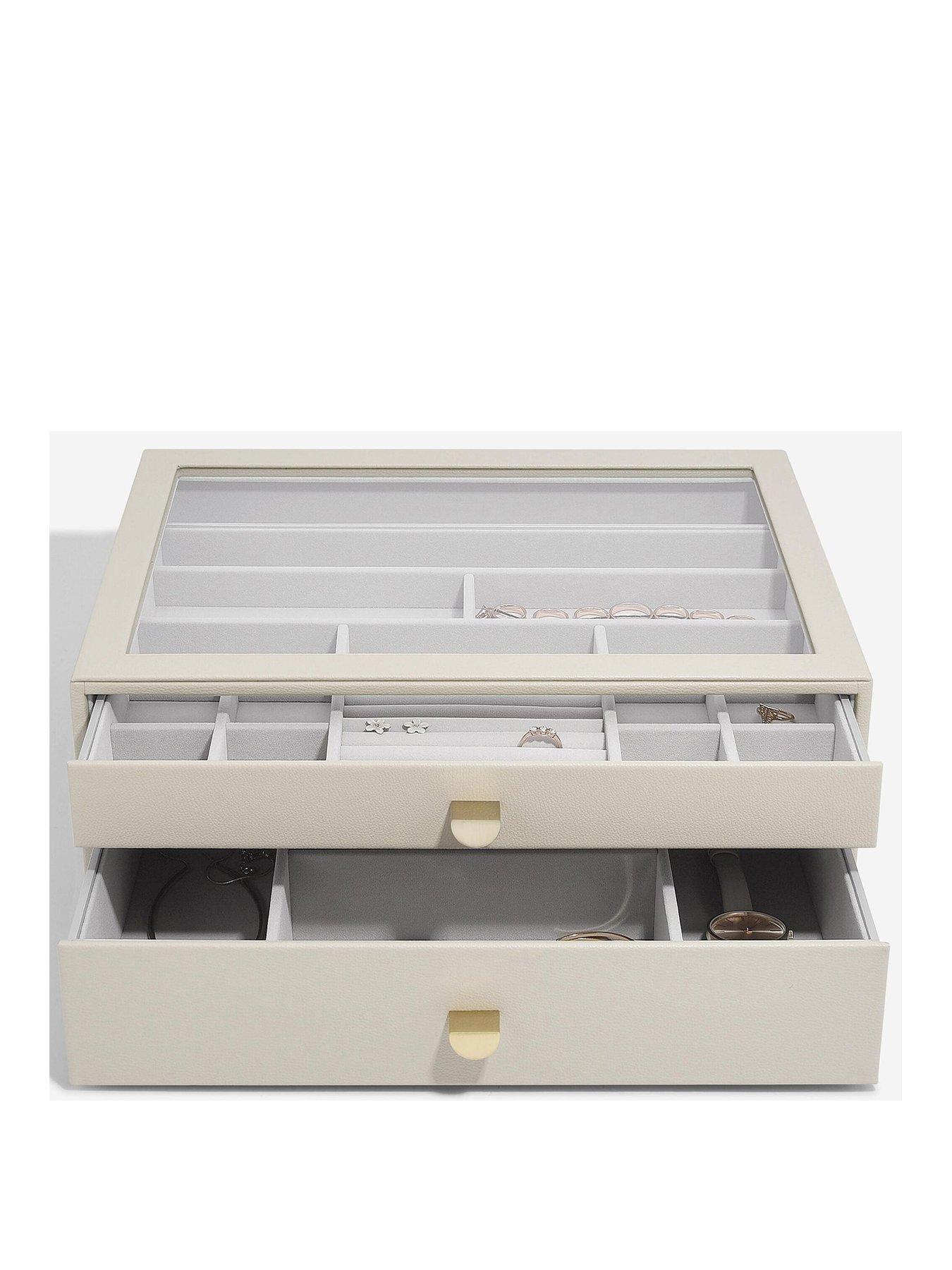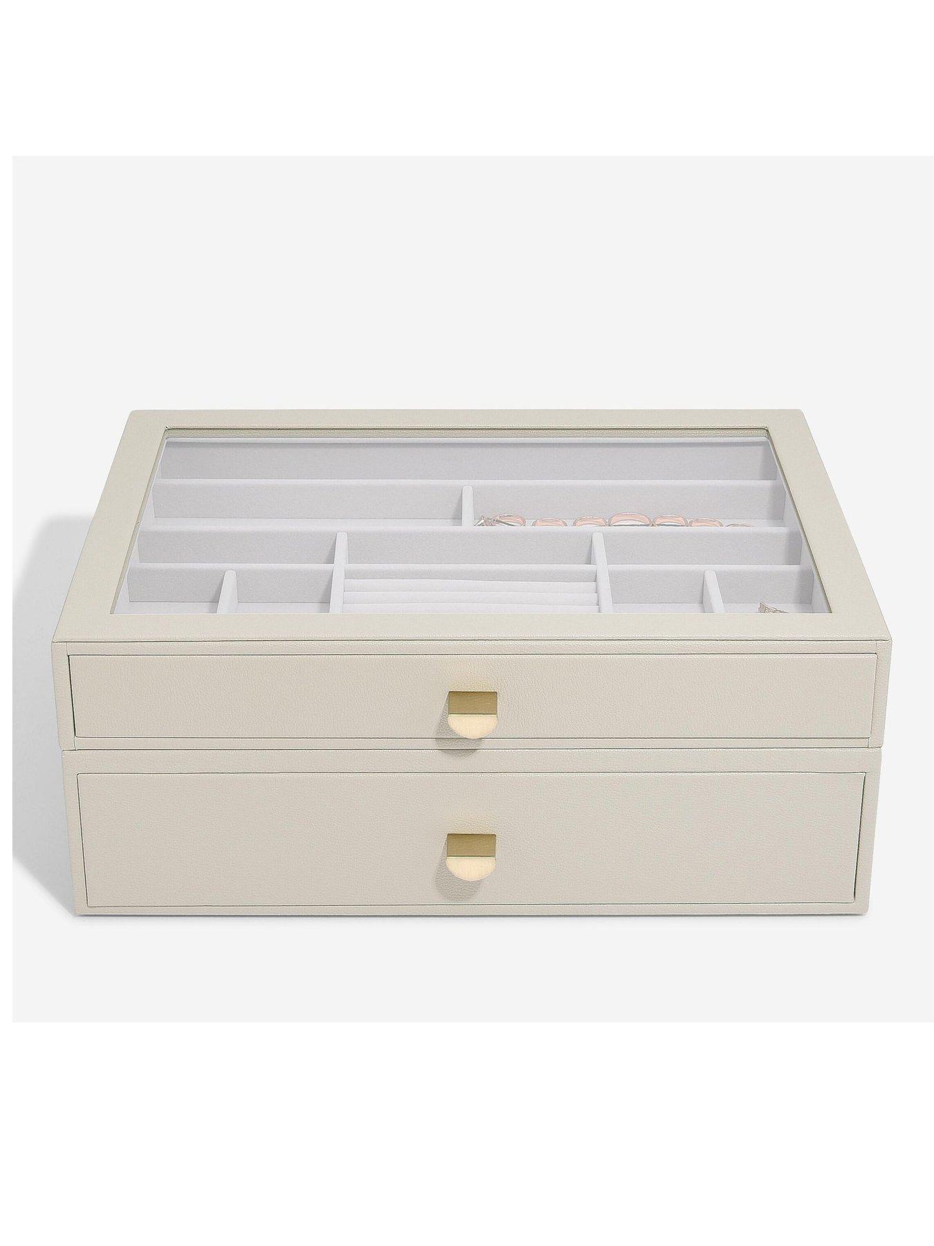 Stackers Oatmeal Supersize Jewellery Box - Set of 2 (with drawers)There'll be no excuse for your favourite jewellery to be anything other than tangle-free and organised! The Oatmeal Supersize Display Jewellery Box Set of 2 is ideal for almost every jewellery collection. With plenty of space to keep your necklaces, rings, earrings, watches and more, beautifully organised and safe. Featuring a clear glass lid for visibility and easy access to your favourite pieces. What's more, you can easily add another jewellery drawer layer as your collection grows! The Supersize Set of 2 is the ideal starting point and includes the Supersize Jewellery Drawer Lid and the Supersize Deep Accessories Drawer.