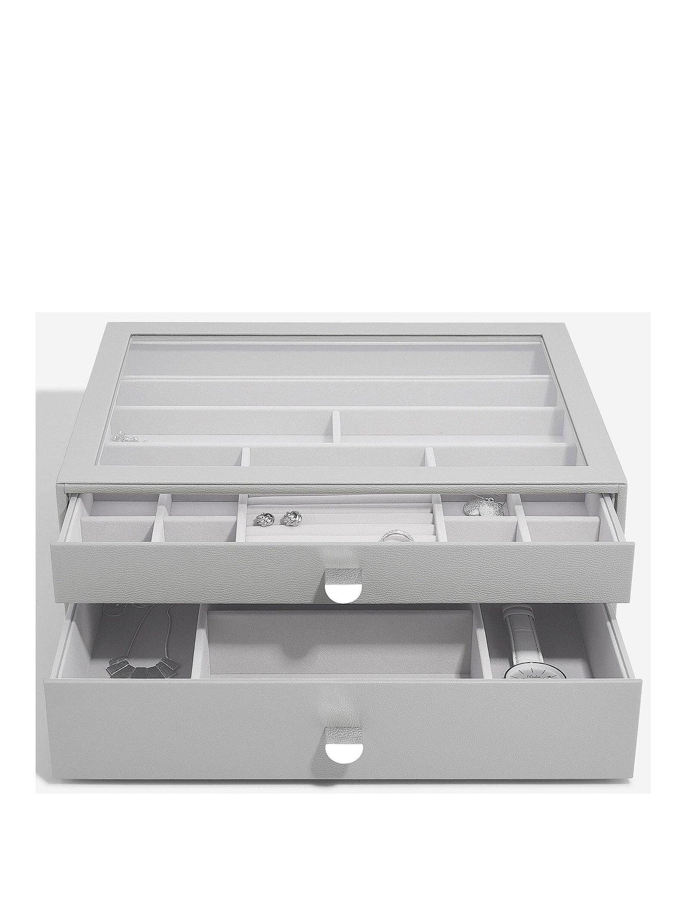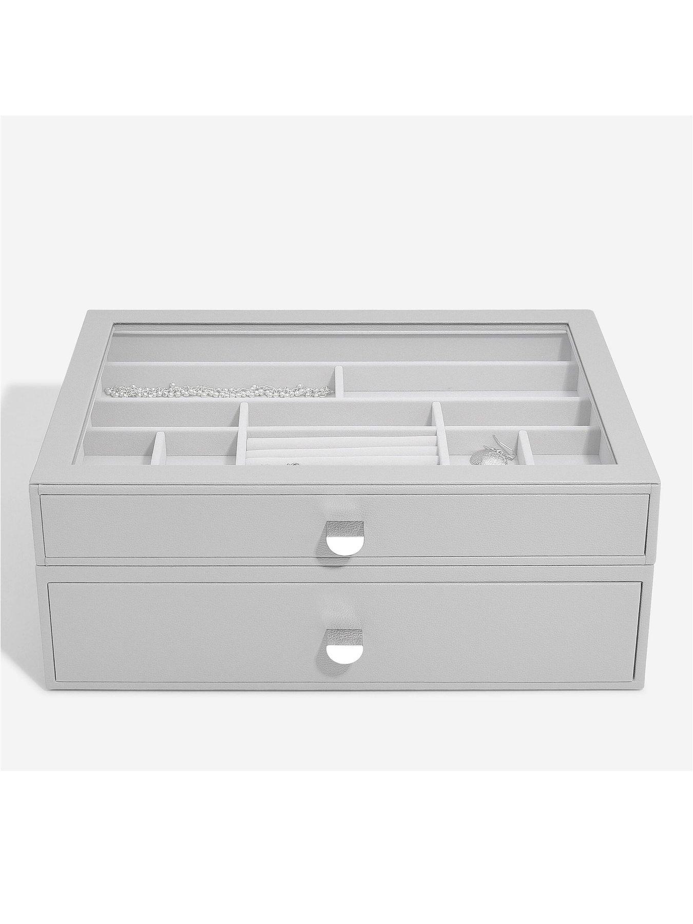Stackers Pebble Grey Supersize Jewellery Box - Set of 2 (with drawers)There'll be no excuse for your favourite jewellery to be anything other than tangle-free and organised! The Pebble Grey Supersize Display Jewellery Box Set of 2 is ideal for almost every jewellery collection. With plenty of space to keep your necklaces, rings, earrings, watches and more, beautifully organised and safe. Featuring a clear glass lid for visibility and easy access to your favourite pieces. What's more, you can easily add another jewellery drawer layer as your collection grows! The Supersize Set of 2 is the ideal starting point and includes the Supersize Jewellery Drawer Lid and the Supersize Deep Accessories Drawer.