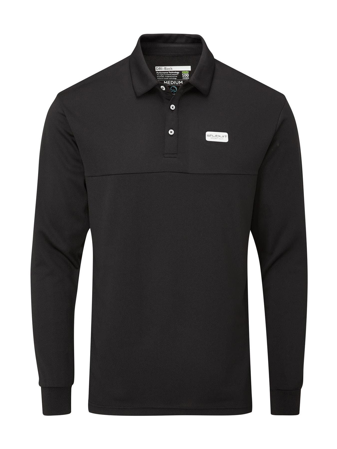 Stuburt Mens Sport Tech Golf Long Sleeve Shirt - BlackThis long sleeve polo shirt is a great, functional piece for any golfer. Created using our well-known Sport Tech fabric it offers a warmer option to sit alongside our original polo. With the new reflective laser cut print to left chest and new branded buttons. Also, with great moisture transfer and windproof properties.