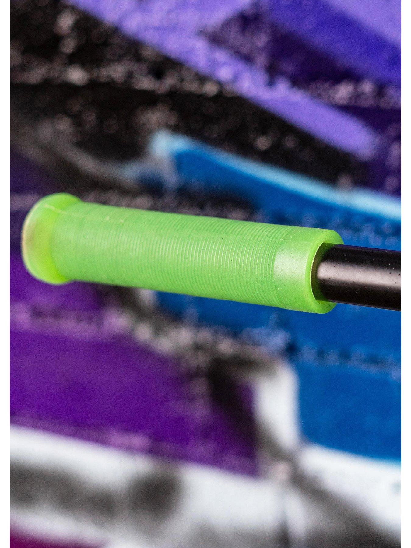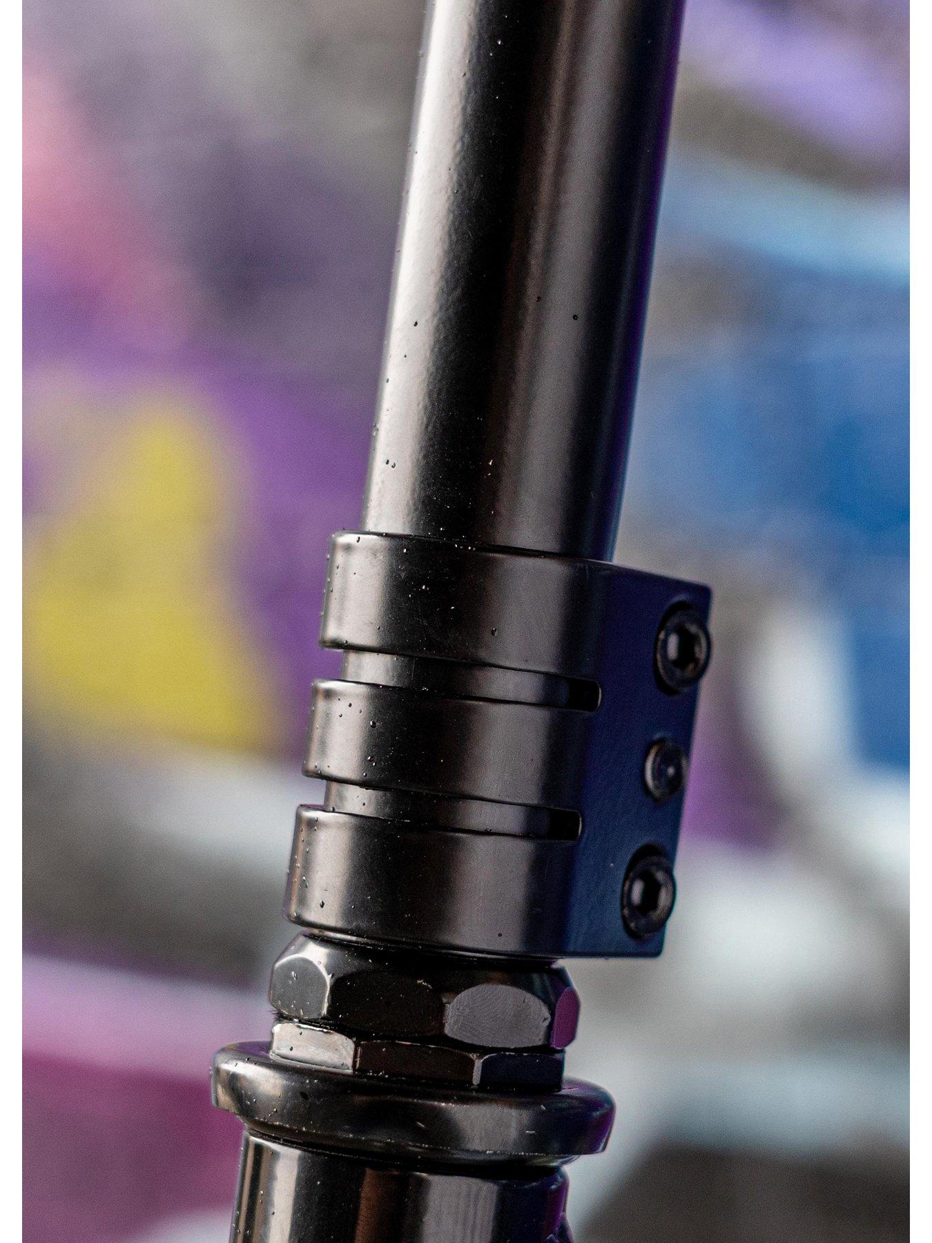 Enter the world of stunt scootering with the Stunted Glow in the dark stunt scooter!The Stunted Glow Storm Stunt Scooter features black gloss and matte elements, that make it stand out for all the right reasons.LEARN WITH THE BEST This scooter is ideal for beginner riders and up and is flush with features to ensure the best ride with the highest quality! READY FOR ACTION The single piece design of the handlebar and stem along with the pro-grade double clamp ensures a solid steering base with moulded grips for comfort. The aluminium deck offers superb stability at a light weight and therefore great for perfecting tricks like whips. STICK EVERY LANDING IN STYLE To keep 360° tricks, steering and riding smooth (as well as fast), the scooter features a threaded headset and ABEC 7 wheel bearings. The tyres are constructed from a solid, puncture proof PU cast with PP spoked cores to ensure excellent stability and streamline performance. And when you need to stop, the reactive rear footbrake will 'grind' you to a holt in a smooth and controlled manner.
