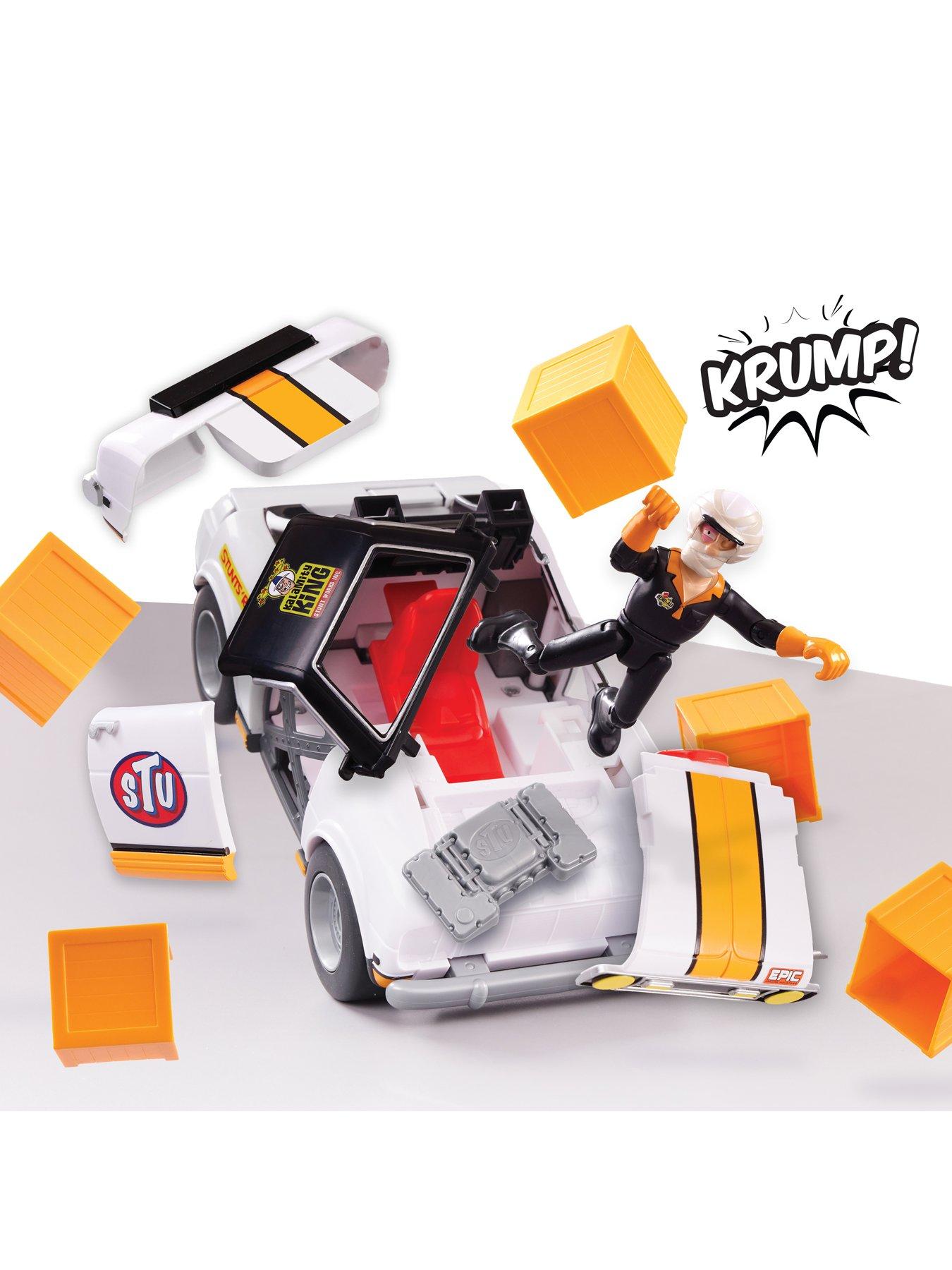 Stuntman Stu Race Ace Stunt CarMEET STUNTMAN STU Yee -Haw! Meet Stuntman Stu, the World's craziest stuntman who does awesome stunts for his awesome fans. There's no outrageous daredevil stunt he won't try, but despite all his best planning Stu is comically injured when his stunts go spectacularly wrong! He really does put the Stu in stu -pid!BREAK APART STUNT SET Create your very own awesome stunts at home with the Stuntman Stu Race Ace Stunt Car. With this break apart stunt set you can build and jump the car, then crash, smash and blow it apart! Including articulated Stu figure, who knows what position he will end up in once his stu-pendous stunts have taken place! POPPIN? OFF PARTS The Race Ace Stunt Car includes multiple ejectable parts that will fly off upon impact on the front bumper. With pop off doors skins and engine, plus ejectable roof, trunk and fly off bonnet, the parts of this vehicle pop off faster than a bee going to a flower show! KNOCK OVER CRATES The set also includes five crates to incorporate into your stunts. Will you launch the car to try and jump the crates, or smash into them because of an epic fail! Configure them in different ways to create different stunts! ENDLESS FUN STUNTS Rebuild the car to create fun stunts over and over again - there's no end of fun and creativity to be found with the Stuntman Stu Smash and Crash Buggy. Get creative with your stunts or even make your own launch ramps at home!