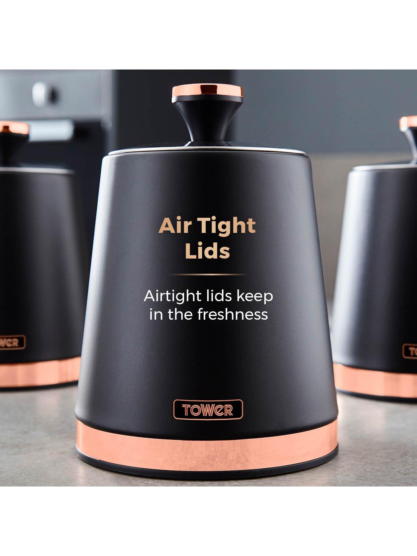 Swan Cavaletto 4 Piece Bread Bin And Storage Canister Set, Black And Rose GoldThis Tower set consists of the Cavaletto bread bin and storage canisters. inner compartment provides plenty of room for a large loaf, while the durable steel container body helps to maintain the freshness of your bread so it stays tasty for longer, having simple access from the easy to lift lid. Each of the containers has a 1.3 litre capacity to store your loose ingredients in a tidy manner, preventing cluttered kitchens. With the removable airtight lids, your favourite ingredients will be kept fresh for longer and makes it easy to replenish them. The contemporary style emphasises sleek flair with its tasteful matte black finish with rose gold accents.LARGE STORAGE SPACE The large inner capacity of the bread bin provides plenty of room for your loaves MULTI-PURPOSE STORAGE Set of 3 large containers with a 1.3 litre capacity, ideal for storing anything from coffee, sugar and tea, to dry pasta and rice LIFTABLE LID The bread bin comes with a fully removable lid to provide quick and easy access to your loaves when it's time for snacking or preparing dinner AIR TIGHT LID The canisters have an air tight lid, sealing in the freshness of your ingredients keeping them fresh for longer CAVALETTO COLLECTION Complete your kitchen design with the full Cavaletto collection to add a touch of style