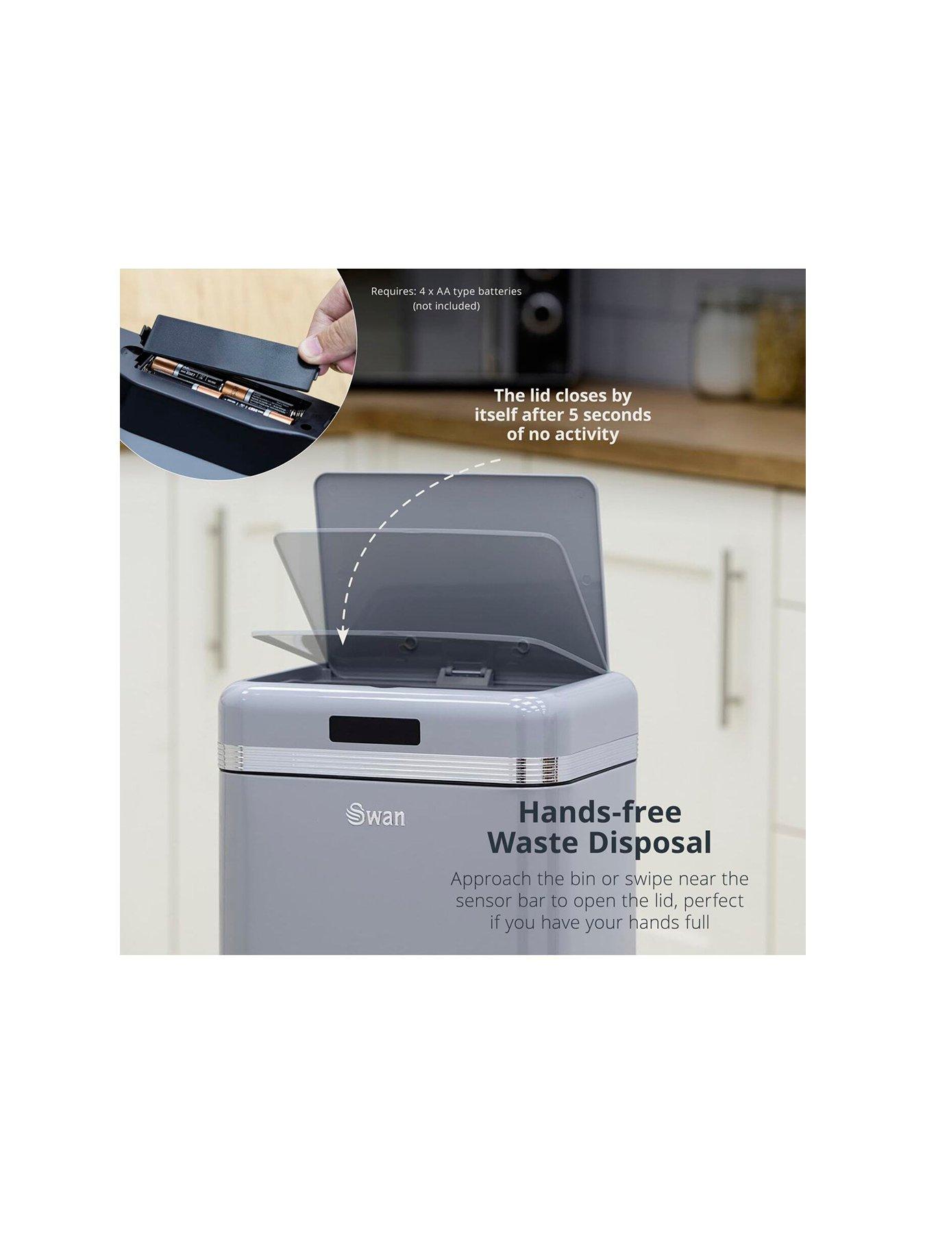 Swan Retro 45l Square Sensor BinThis Swan Retro square sensor bin is the solution to make waste disposal stylish and more importantly, easier than ever. Featuring motion sensor technology, all you need to do is approach the bin or swipe your hand near the sensor bar and the lid opens. The lid then closes after 5 seconds of no activity, providing fuss-free and hygienic waste disposal. This motion sensor bin features a large 45L capacity that takes larger loads of waste with less frequent emptying needed. The Swan Retro bin is made from top quality iron, complete with a stylish retro colour coating that provides long-lasting durability for everyday use. To help keep your liner secure, the specially designed built-in retainer ring simply locks your liner into place around the rim and allows for easy replacement of the bin liner. This sensor bin requires 4 x AA batteries (not included). The Swan Retro collection is inspired by 1950s and 1960s design to compliment all kitchen decors.HANDS-FREE WASTE DISPOSAL The Swan Retro square sensor bin is the solution to making waste disposal stylish and easier. Just approach the bin or swipe near the sensor bar and it opens automatically. It then closes after 5 seconds of no activity, providing hands-free and hygienic waste disposal. Requires 4 x AA batteries (not included) A BIN BUILT TO LAST The bin's body is made from a top quality iron and comes complete with a stylish retro colour coating. You get long-lasting durability to withstand everyday use in the kitchen SAFE & SECURE RETAINER RING Features a specially designed removable retainer ring that locks your bin liner into place and allows for easy replacement of the bin liner 2 YEAR GUARANTEE Assured Swan quality with a 1 year guarantee & optional 1 year extension, subject to product registration online