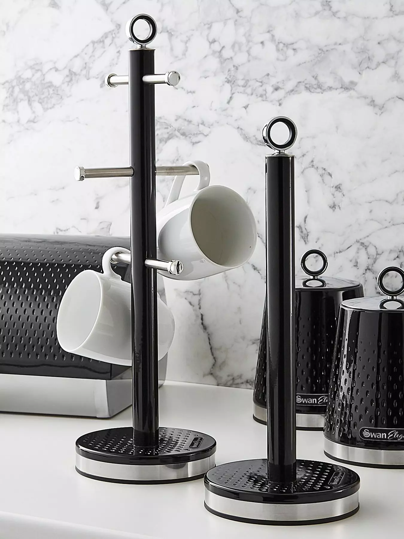 This Swan Elegance towel pole and mug tree set is the perfect addition to your kitchen countertop. Forming part of the Swan Elegance breakfast and storage collection, this set features a contemporary gloss textured finish with chrome accents to compliment any kitchen decor. The mug tree can hold up to 6 cups and mugs of all kinds, while the towel pole fits all standard sized kitchen rolls, so all your essentials are easily accessible from your countertop. The bases are weighted and non-slip to provide additional stability and protect your worktop from scratches. Swan has been providing high-quality household appliances and kitchenware to millions of homes across the UK for over 100 years.ESSENTIAL KITCHEN SET