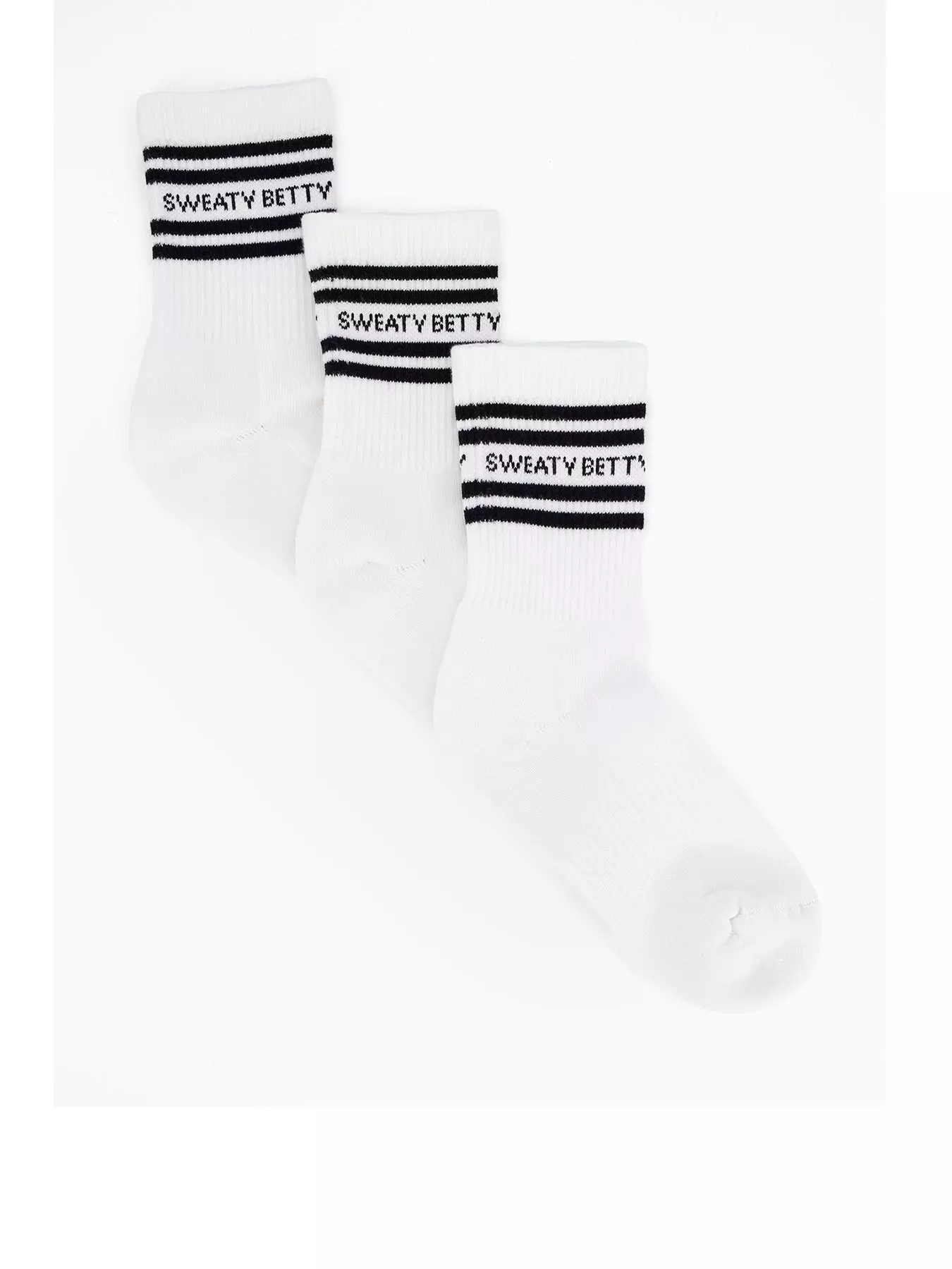 A 3 pack of our classic sporty socks for everyday wear. Made from a soft and stretchy 74% cotton blend. Varsity stripe detail with Sweaty Betty wordmark. Wash at 40°C (104°F) on reduced spin. Do not bleach. Do not dry clean. See care label for additional information.- Material Content: 74% Cotton, 23% Polyester, 3% Elastane