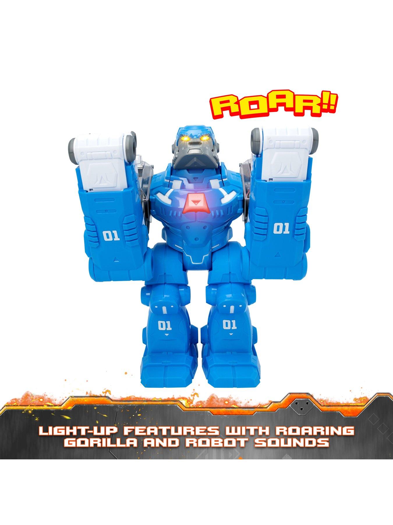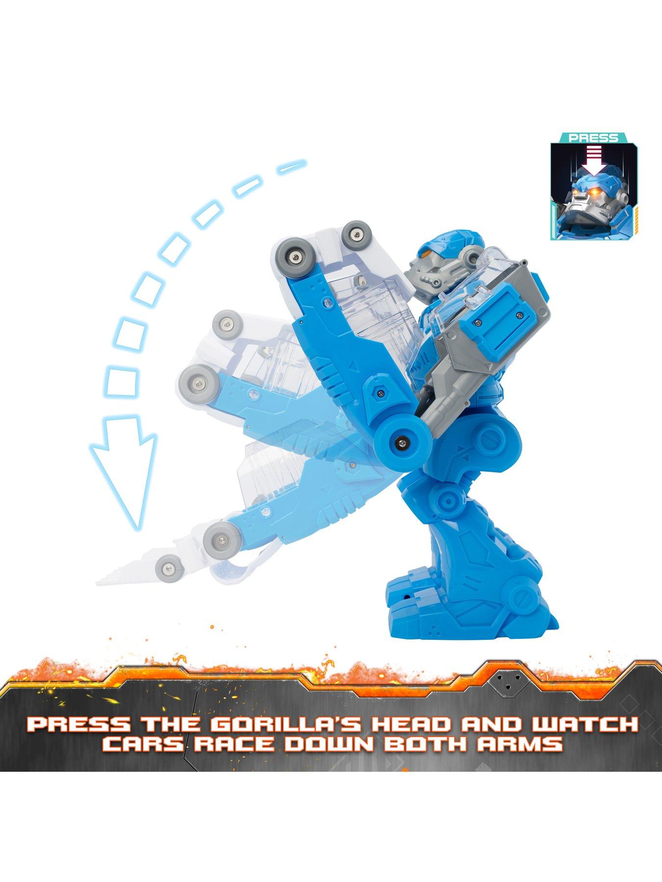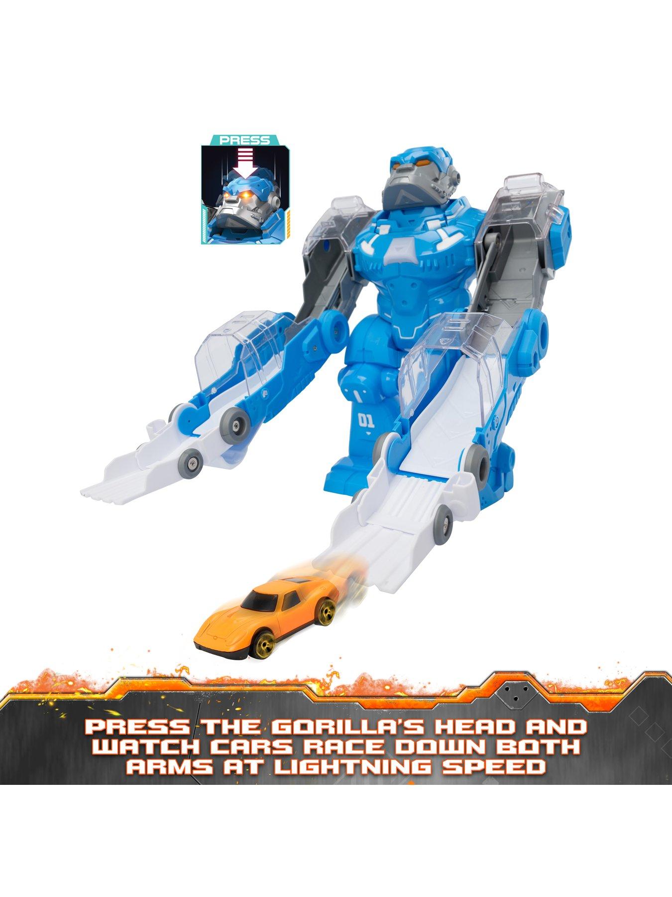 Teamsterz TZ R/W Gorilla Slam + 1 CarGet ready for an action-packed adventure with the Teamsterz Robo Wreckerz Gorilla Slam, a thrilling fusion of a powerful robot and high-speed vehicle play! This impressive gorilla robot is packed with exciting features that will keep kids entertained for hours.The Gorilla Slam allows kids to open the robot's shoulders and load up vehicles for a fast-paced, dynamic play experience. Once the cars are ready, simply press down on the gorilla's head, and watch as it shoots the cars down both arms for an exhilarating launch. The gorilla's arms cleverly convert into track play, turning them into high-speed racetracks that cars can zoom through. The translucent panels on the arms add an extra layer of excitement as kids can see their vehicles race through the gorilla's powerful arms. And it doesn't stop there-this gorilla's LED eyes light up, and it roars with realistic gorilla and robot sounds that take the excitement to the next level. The Robo Wreckerz Gorilla Slam brings an immersive experience to playtime, making every launch and race even more thrilling. The set also comes with 1 Street Machines vehicle, so the fun can start right away. Perfect for kids who love both robots and racing, the Teamsterz Robo Wreckerz Gorilla Slam offers endless opportunities for imaginative play. Batteries are required. This toy is sure to become a favourite in any child's collection. Suitable for ages 3 years +.