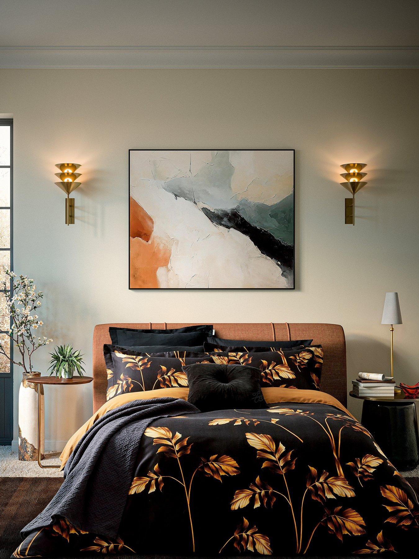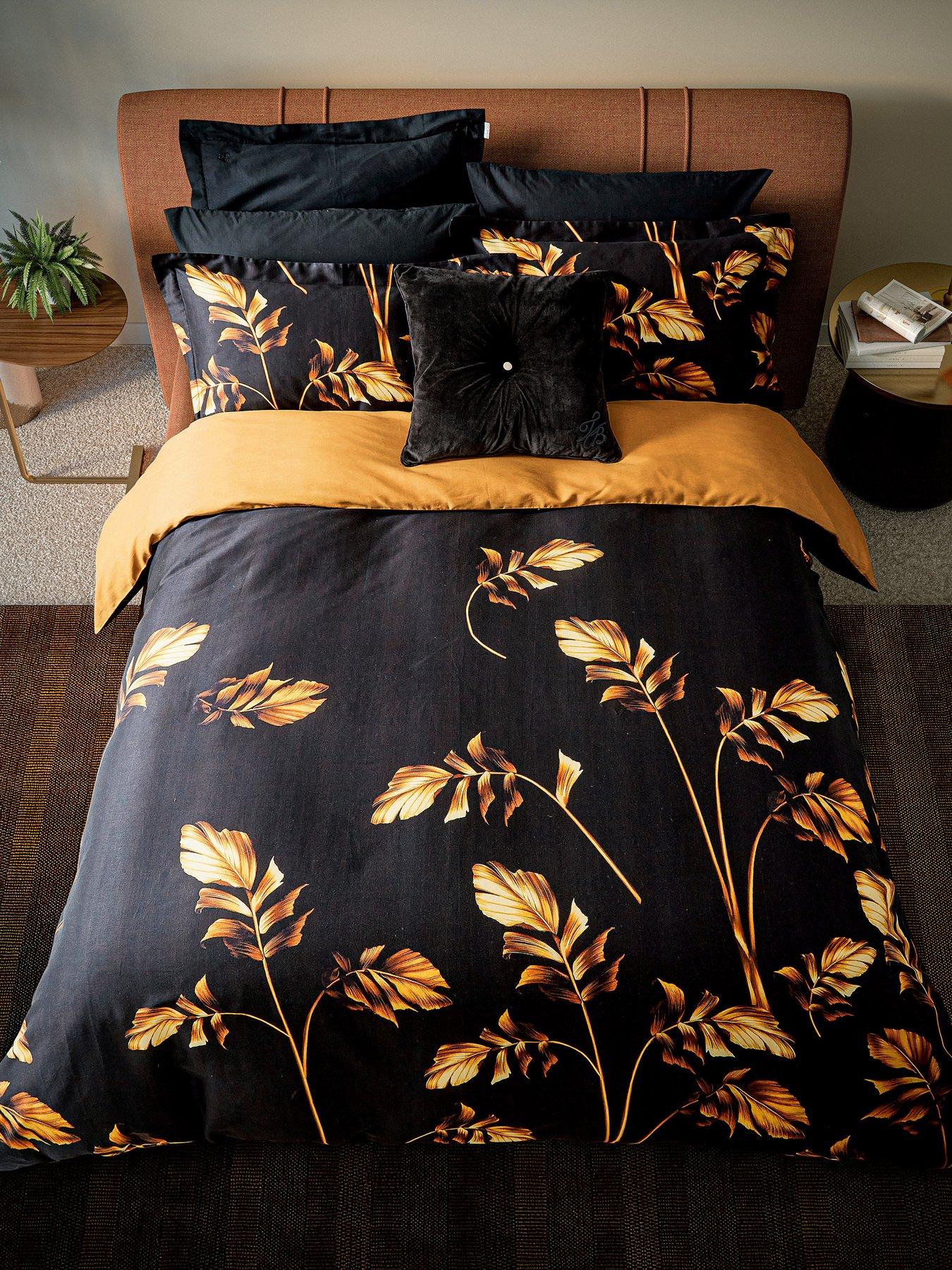 Gilded Floral Cover Set 100% Cotton BlackBring drama to your bedroom with the Gilded Foliage duvet set. Bold golden leaves sweep across a backdrop of fine black stripes, giving your space a touch of moody glamour. Printed on smooth 200-thread-count cotton sateen, it's as soft as it is striking. Each set comes with a pair of matching pillowcases and is available in double, king, and super king sizes.