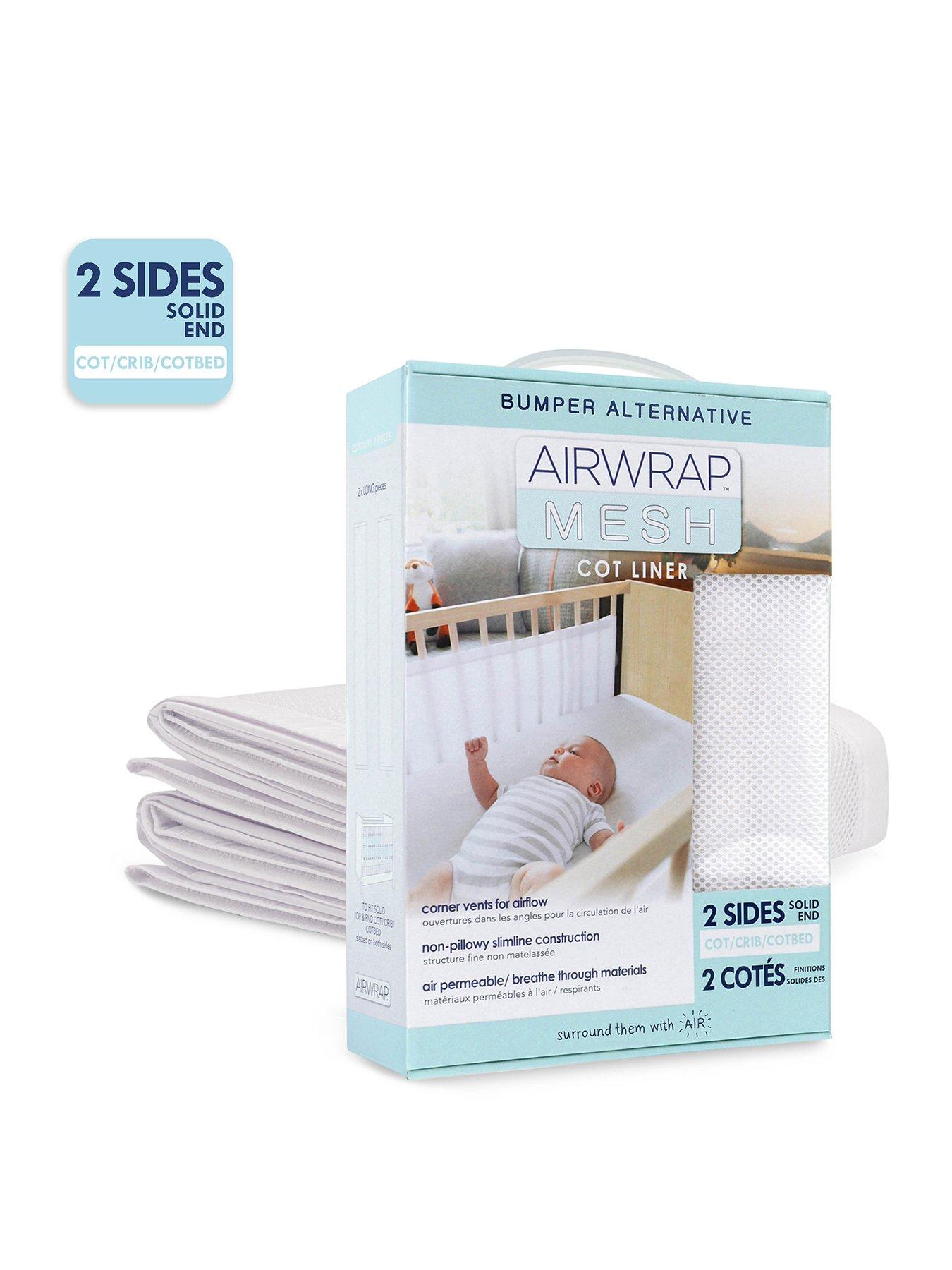 The Little Linen Company Airwrap Mesh 2 Sided Cot Liner, WhiteAirwrap is a safe bumper alternative for your child's nursery. It's unique & improved design means that the Airwrap now fits more cot/cribs than ever before! Unlike traditional cot bumpers and many other alternatives, Airwrap has been engineered with vented corners and superior fit to ensure maximum airflow into the cot in addition to using breathable materials. Airwrap forms a padded, protective layer inside the cot to keep arms, legs, pacifiers and favourite toys safely inside and protects baby against bumps and knocks for improved comfort, peace of mind and a better night's sleep for parents and babies. Each panel is made from a bouncy mesh so it's completely breathable if your baby leans against it. Along with breathability, the mesh core material has been specially selected for its squishy qualities. If stood on, it will squash down and spring back into shape afterwards, so it can't be used by infants to climb out of their cot. Airwrap designers measured hundreds of baby beds during development to ensure maximum adjustability and compatibility with most cots and cot beds on the market, plus secure Velcro fastenings ensure no loose, sagging fabric or dangling bumper ties! Available as 2 sided (for cots and cotbeds with solid ends) or 4 sided (for cots and cotbeds with slats on all sides).