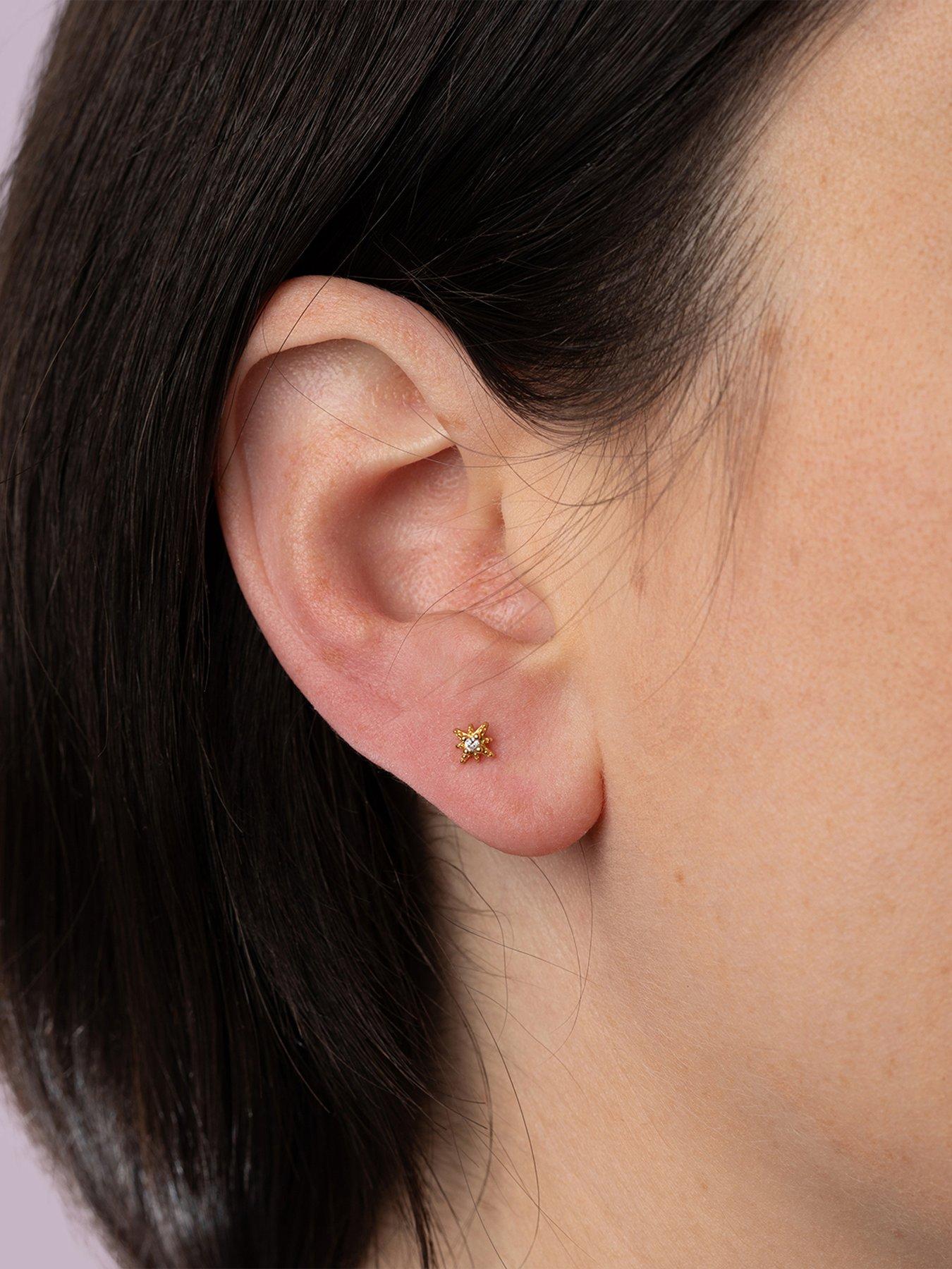The Love Collection Gold Plated Starburst Sterling Silver ball back CZ Stud SINGLEA striking gold-plated sterling silver starburst stud, this single earring showcases a sparkling cubic zirconia stone at its centre. The secure ball-back design ensures comfortable, reliable wear, making it ideal for helix or lobe piercings. Perfect for building an on-trend ear stack, it blends celestial charm with refined shine.