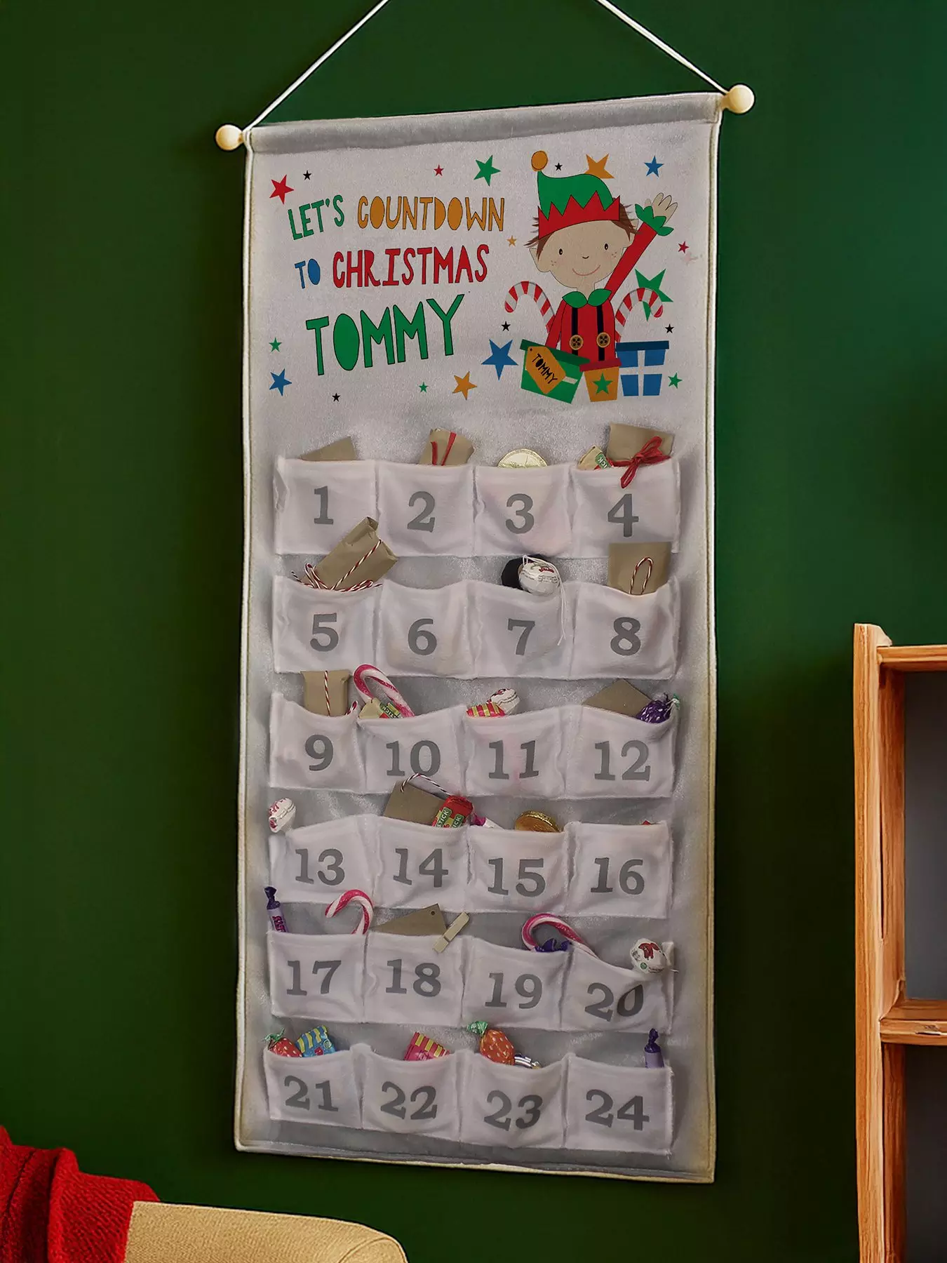 Countdown to Christmas in style with our personalised Christmas elf advent calendar. Made from durable polyester, this charming calendar adds festive cheer to any home while offering a fun, interactive way to mark the days until Christmas.Featuring 24 pockets, it's perfect for little surprises, chocolates, or heartfelt notes. Designed for year-after-year use, it can become a treasured part of your family's holiday traditions.