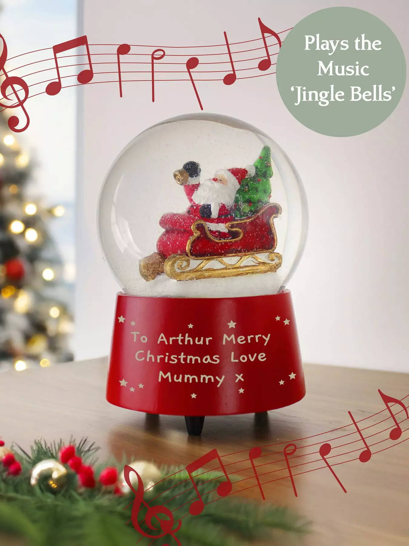 Bring festive magic to your home with this delightful Personalised Santa Snow Globe. Inside the dome, Santa sits in his sleigh, holding a bell, and when you wind the mechanism underneath, it plays the classic tune of Jingle Bells, bringing both music and cheer to your display.Crafted from durable plastic, this charming snow globe makes a perfect keepsake for the festive season.