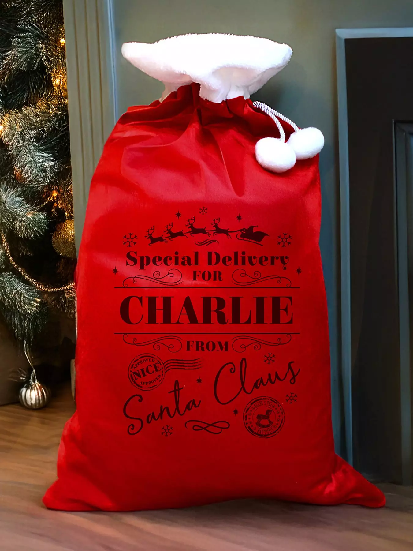 Our Personalised Red Luxury Sack is a charming and thoughtful way to present Christmas gifts, creating a festive atmosphere year after year.This pom-pom sack can be personalised with a name of up to 12 characters, which will appear in fixed UPPERCASE. The phrases 'Special delivery For' and 'From Santa Claus' are fixed and cannot be changed, ensuring a classic and magical look.