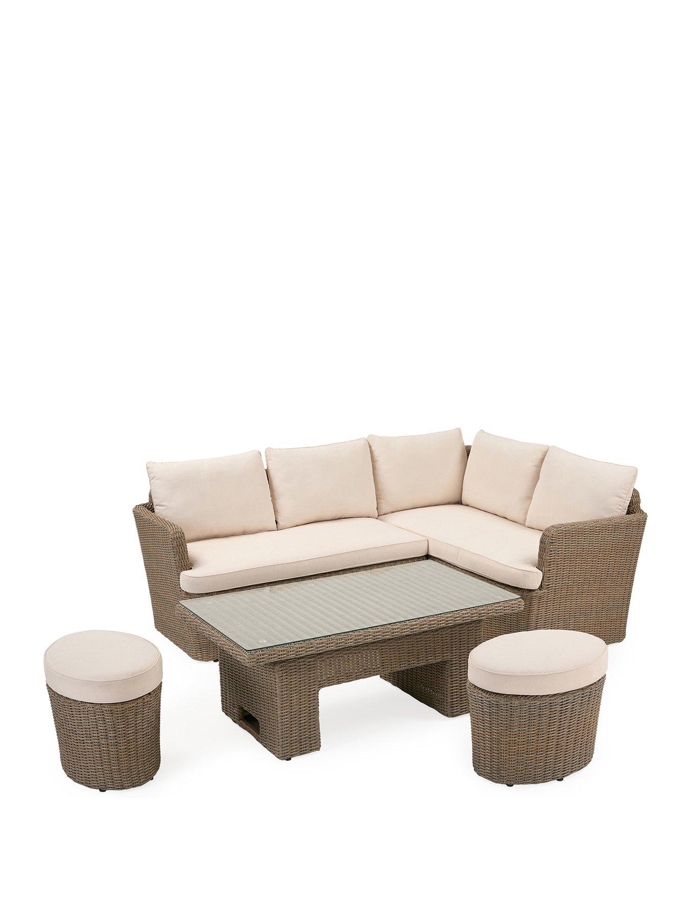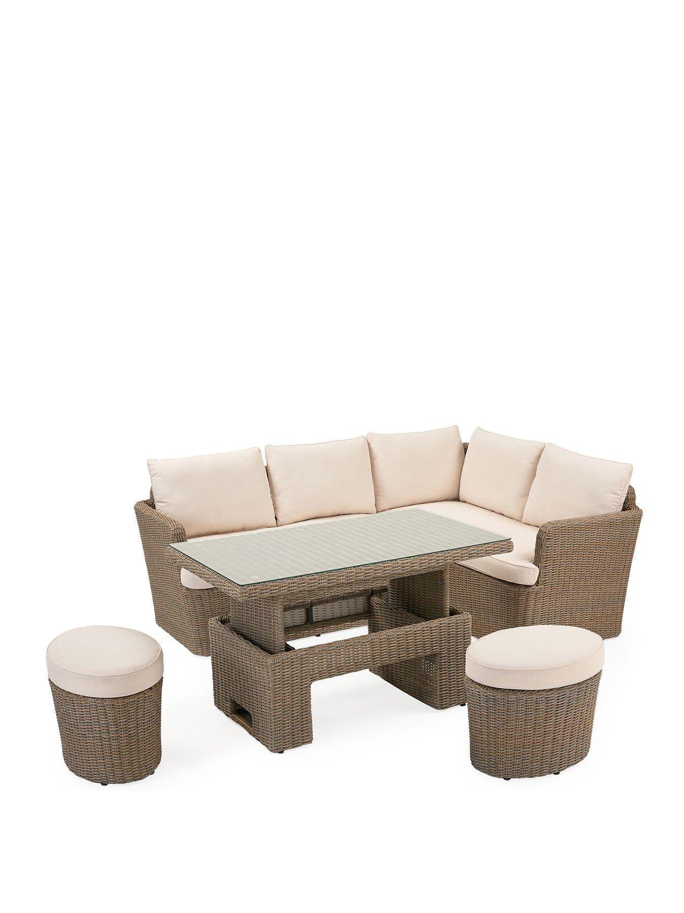 Make the most of your space AND your leisure time with the Albany Corner Dining Set.Compact DesignWith an L shape design, this beautiful and stylish corner set will bring effortless comfort and luxury to gardens and patios where space is at a premium. Lift-Up Table This table always rises to the occasion. At its lowest setting, it is ideal for coffee mornings and chatting with your loved ones. Come meal time, it elevates your dining experience - literally! You can raise the table to enjoy some alfresco dining with your loved ones. Home Comforts With a Breath of Fresh Air With rounded edges and neutral colours, this set has a timeless appeal, fusing contemporary and retro features. The soft cream and beige tones will make the natural colours of your garden pop, bringing a new vibrancy to your home. Durable Aluminium Construction Choosing outdoor furniture with an aluminium base is the perfect way to invest in your leisure time. Not only is aluminium durable and light enough to manoeuvre, but it is naturally resistant to all types of weather conditions and rust - perfect for all-year use.