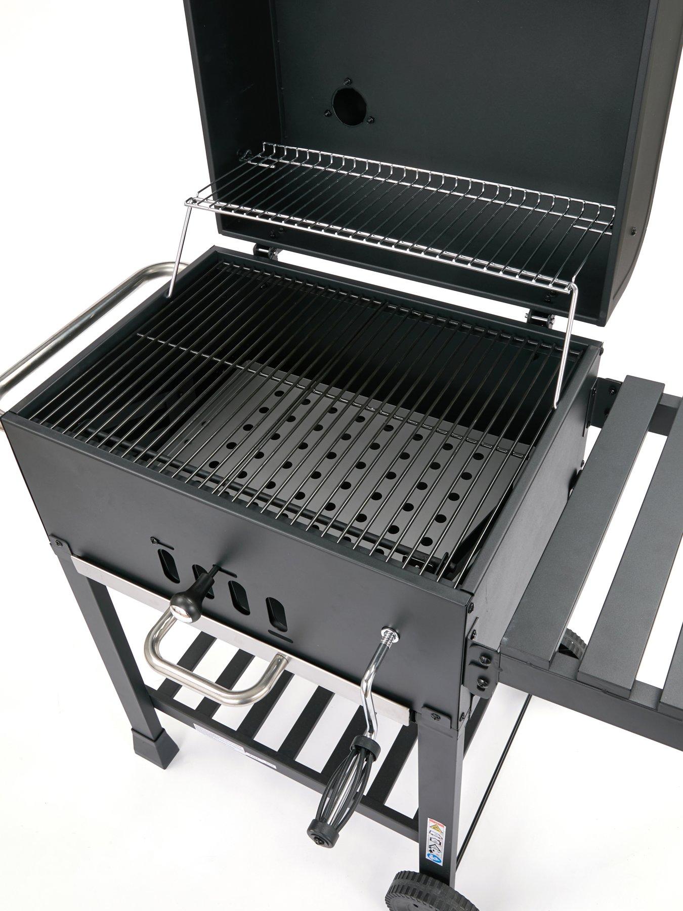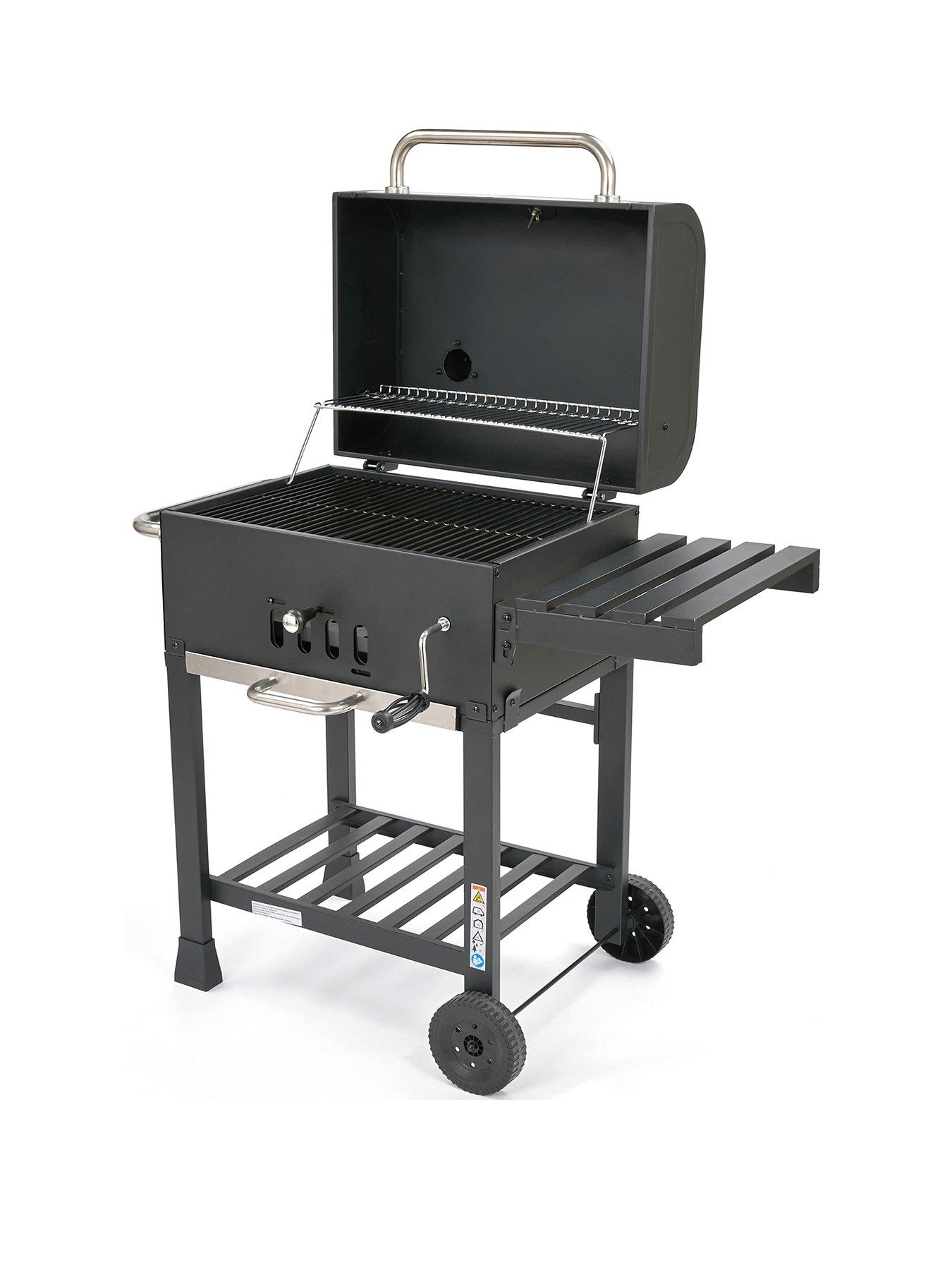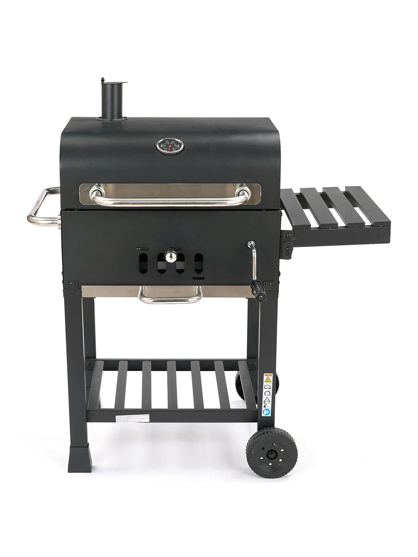 American Style Charcoal Grill BBQ - tasty food that's ideal for sharing while enjoying your outdoor space.A SHARED EXPERIENCECook for friends and family while enjoying the surroundings of your garden. There's a spacious cooking area that can easily fit plenty of delicious food - ideal for steaks, burgers, kebabs, bangers, corn on the cob, fish and much more. The stylish design includes a chrome-plated steel wire warming rack and black-painted hood. SAFE FROM THE WEATHER Also, there's no need to worry about windy weather spoiling your fun because the hood will keep any sudden showers at bay, with a warming grid for anything that you've finished cooking but isn't ready to go on the plate. What's more, to improve durability, we have changed to a matt finish on future orders. EASY TO MANOEUVRE The trolley design with large handle and wheels means you can move the BBQ easily. There's also a foldable side table for easy storage.
