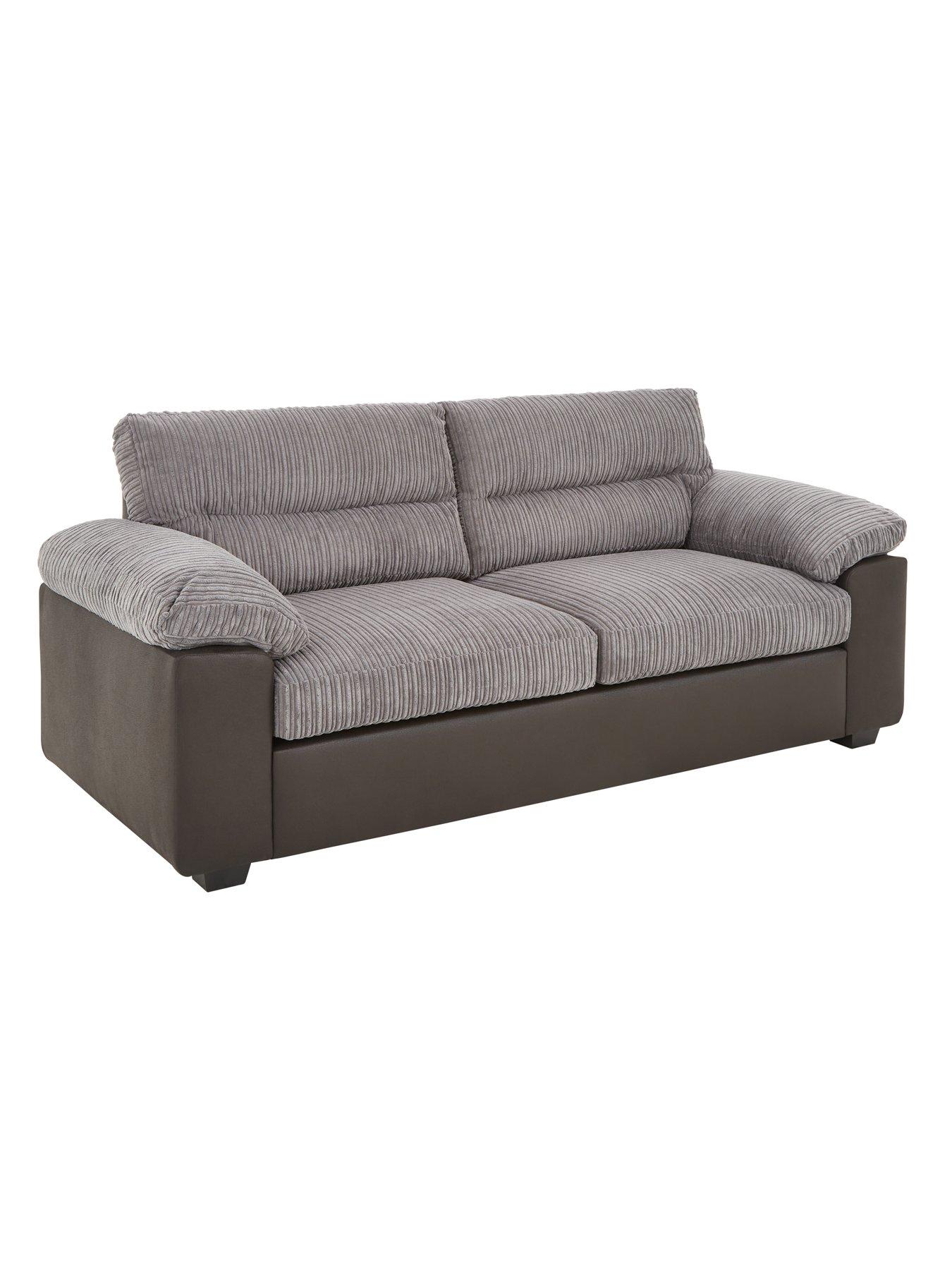 Very Home Armstrong Fabric and Faux Leather 3 Seater Sofa in GreyH 93 x W 207 x D 92 cmModern mix With a fashionable faux leather outer that smartly covers the clean lines of the sofa, Armstrong's cushions are upholstered in a super soft jumbo cord. These chunky lines of fabric are ideal for curling up on when you're unwinding after work or binging your favourite series. The different shades of grey create an eye-catching two-tone effect. Softly does it Fibre-filled back cushions flaunt a split design, while supportive foam-filled seats benefit from S-springs for added comfort and bounce. All cushions are removable for easy plumping. Free Swatch Service Get a feel for this fabric before you buy with our FREE swatch service. Simply email SwatchOrder@ClickSpares.co.uk with your name and address, along with the sofa range name, item number, colour choice and the name of the retailer’s website you’re ordering from. Your swatches will be delivered within 5 working days (subject to availability). Please remember to measure your available space before ordering. Dimensions: Height 93, Width 207, Depth 92 cm