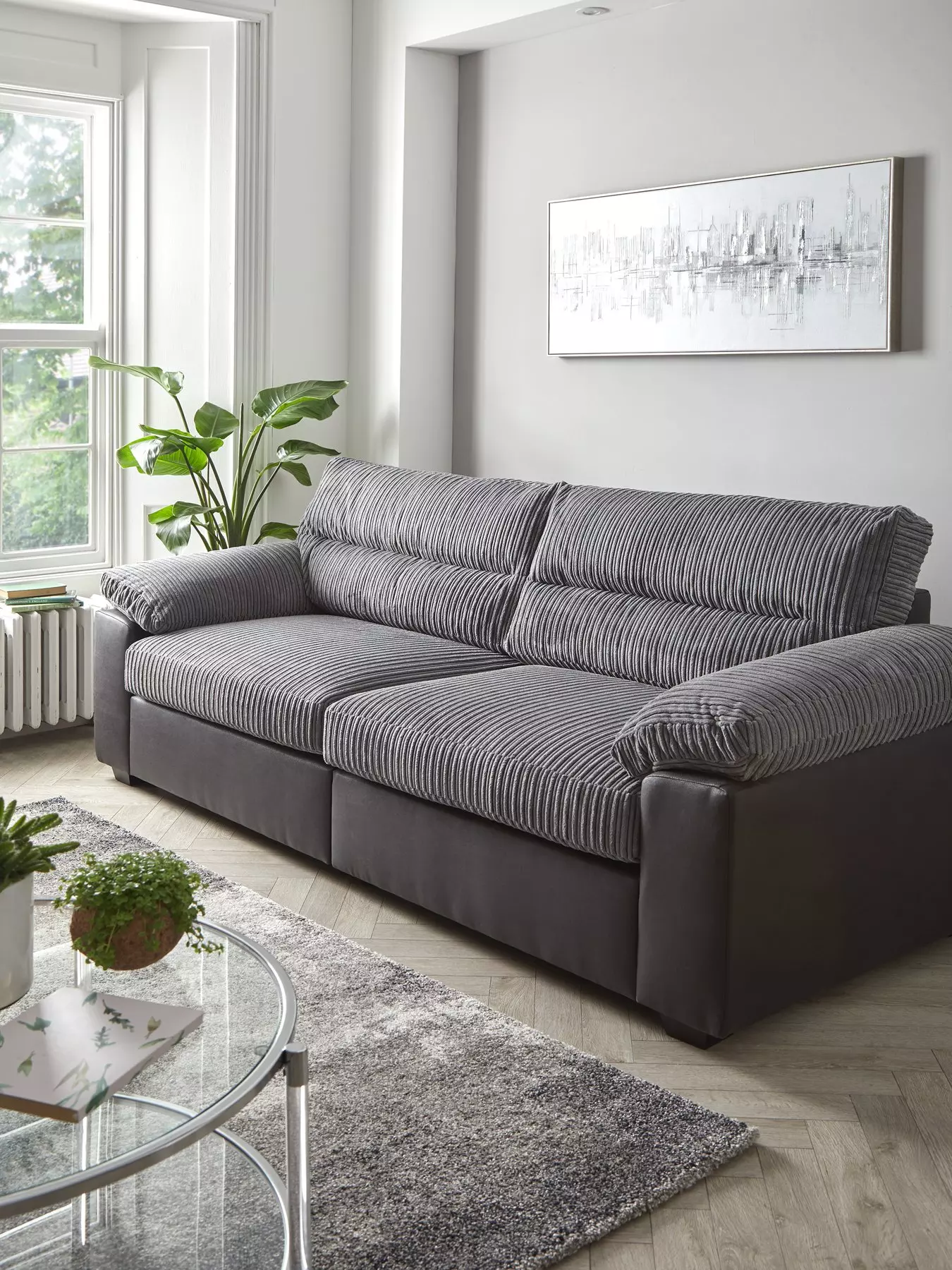 With a fashionable faux leather outer that smartly covers the clean lines of the sofa, the cushions are upholstered in a super soft jumbo cord. These chunky lines of fabric are ideal for curling up on when you're unwinding after work or binging your favourite series. The different shades of grey create an eye-catching two-tone effect.