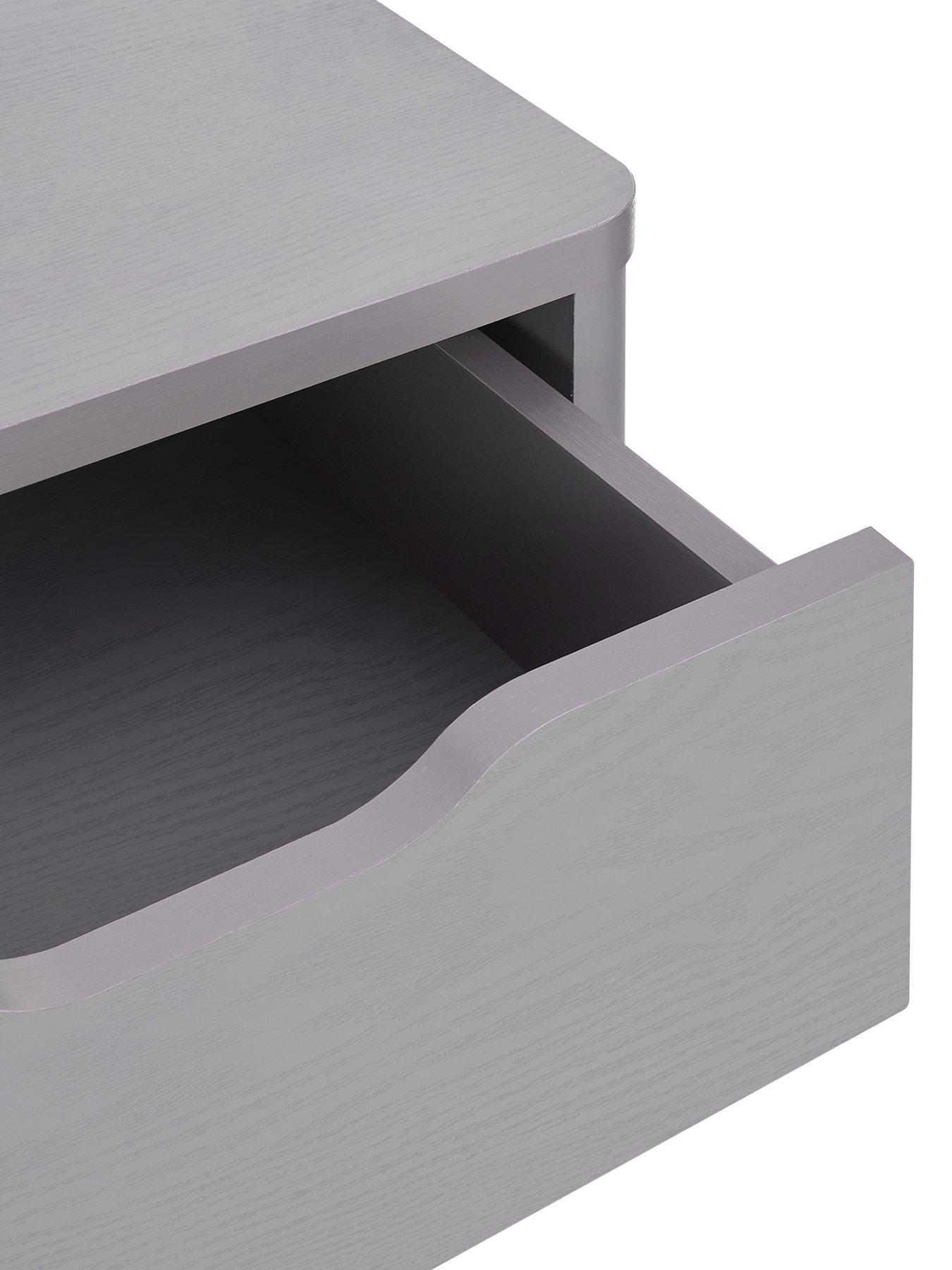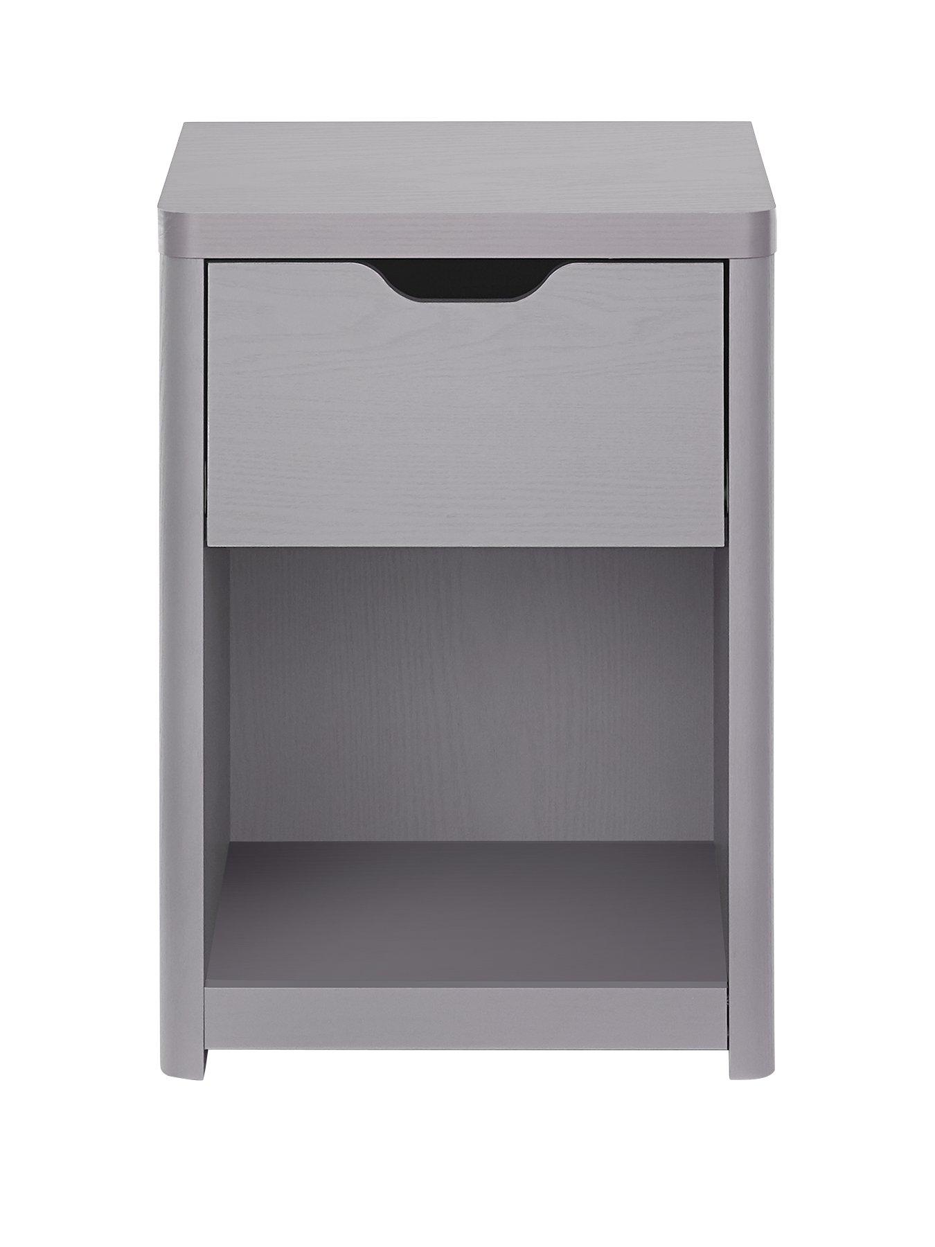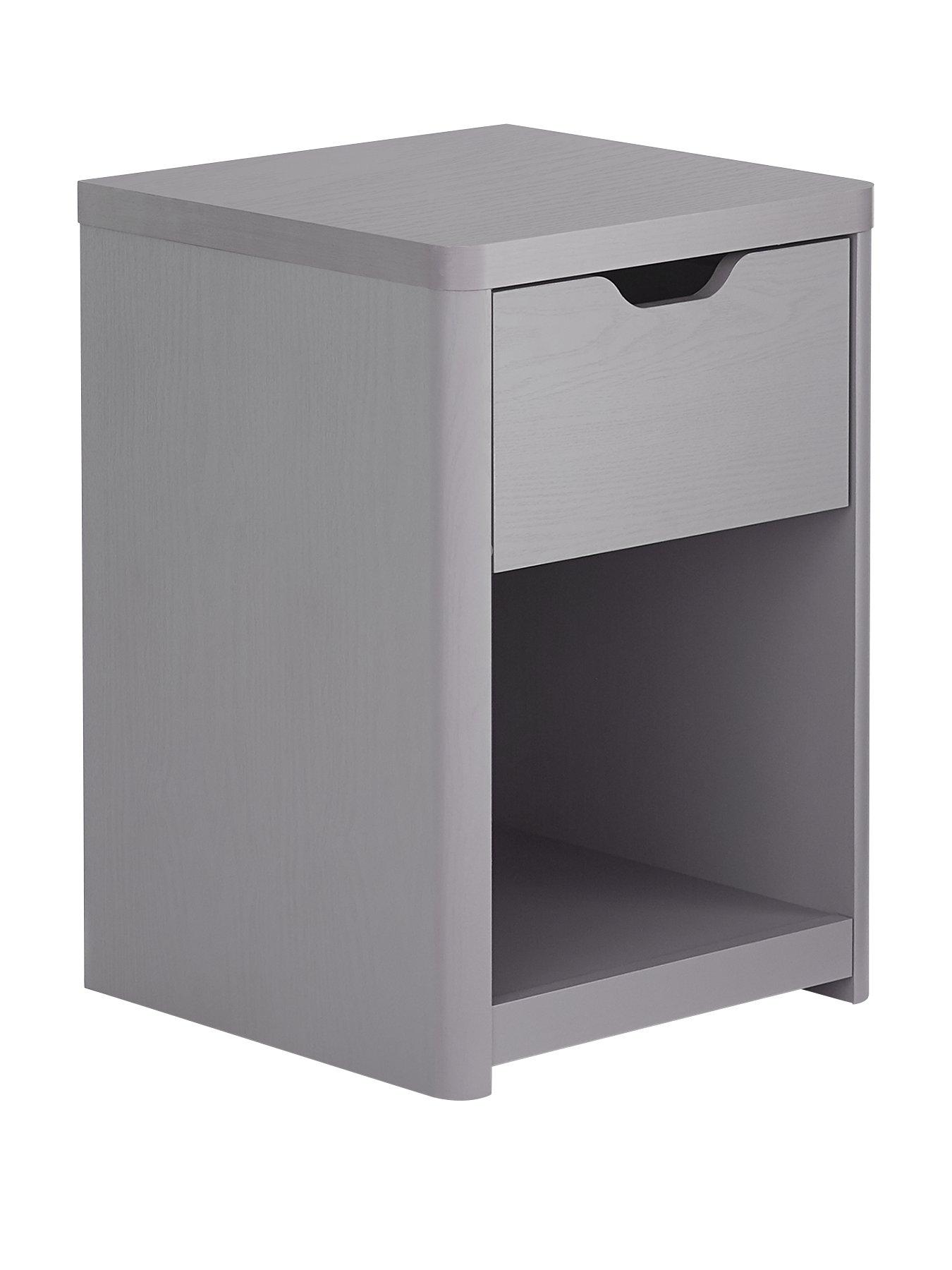 Very Home Aspen 1 Drawer Bedside Chest in Grey Oak EffectIdeal for giving their space a more grown-up look, this bedside chest from Very Home's Aspen collection is finished in a smart grey oak effect that's wonderfully grained for a realistic appearance.A single drawer is complemented by an open display area, and it's finished with a contemporary cut-out handle plus easy-glide metal runners for a smooth, quiet action. Please remember to measure your available space before ordering. Dimensions: Height 56, Width 39, Depth 29 cm