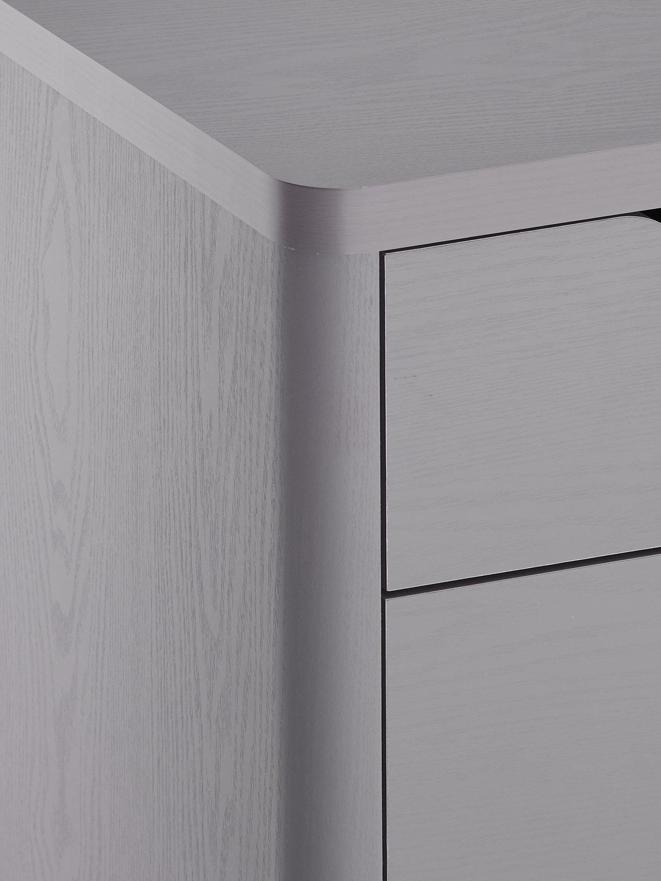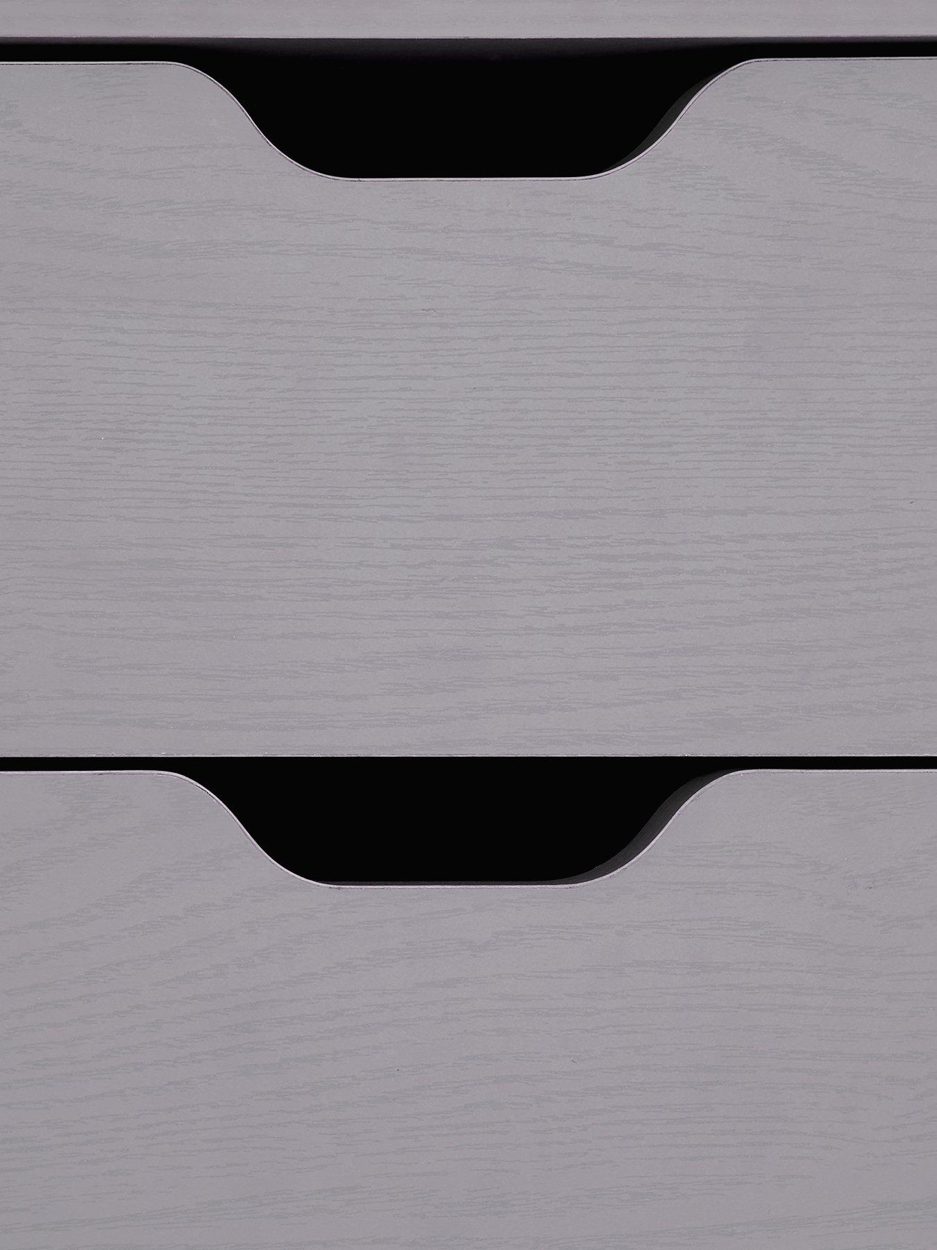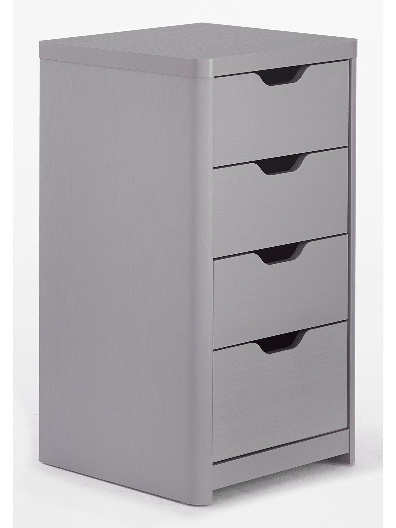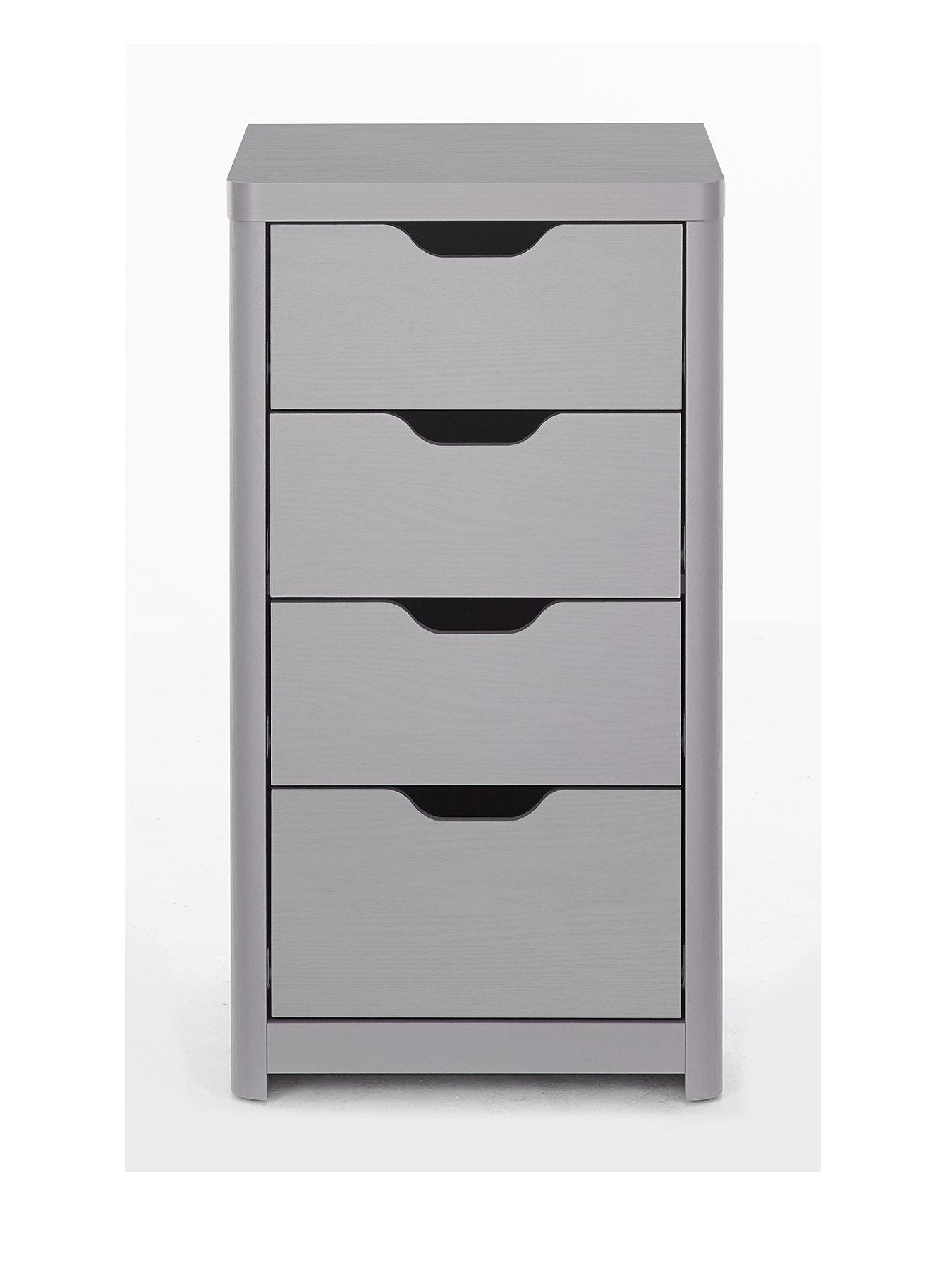 Aspen Slim Chest of 4 Drawers in Grey Oak EffectIdeal for giving their space a more grown-up look, this chest of drawers from the Aspen collection is finished in a modern grey oak effect that's wonderfully grained for a realistic appearance.3 shallow drawers are complemented by a single deep drawer, and they're finished with contemporary cut-out handles plus easy-glide metal runners that ensure drawers open and close smoothly and quietly. Please remember to measure your available space before ordering. Dimensions: Height 73.5, Width 39, Depth 39 cm