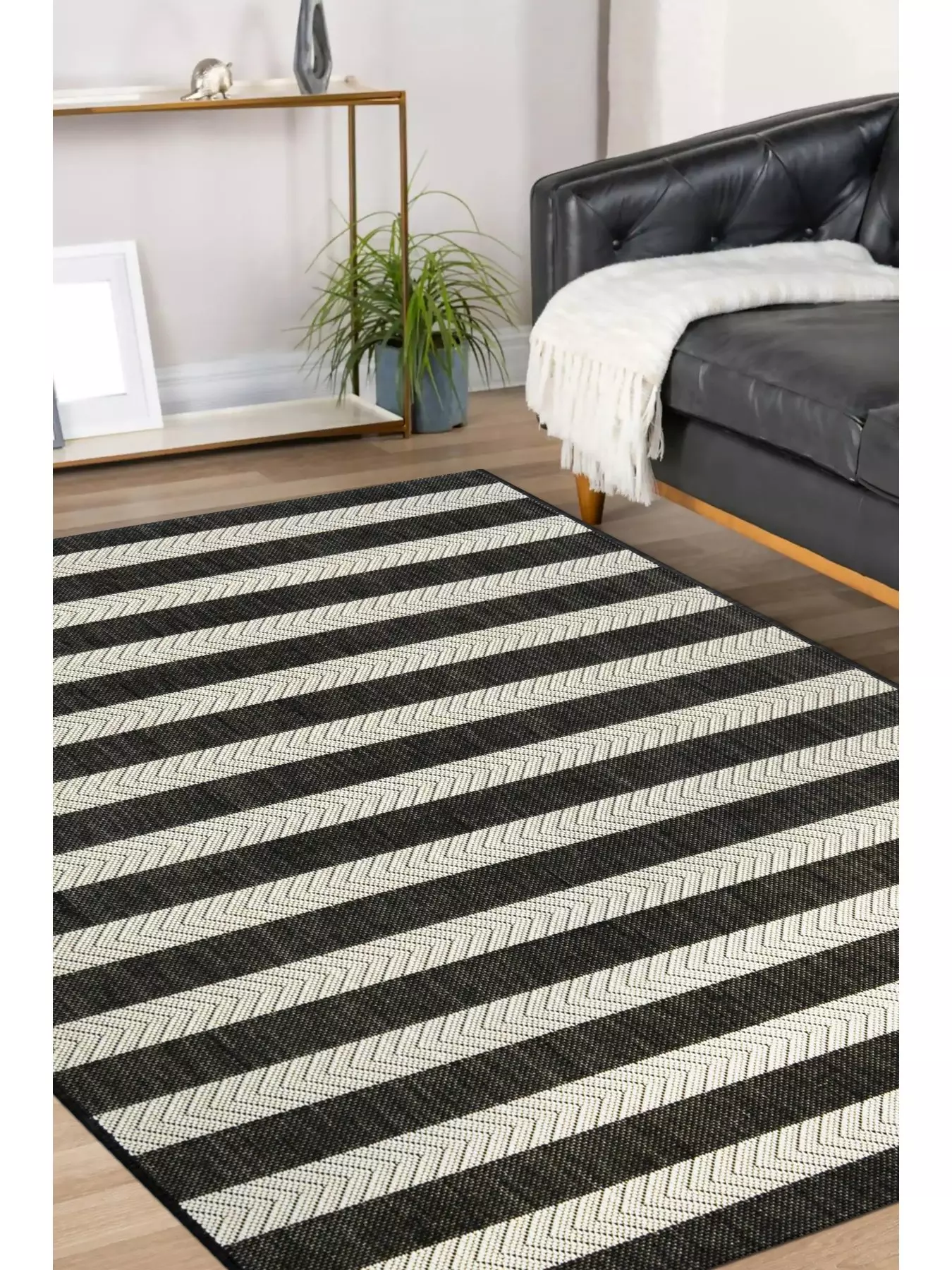 Whether creating comfort in the garden or bringing added durability to your floors indoors, our Bosa flatweave rug is a practical yet stylish addition to the space of your choice.In a black and natural palette, it showcases a combination of horizontal stripes and chevron texturing. The low pile is hard-wearing and designed with durability in mind, so whether it’s in a high-traffic area like your kitchen or a suntrap patio in the garden, you’ll have no trouble keeping it looking its best. Easy-care properties mean it just needs a quick surface shampoo from time to time, and UV protection helps to reduce the chances of it bleaching if you leave it out in the sun.